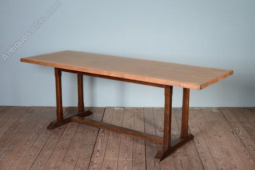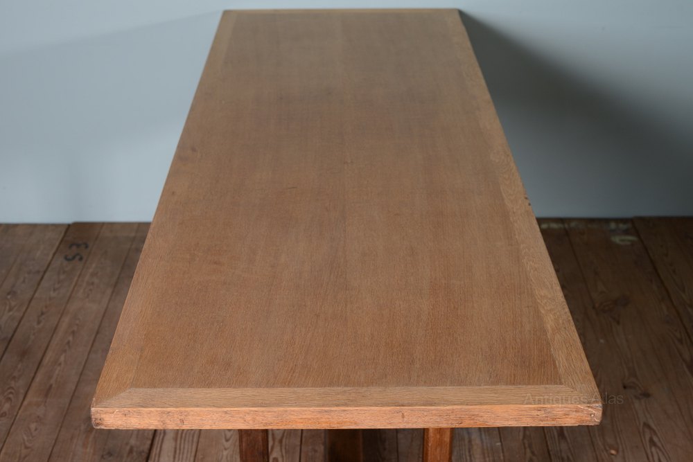 The oblong oak top has a scrubbed finish with the table base being in the original finish.