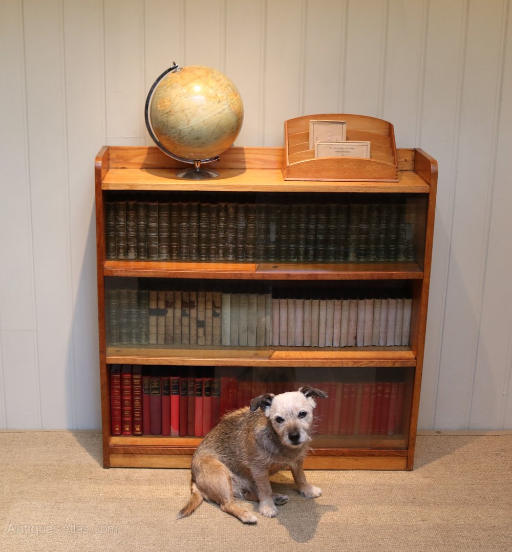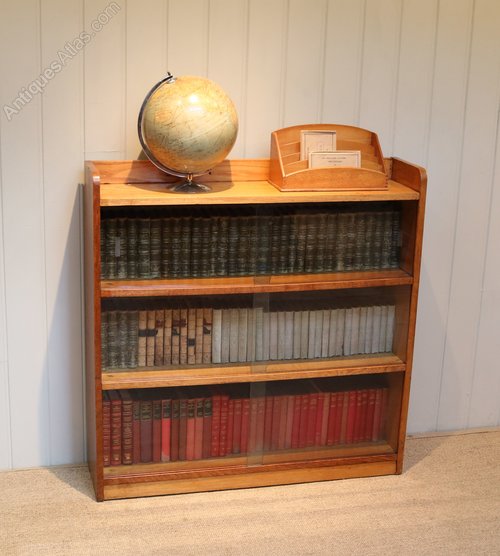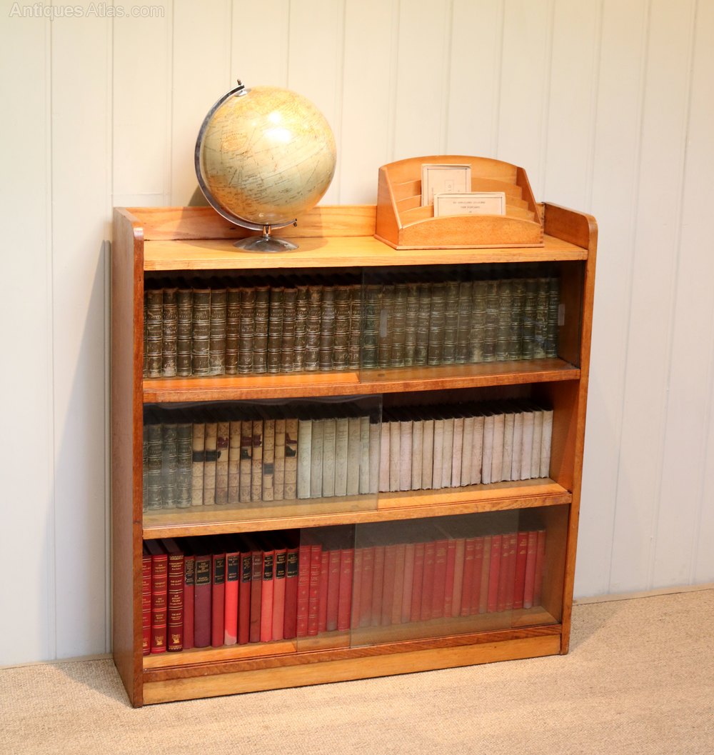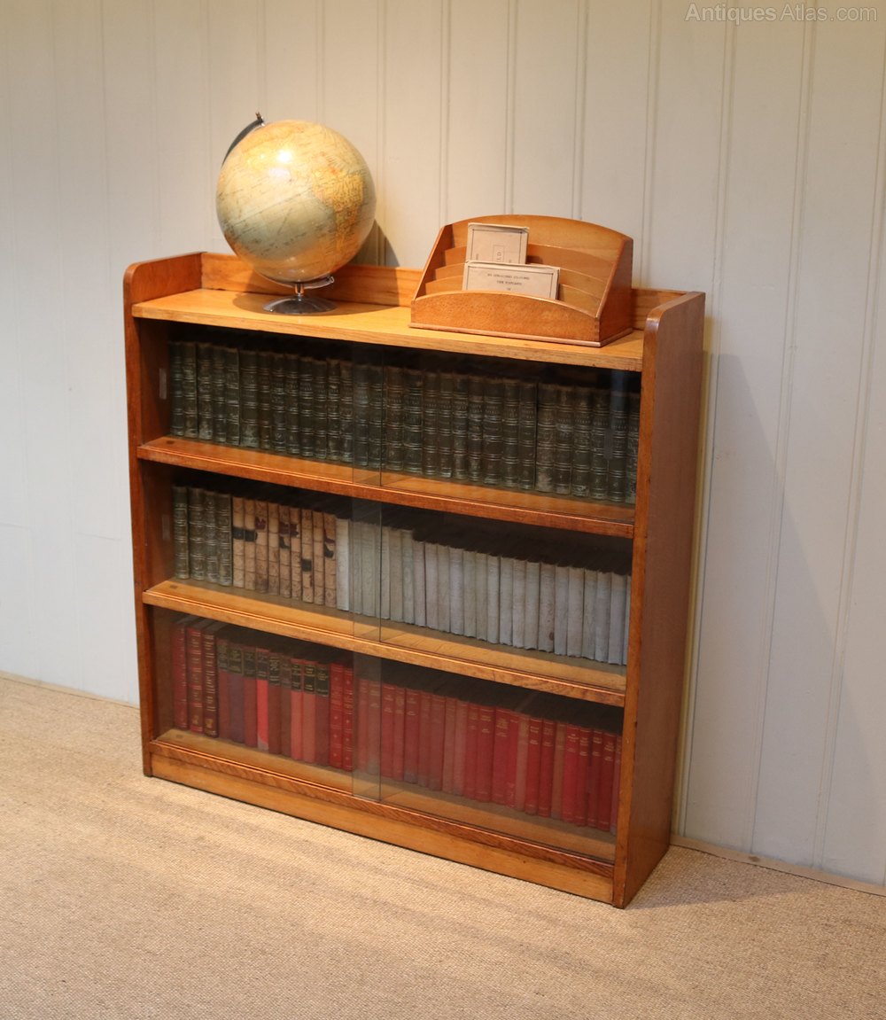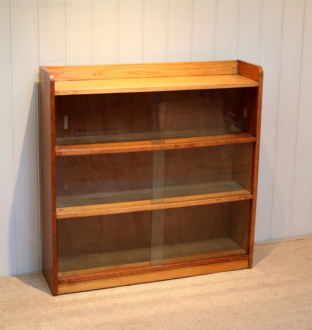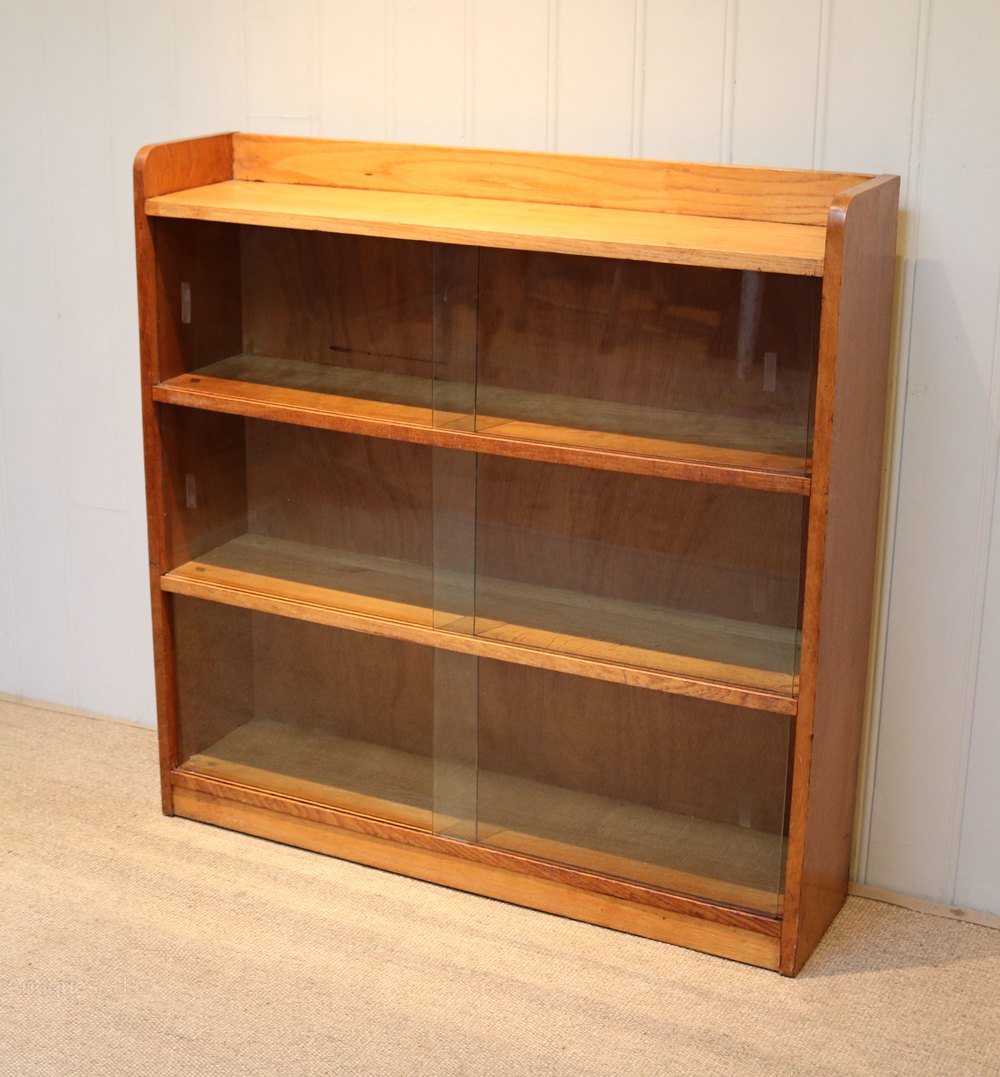 Mid century oak bookcase having three tiers with sliding glass doors. The shelf depth is 19cms rising from 25cms, 23cms and finally 22cms.