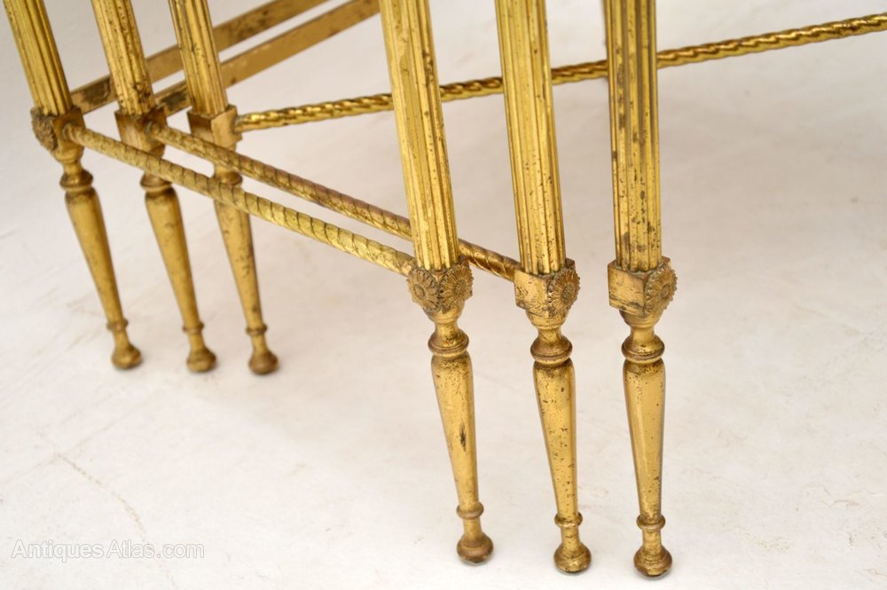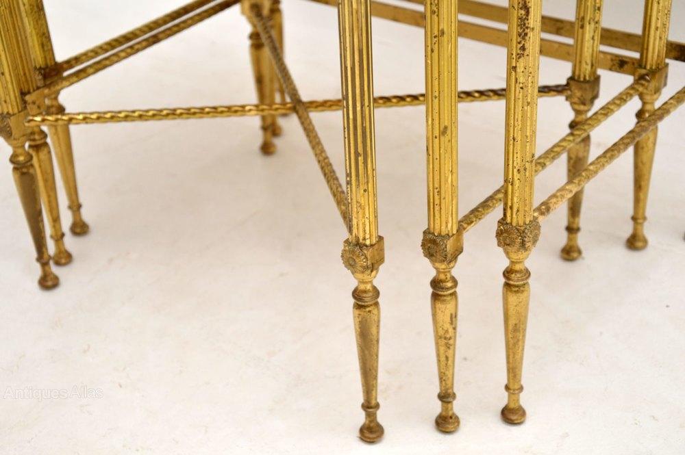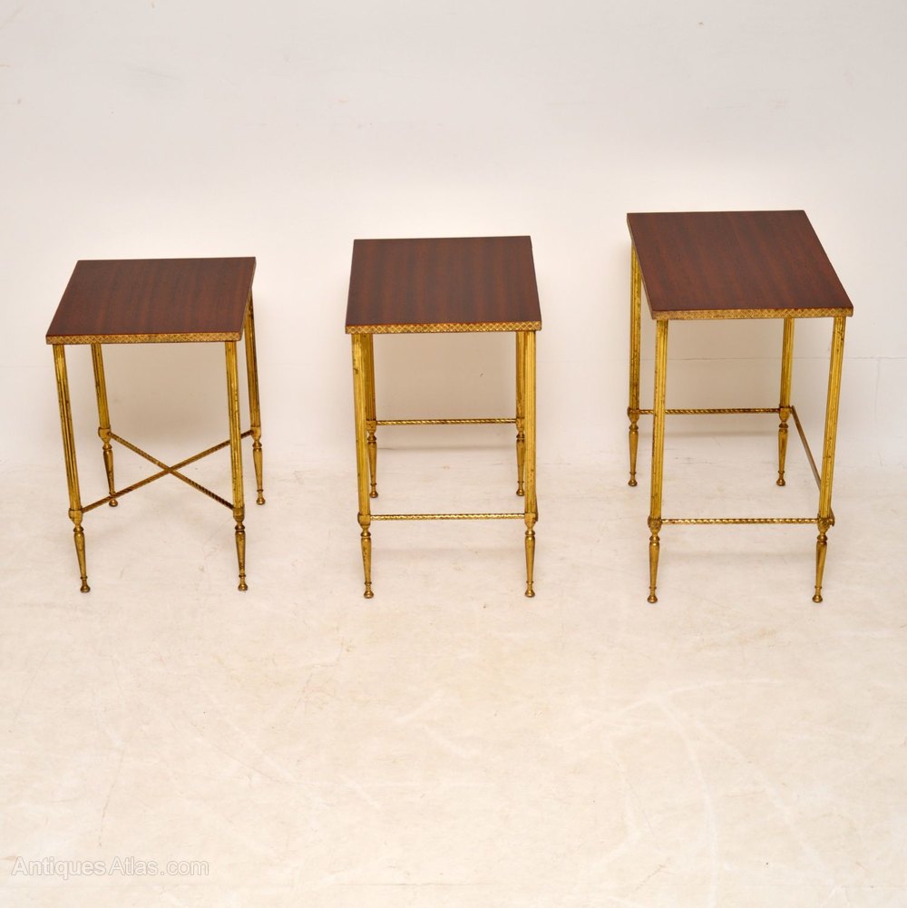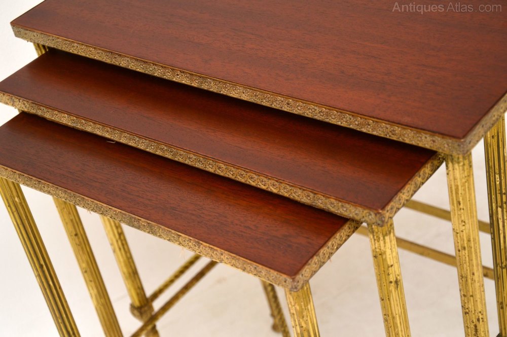 A beautiful vintage nest of antique tables with brass frames and mahogany tops, these date from the 1950-60’s. They were most likely made in France or Italy. They in great vintage condition, the brass frames are sturdy and sound, with normal wear and tarnishing for their age, The mahogany tops have been stripped and re-polished to a very high standard.