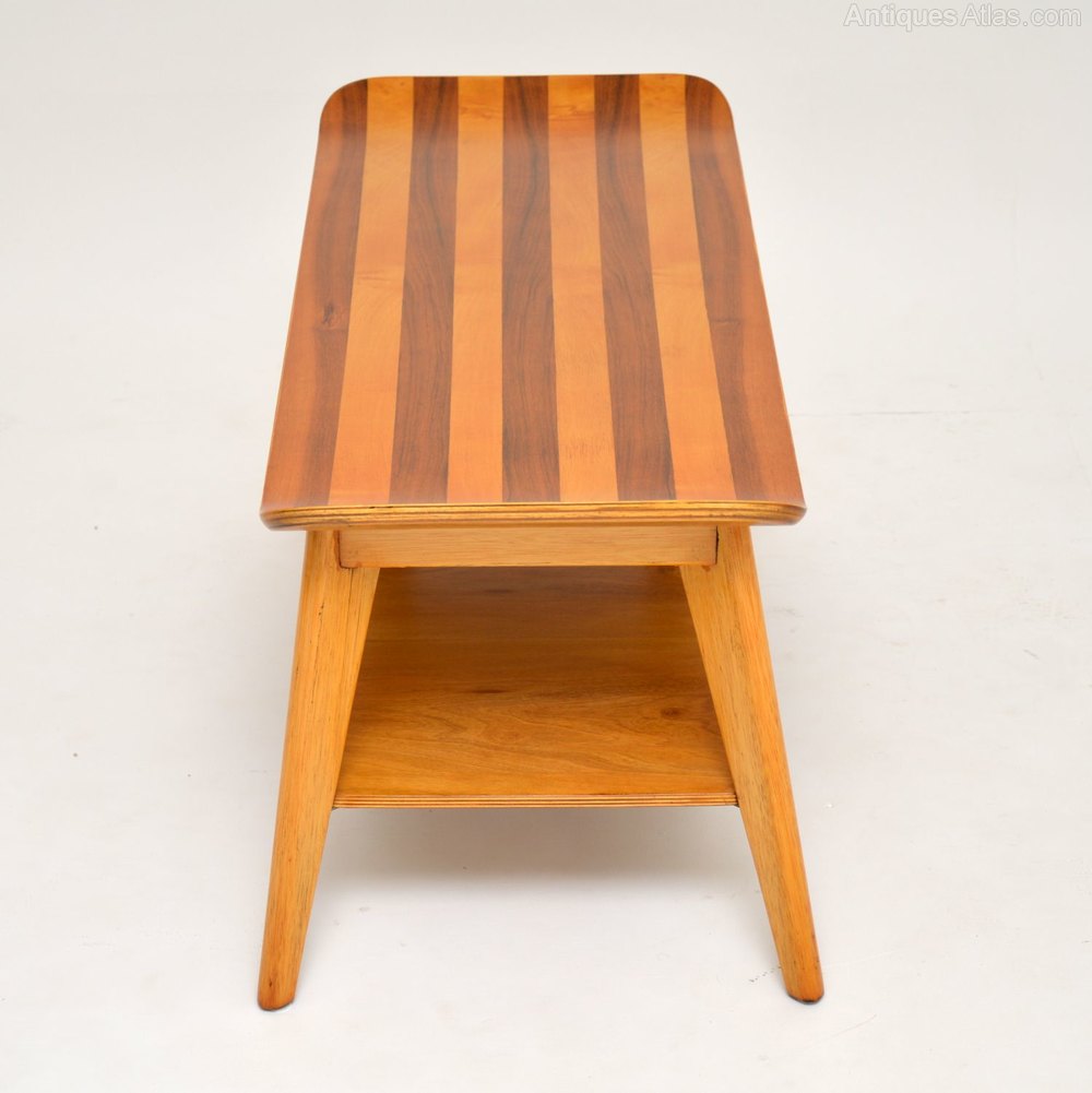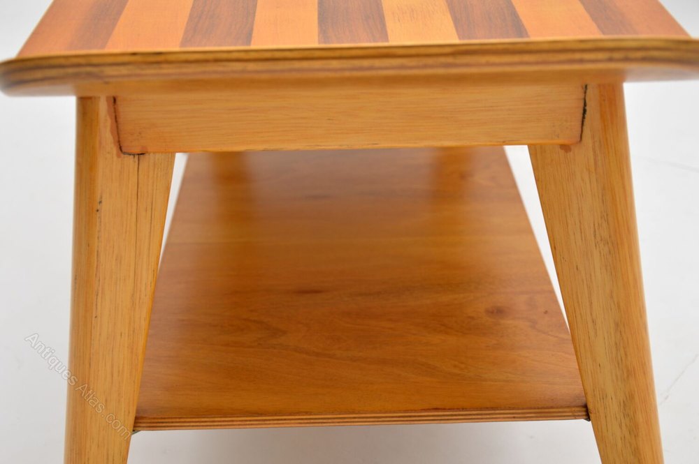 A smart and stylish vintage coffee table with a gondola shaped design. This is made from a combination of woods. It has a walnut and satin wood top, sitting on a solid beech base. This is a beautiful and practical design, with a useful lower tier for extra storage. We have had this stripped and polished to a very high standard, the condition is superb throughout.