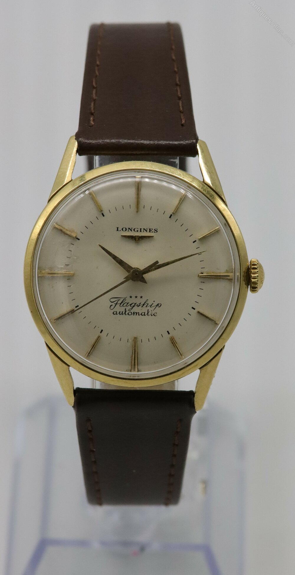 A 1959 Longines Flagship 'Big Ship' 18K gold wristwatch. A matte white dial with elongated hour markers, slightly larger at the quarters. An inner printed minute track with segmented 5 minute markers. An applied gilt Longines winged hourglass logo below 12, with printed script above. Signed to the lower section ''Flagship Automatic' with 3 stars.