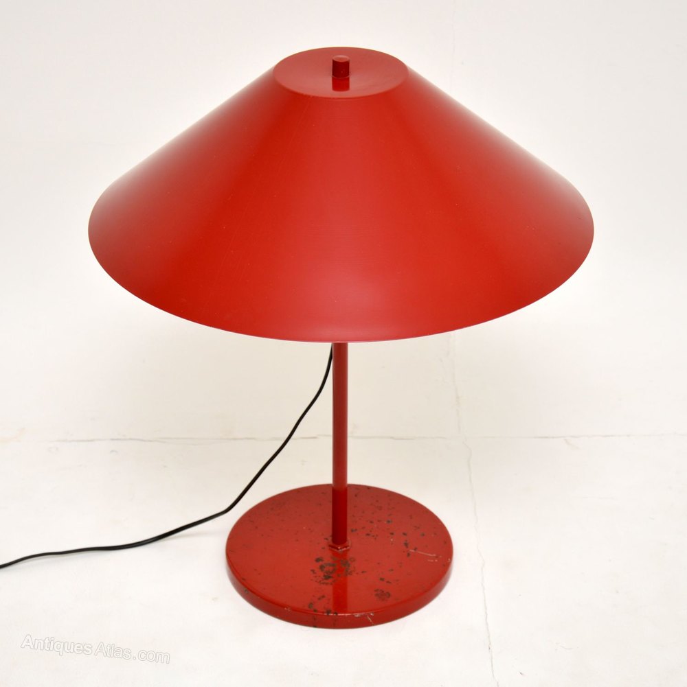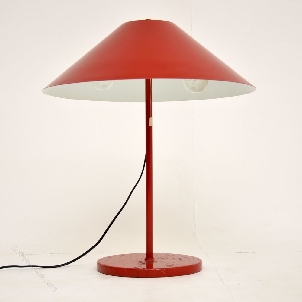 This has the beautiful original shade built in, the red lacquered paint is in good condition on most of the lamp, though on the base it does show signs of wear as seen.