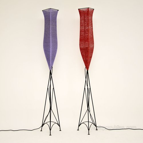 This is a very unusual and stylish pair of vintage floor lamps, dating from around the 1960’s. They are made with black painted steel frames, and shades that have been spun from a tough and colourful material. The result is very striking and beautiful. These are in good vintage condition and have been re-wired they are in good working order.