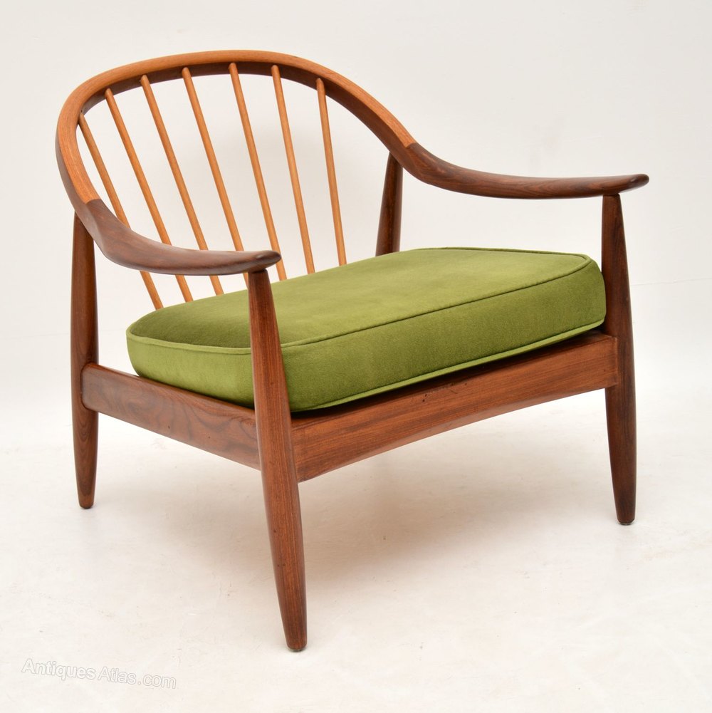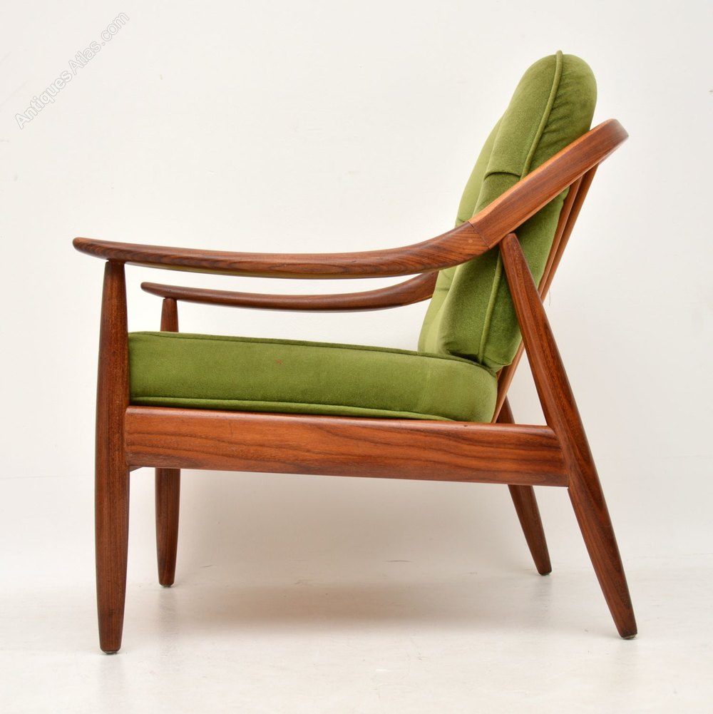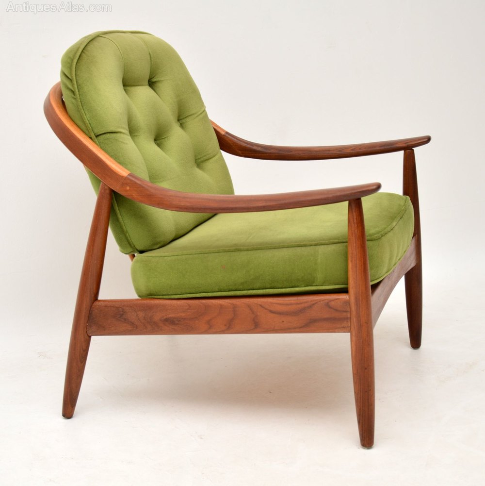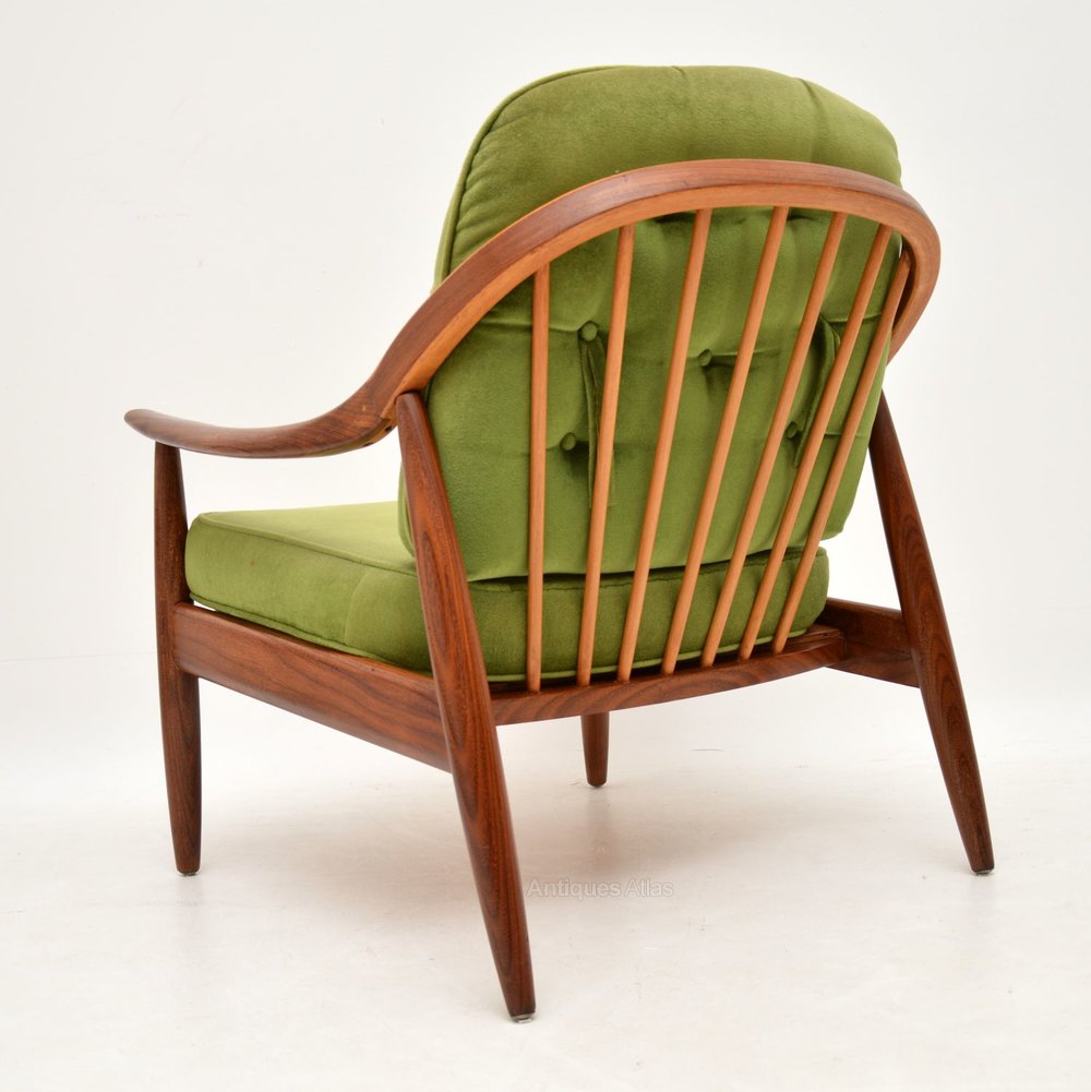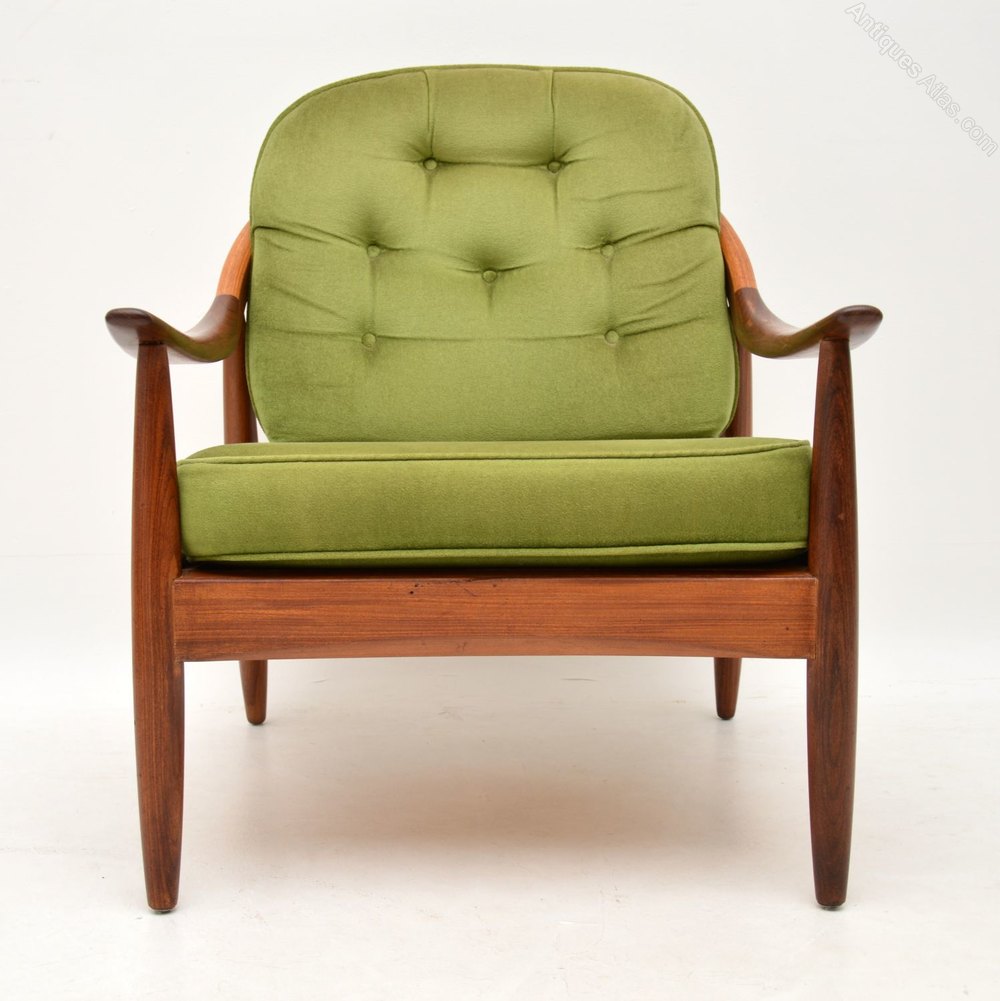 A beautiful vintage armchair in solid afromosia, this was made by Greaves & Thomas, it dates from the 1960’s. The condition is great for its age, the frame is very clean, sturdy and sound, we have given it a clean and fresh coat of oil. At some stage the previous owner has replaced the web base with a ply board, seen in the images. The cushions were also recently upholstered by the previous owner, they are in very good condition with some extremely minor wear and very slight darkening on the top edge, nothing very noticeable at all.