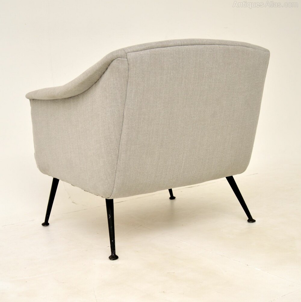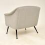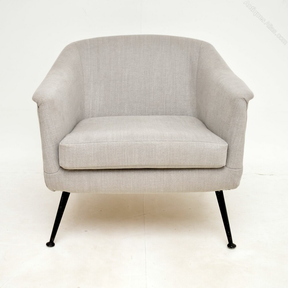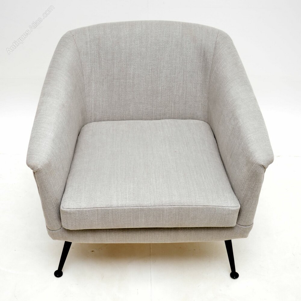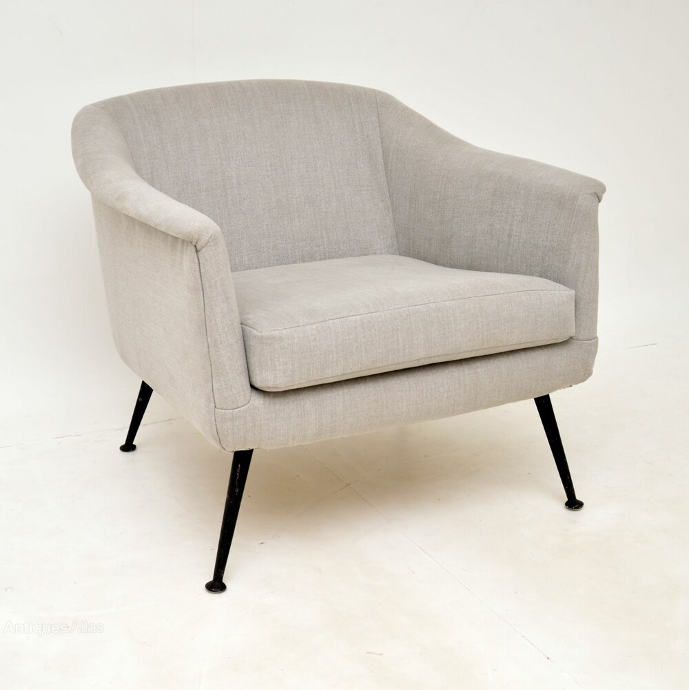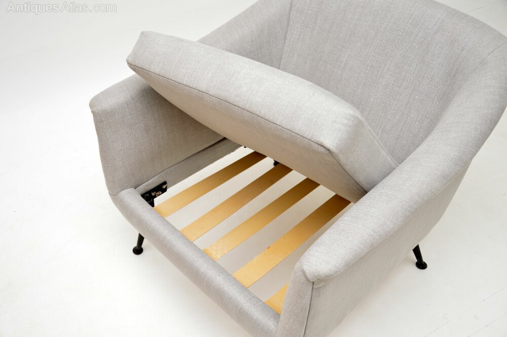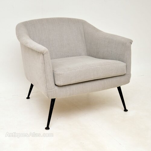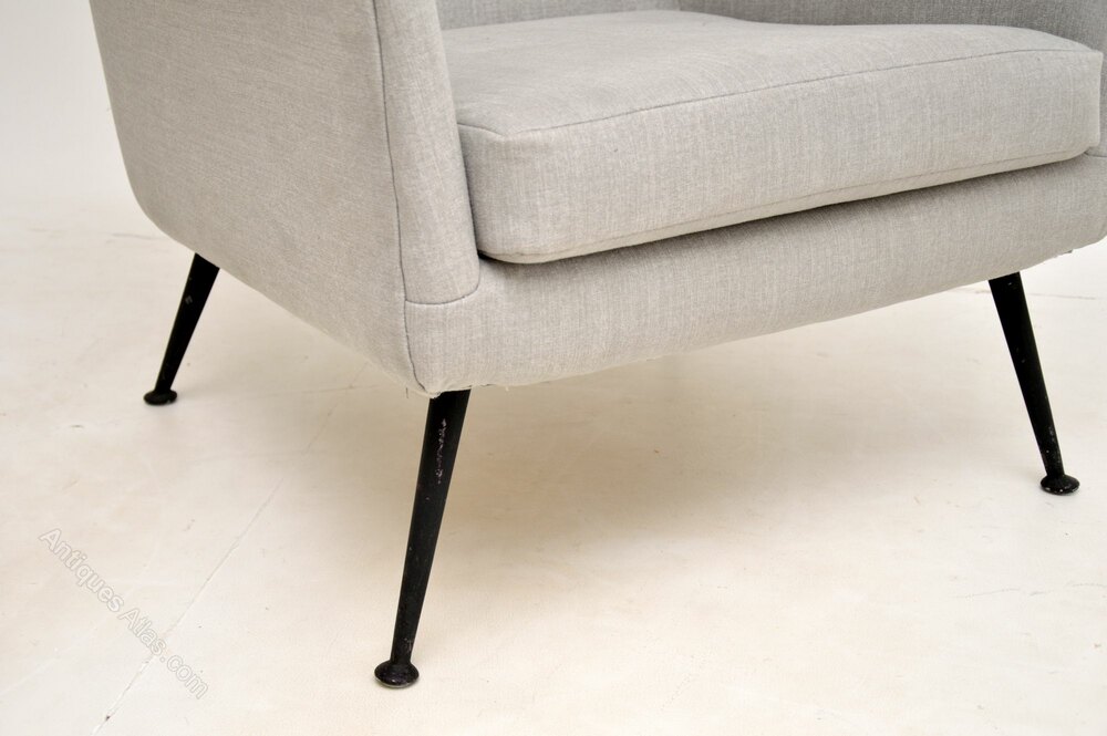 We have had this completely re-upholstered in a top quality grey cotton fabric, the condition is excellent for its age. The Pirelli webbing beneath the seat is strong and in very good order, there is just some minor surface wear to the black finish on the metal legs.