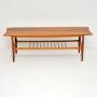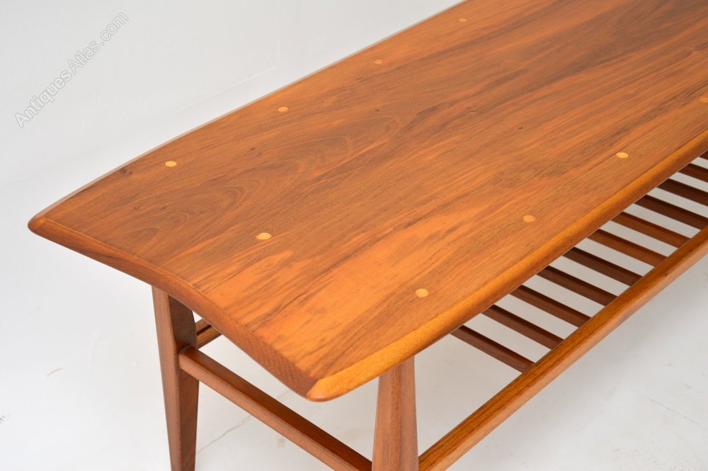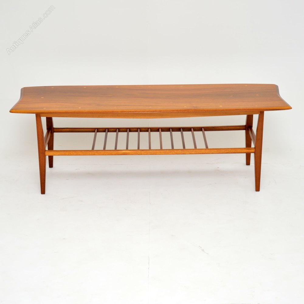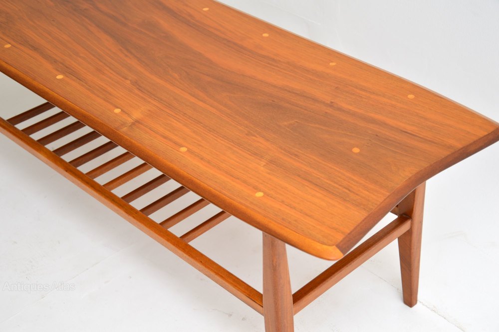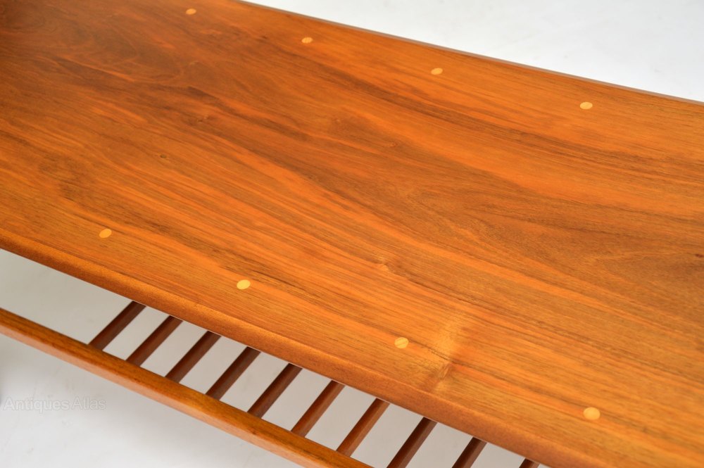 A beautifully styled and very well made coffee table in Walnut. This dates from the 1960’s, it was made in Britain. The walnut top has small inlaid circles of a lighter wood, possibly satin wood. This also has a useful lower tier. We have had this stripped and re-polished to a very high standard, the condition is excellent throughout.