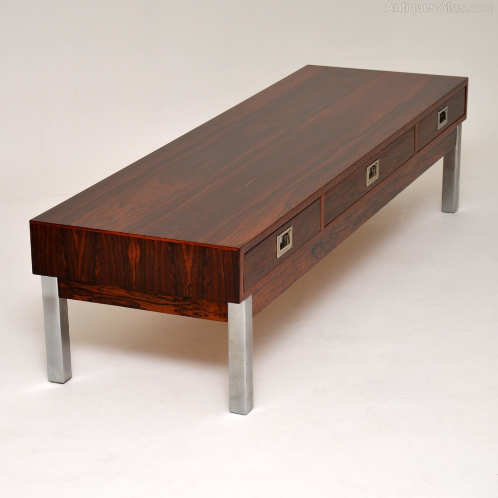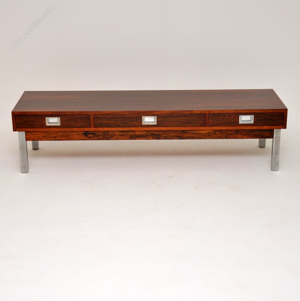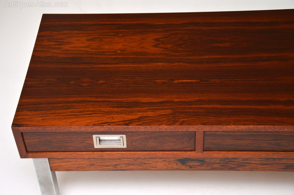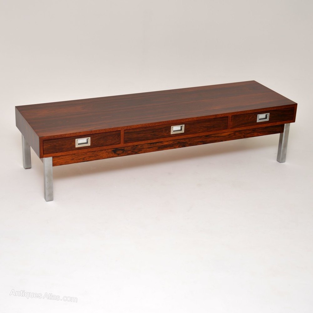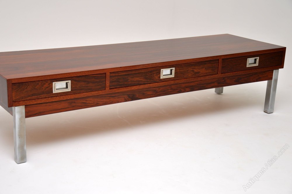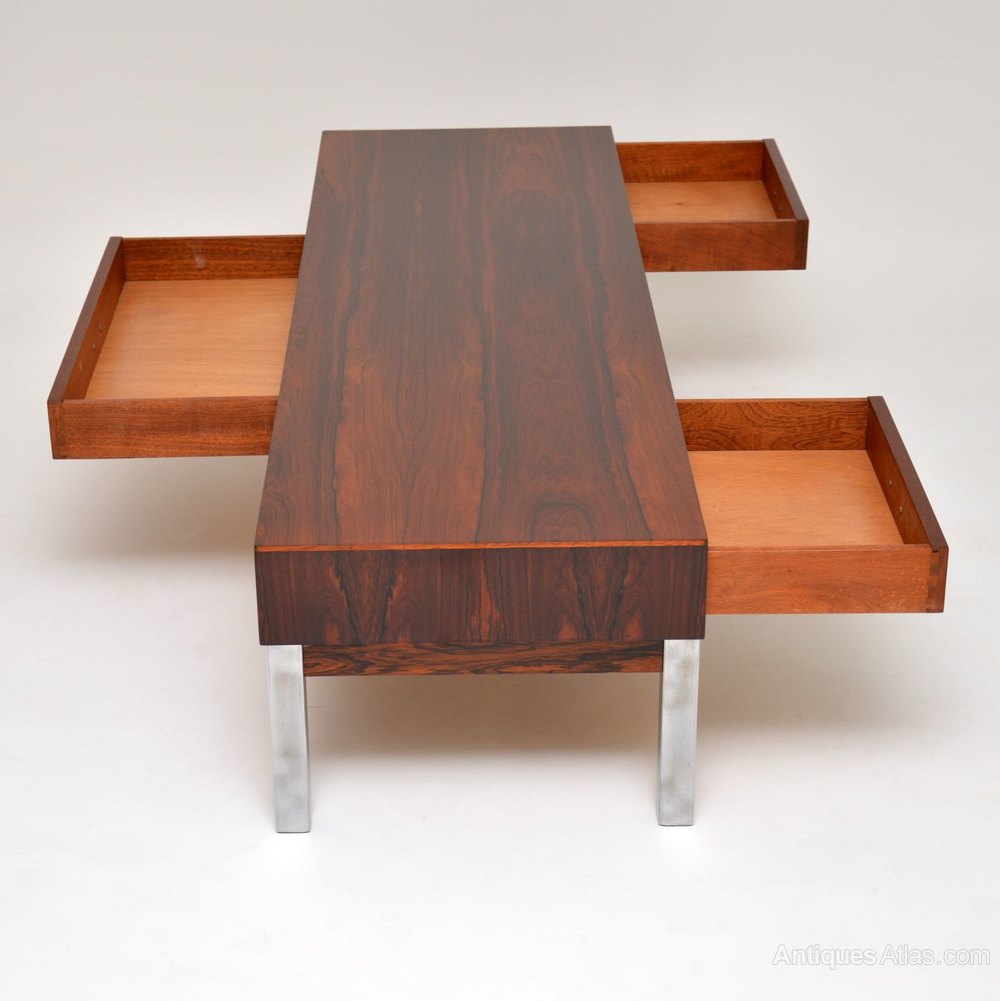 A stunning and very well made vintage coffee table in rosewood with brushed steel handles and legs, this dates from the 1960’s. It has a lovely design, with three double sided drawers that open on both sides of the table, the table is finished identically front and back. We have had this stripped and re-polished to a very high standard, the condition is superb throughout.