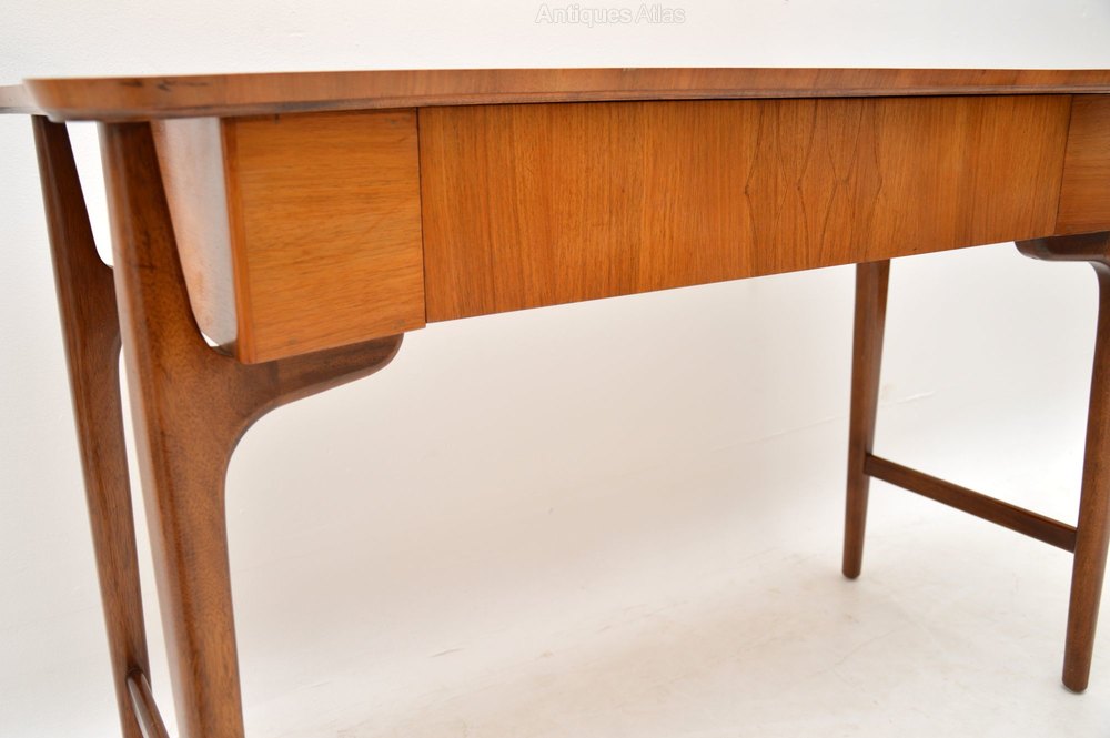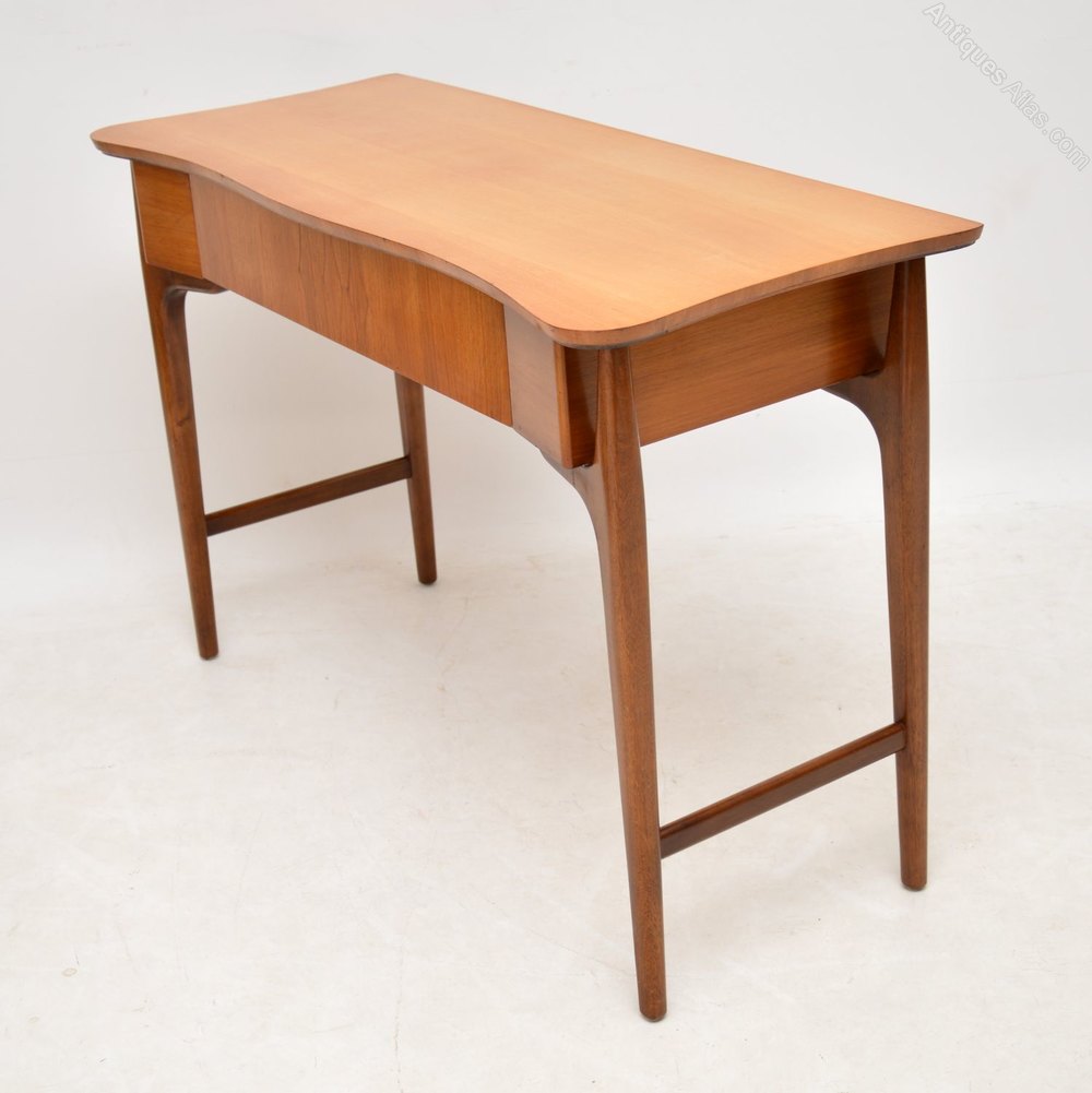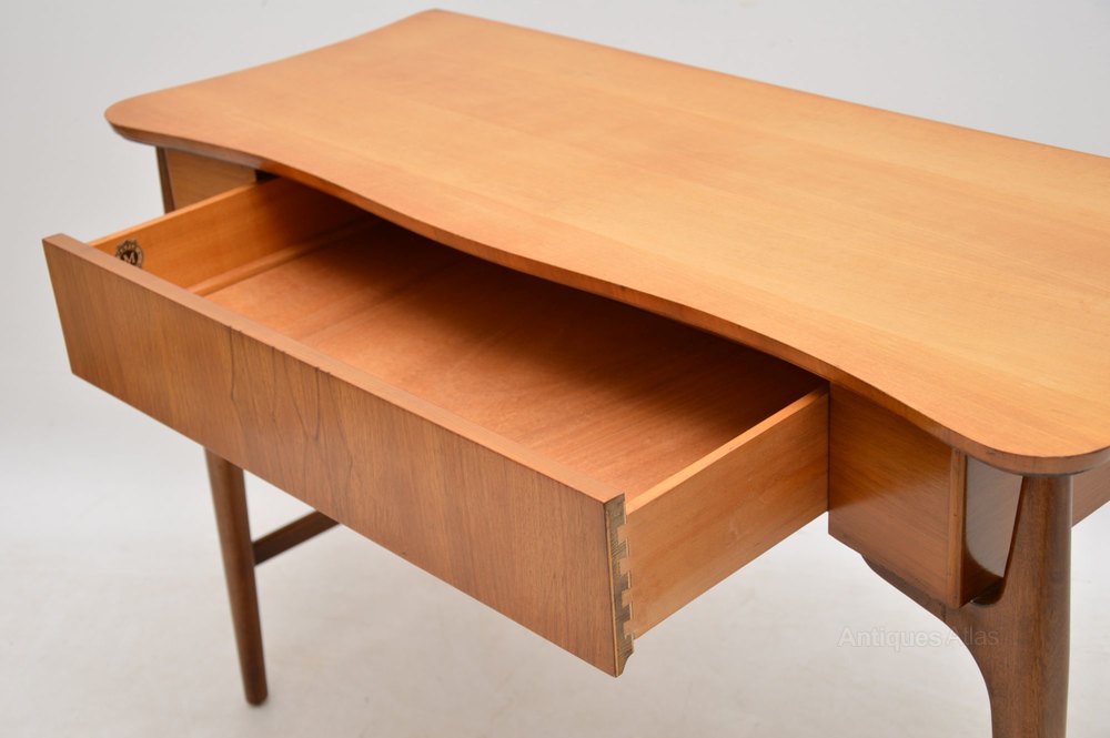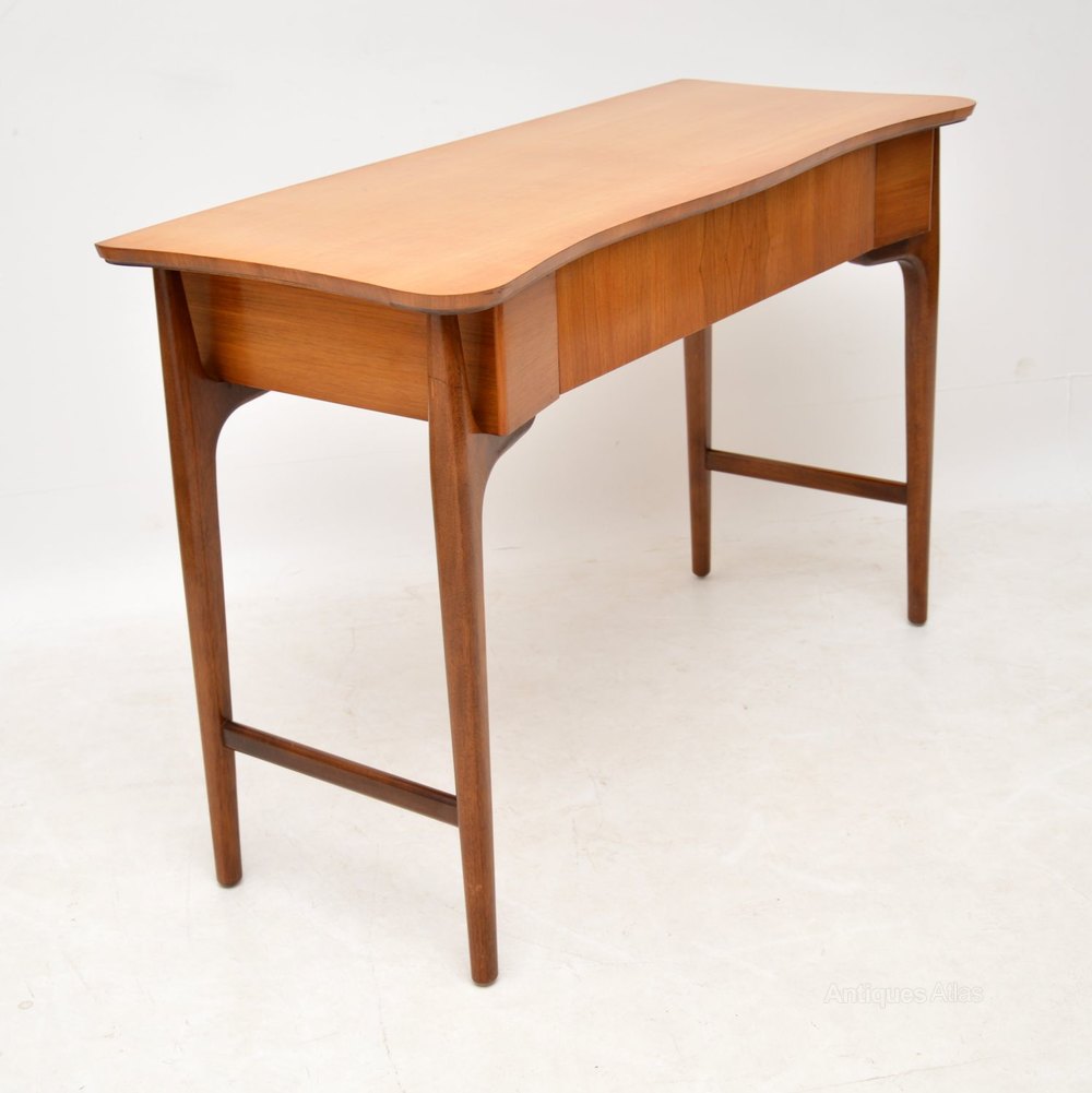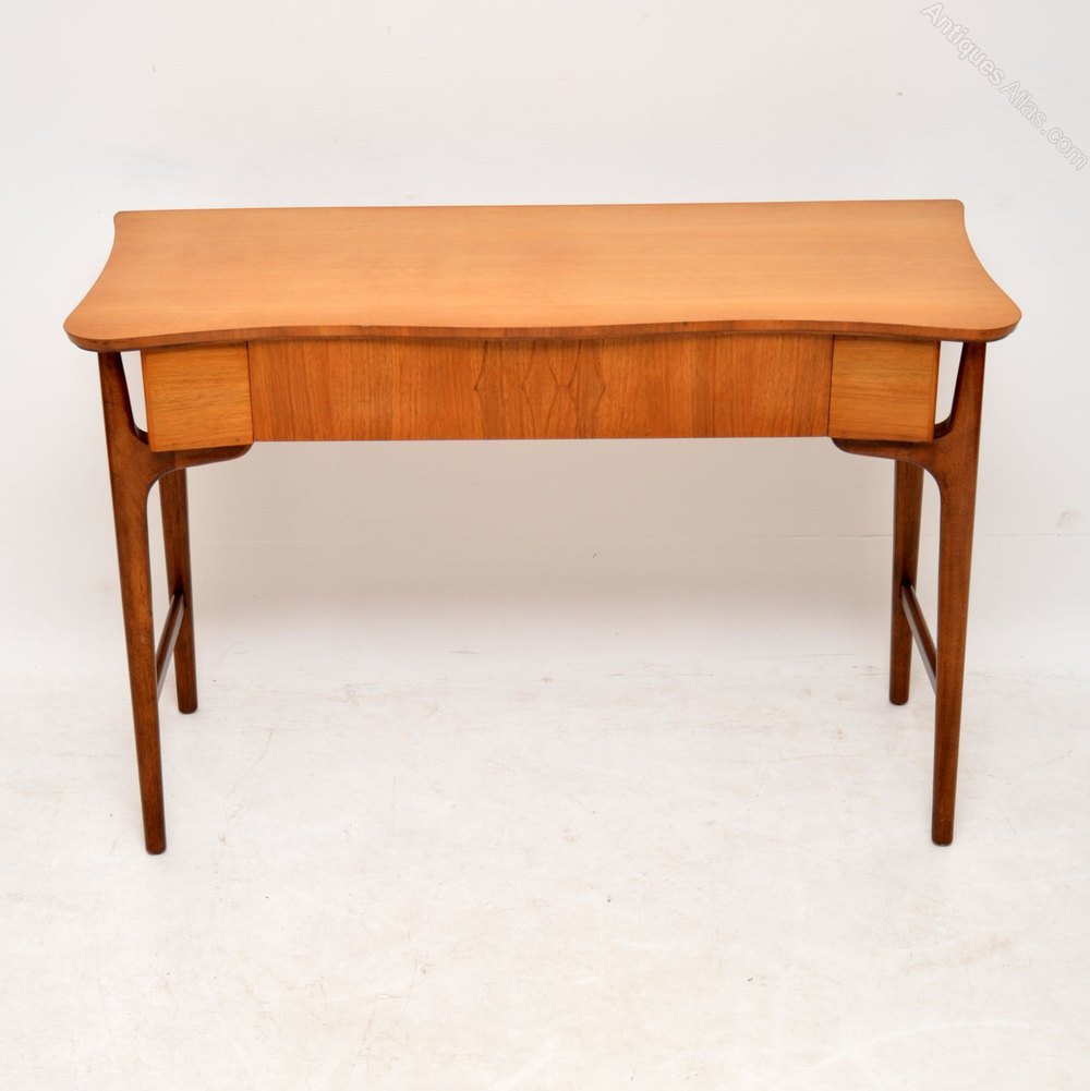 A stylish and unusual vintage table in satin wood and walnut, this is a good size to be used as a desk or a console table. It dates from the 1960’s, and is in great condition for its age, with only some very minor wear here and there. The legs and sides are walnut, the top looks like satin wood. There is a single drawer, with a Maple quality label inside, Maple’s were the retailers in the 1960’s.