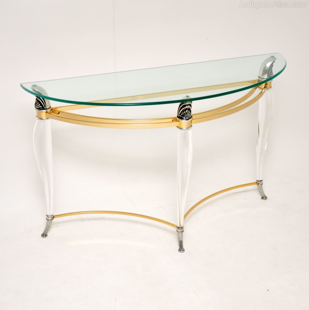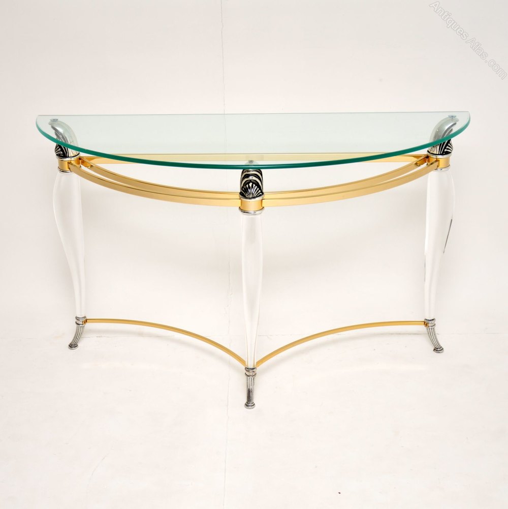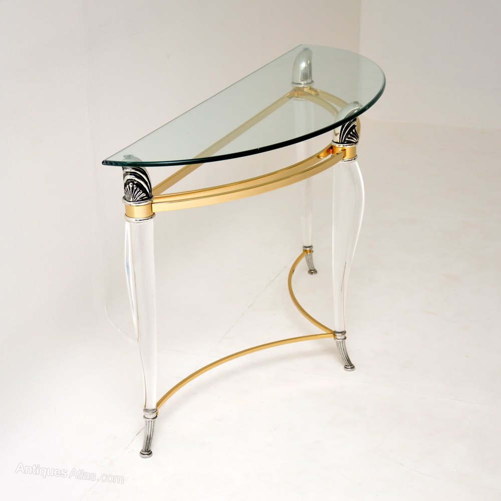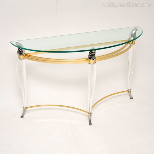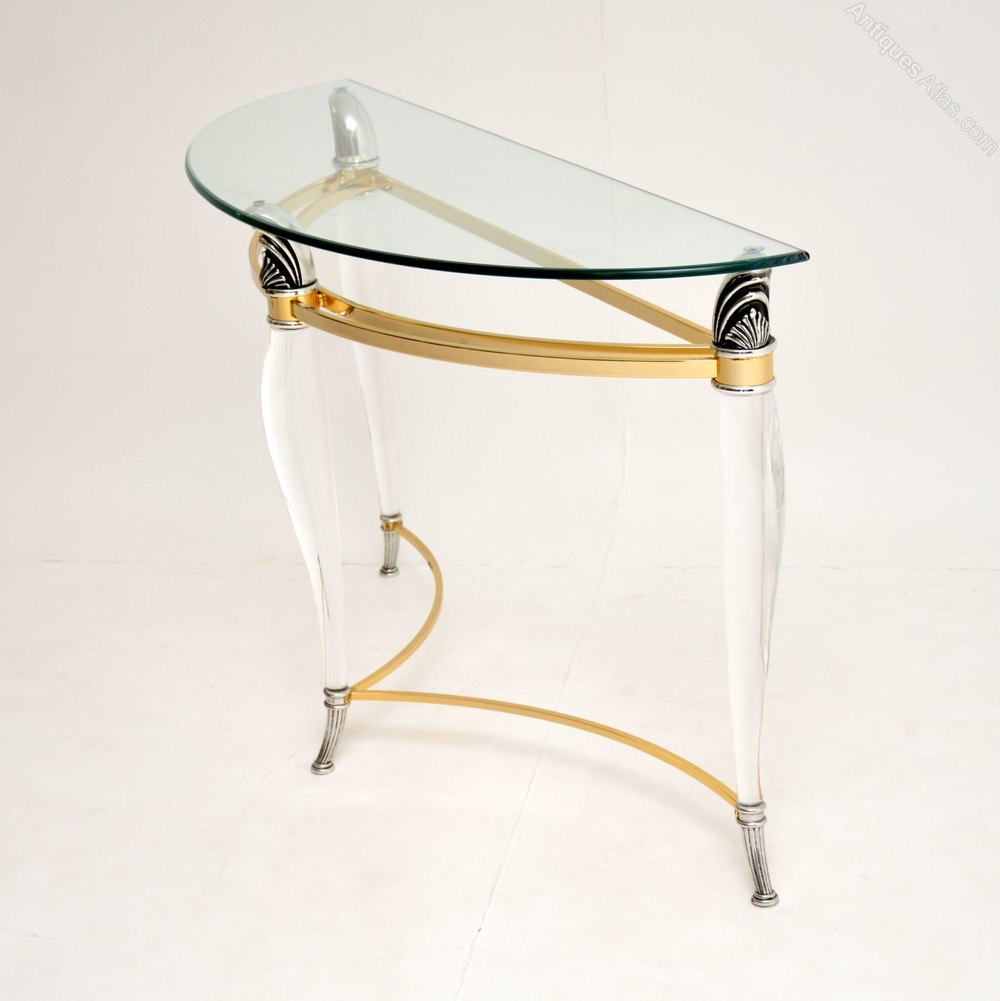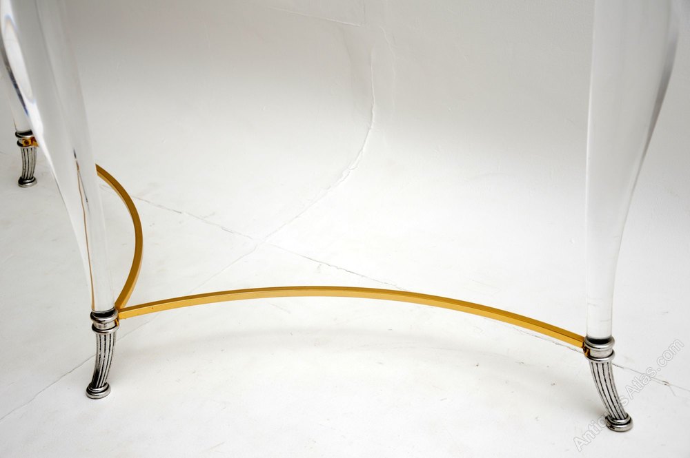 It is made from an interesting combination of materials, with thick clear acrylic legs, steel feet and knees, brass plated aluminium supports and a think bevelled glass top.