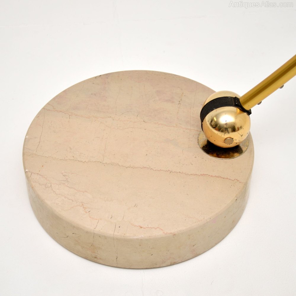 It has an extendable neck and when fully extended has a very impressive arc. It can be adjusted to various positions, it swivel on the solid marble base and can be tilted to different angles. The shade is made from white acrylic, which contrasts beautifully with the brass coloured finish.