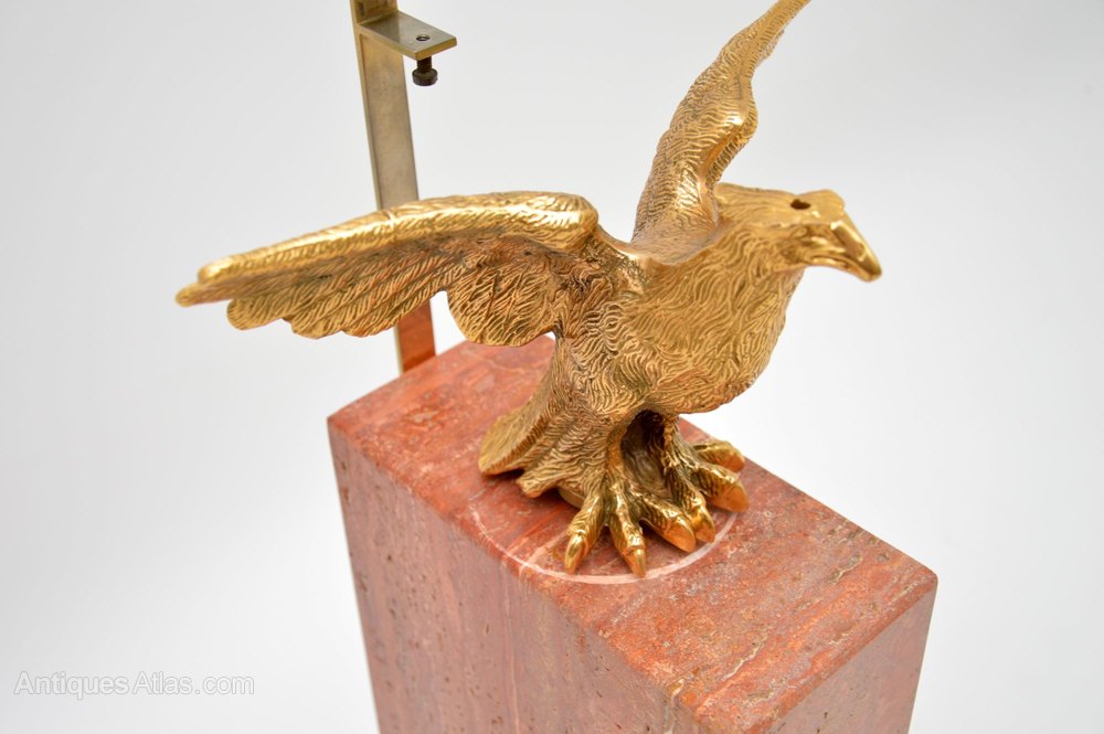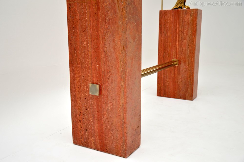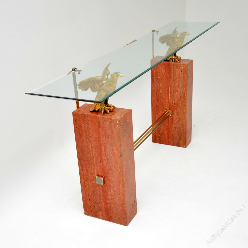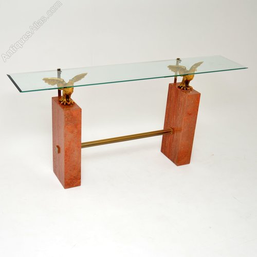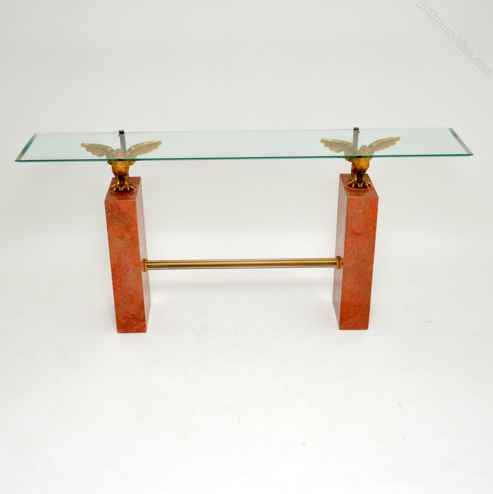 A stunning vintage console table, comprised of two solid marble pedestals, with brass fixtures and a bevelled glass top. The top is supported by solid brass eagles, this piece of antique furniture is superb quality all round. The condition is excellent for its age, with only some extremely minor wear here and there. This dates from around the 1970’s.
