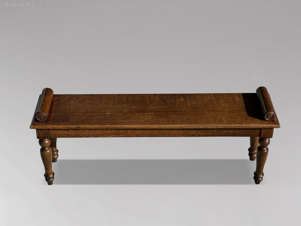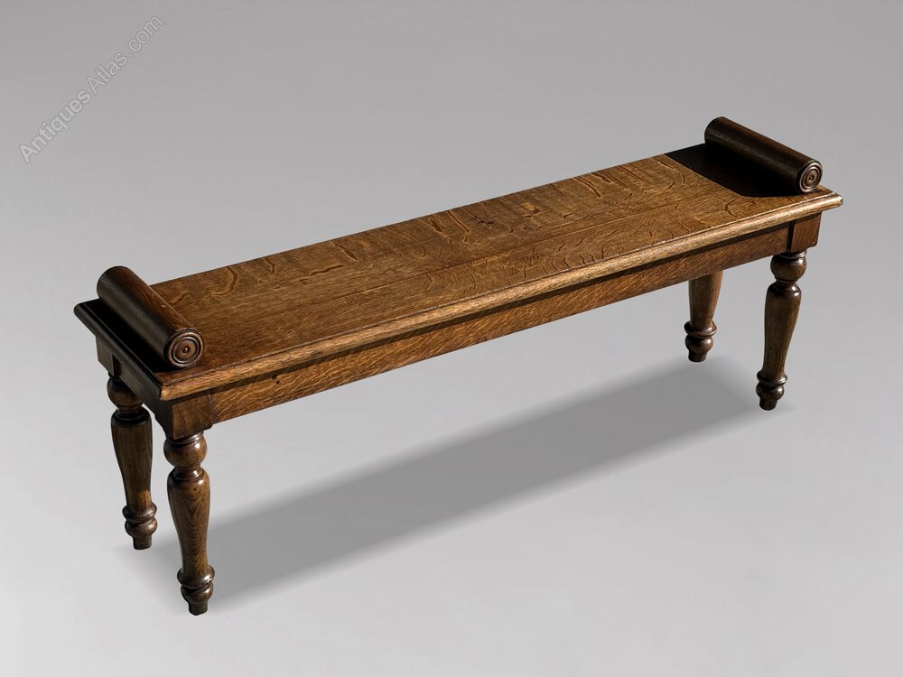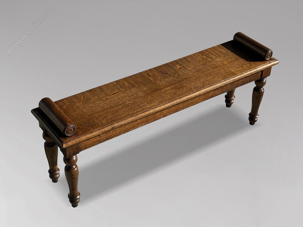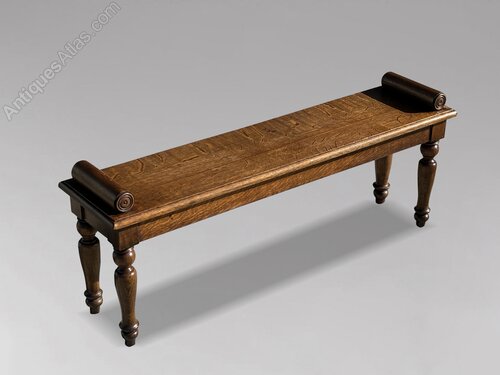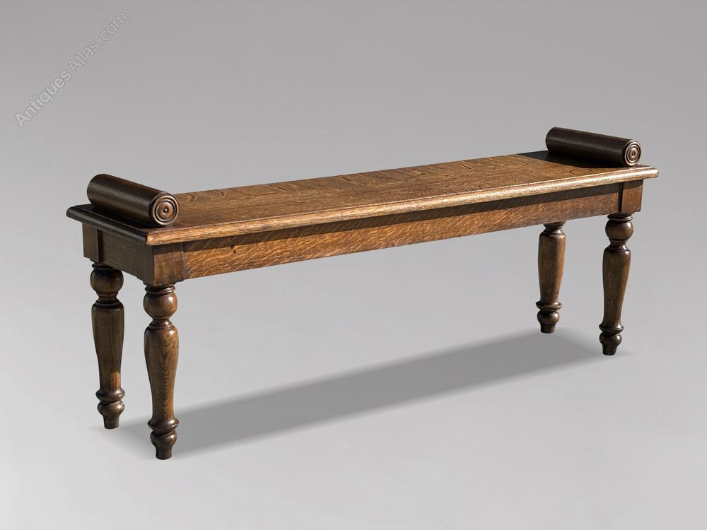 This lovely 19th-century oak hall bench or window seat offers both practicality and charm. Crafted around 1840, this solid oak seat features turned bolster ends and a solid moulded top, supported by turned baluster legs. The rich colour and patina of the oak are beautifully preserved, showcasing the quality of the materials and craftsmanship. Its simple yet elegant design makes it a versatile piece suitable for a variety of settings.