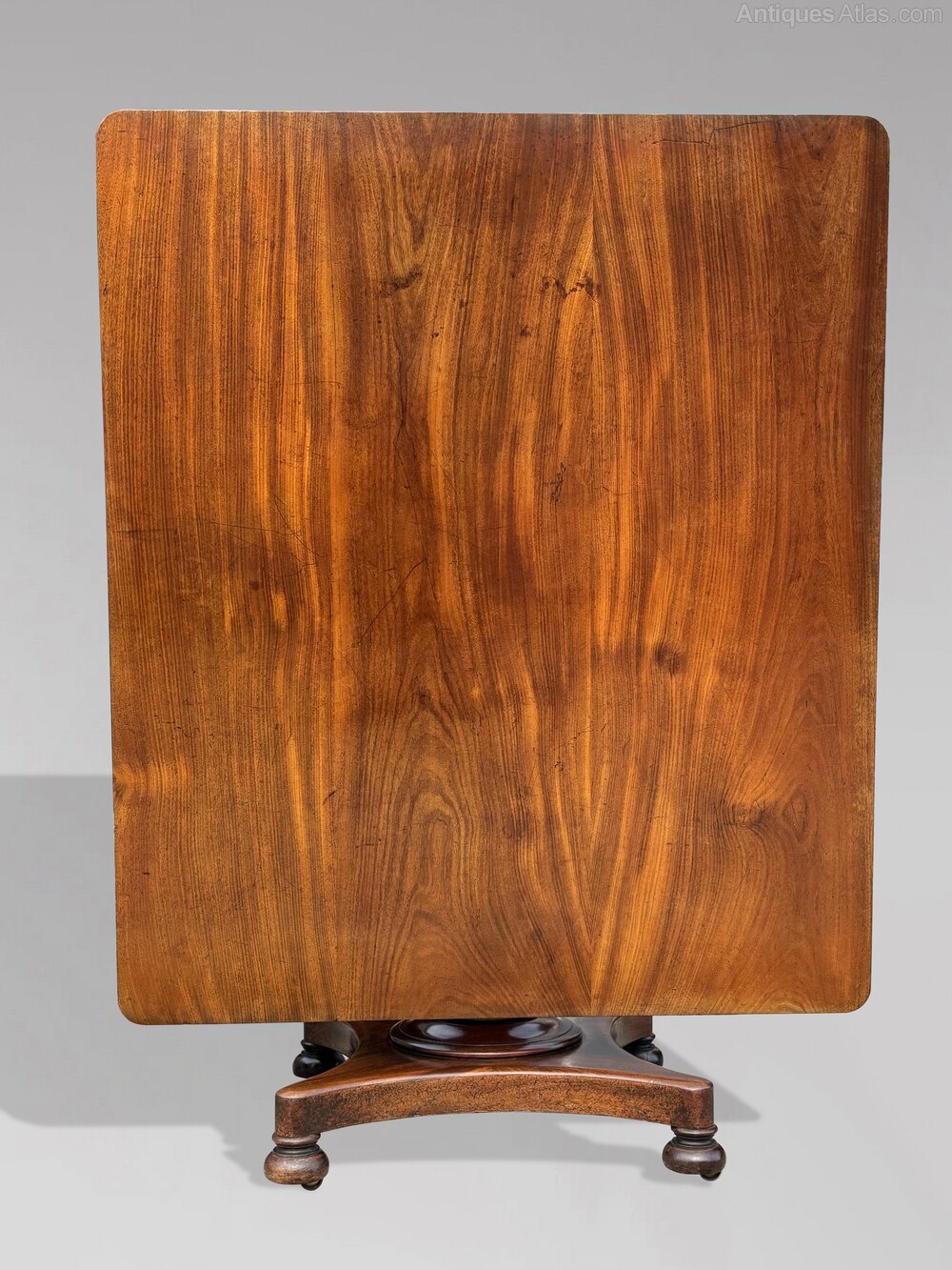 A superb and highly impressive 19th-century William IV period double pedestal mahogany dining table, dating to around 1835, this exceptional piece features a pair of substantial rectangular tilt-top centre tables. Each table is crafted from richly figured, solid mahogany with a beveled edge, showcasing the deep colour and striking grain characteristic of top-quality William IV mahogany. The rectangular tilt-tops rest on hand-turned pedestal bases with bulbous turnings and carved decoration, each supported by a quadraform platform and bun feet with concealed brass castors.