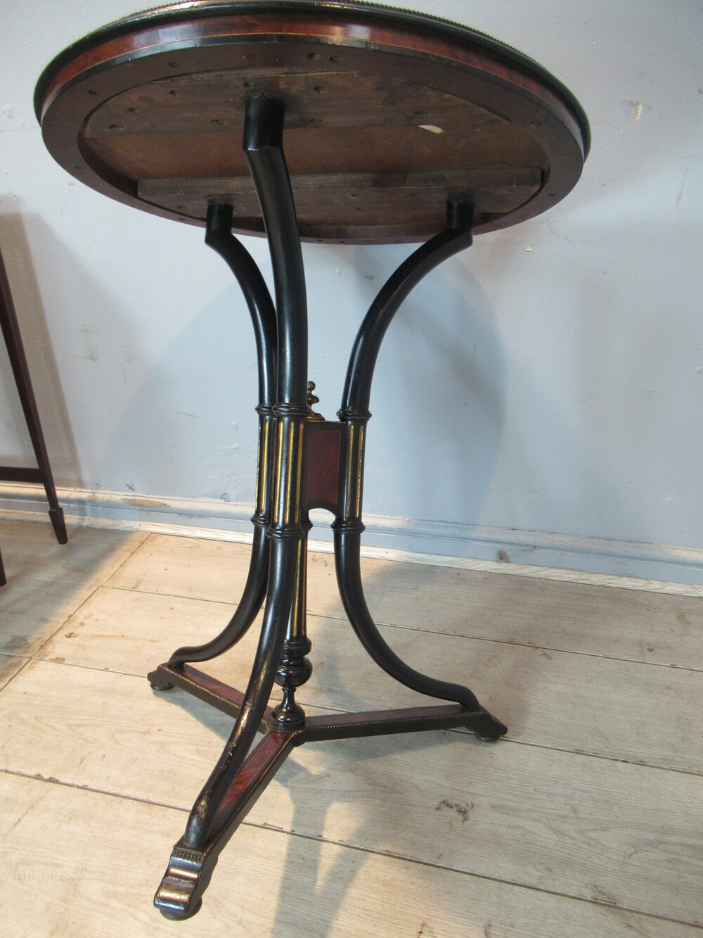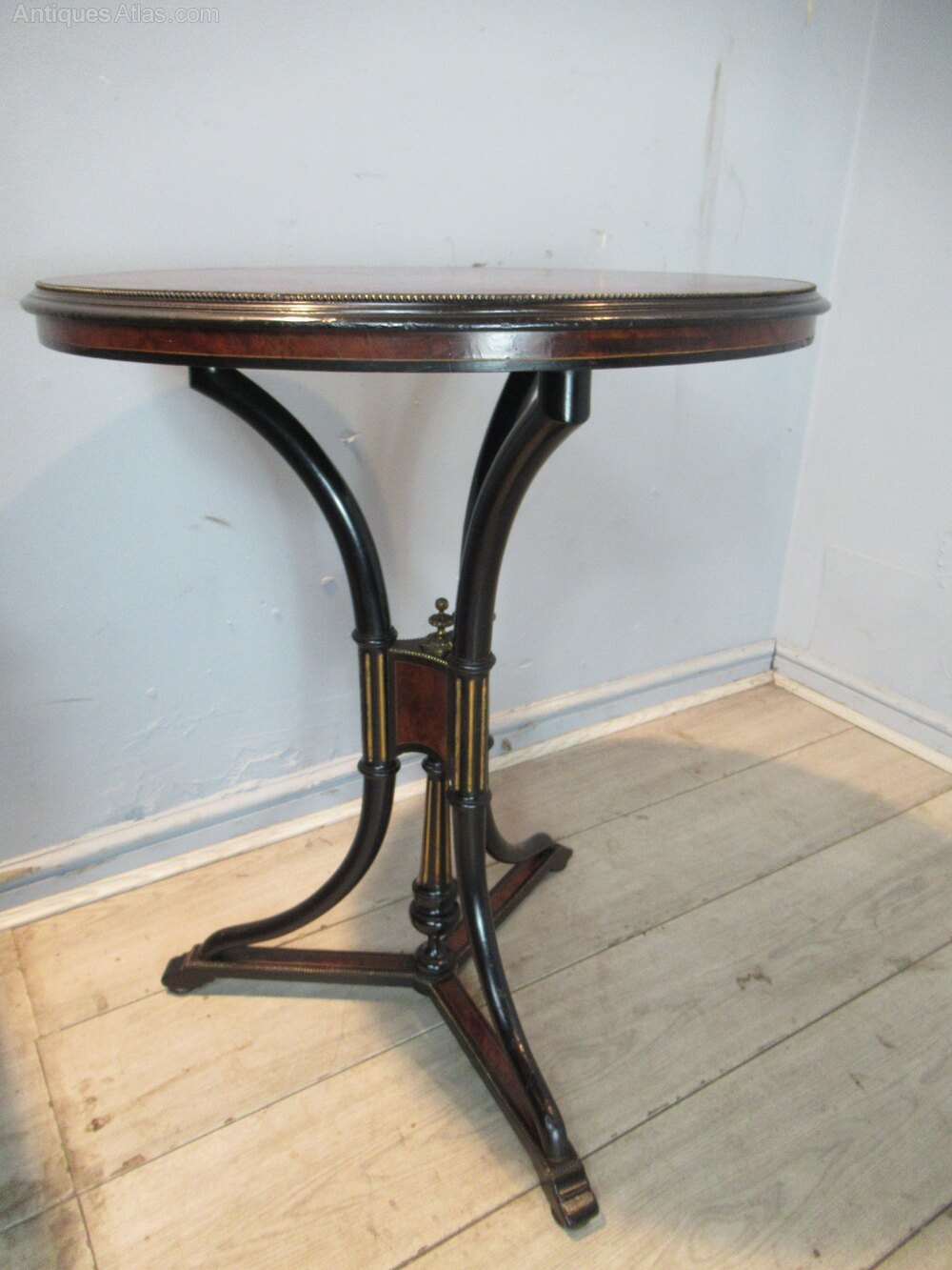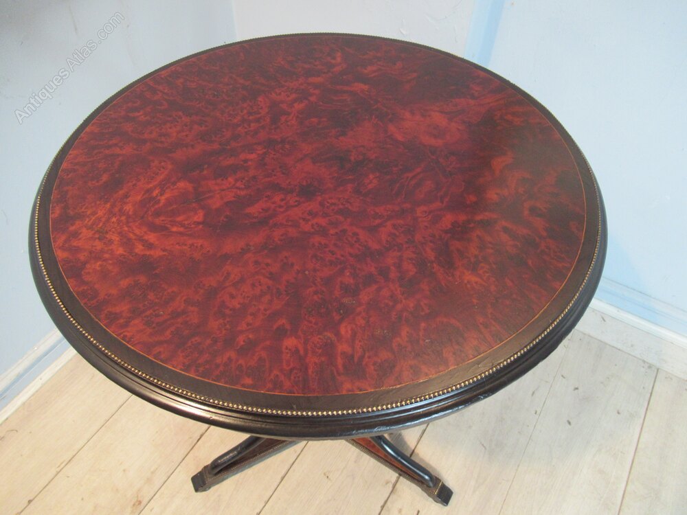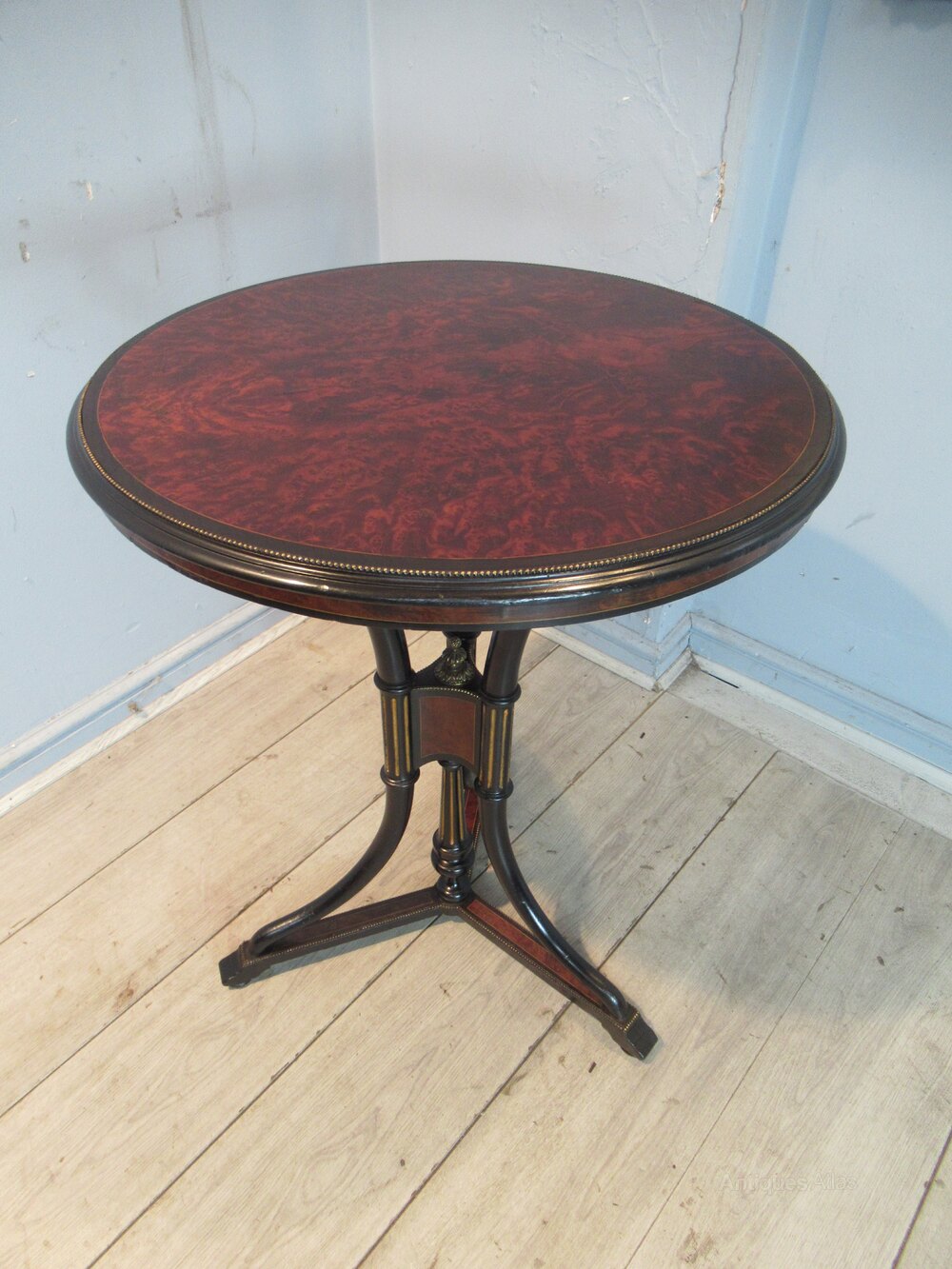 19th century circular Thuya wood table , the top with a burr wood , and with a brass edging . The table has three ebonised shaped supports with gilt inlay and a brass finial, with a platform base,
