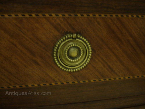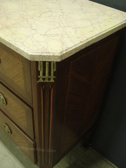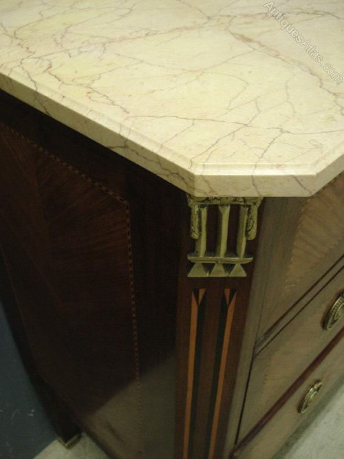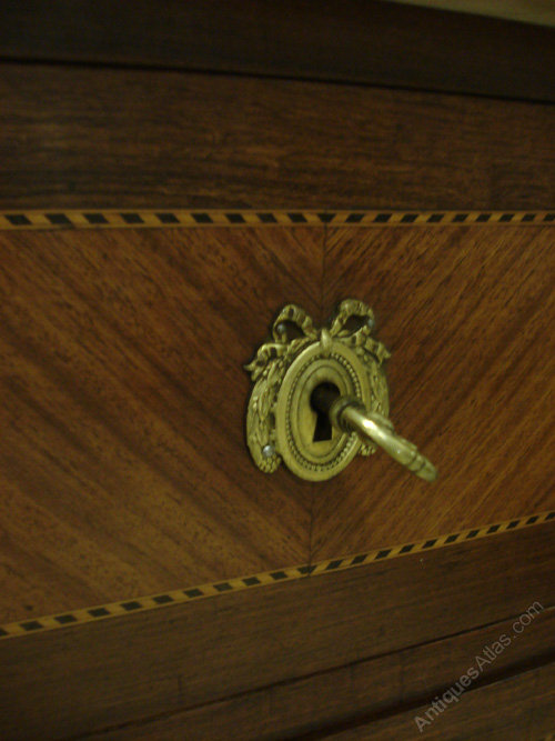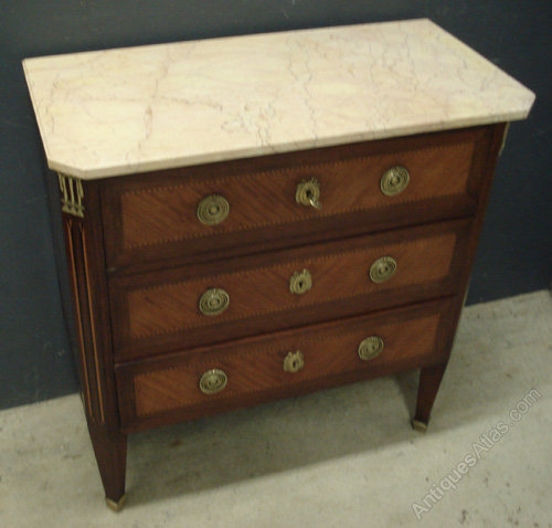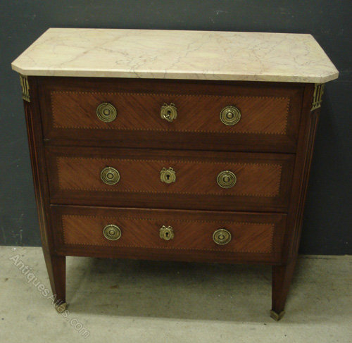 Ref 4824 - 19th Century antique French Louis XVI style rosewood inlaid veneered on oak three drawer commode chest of drawers. Original cream veined marble top. Original brass handles, escutcheons, key and toe caps. Circa 1880.