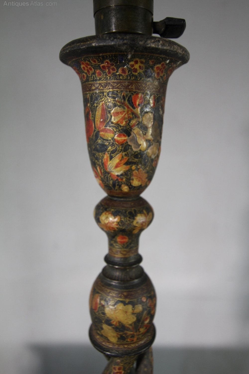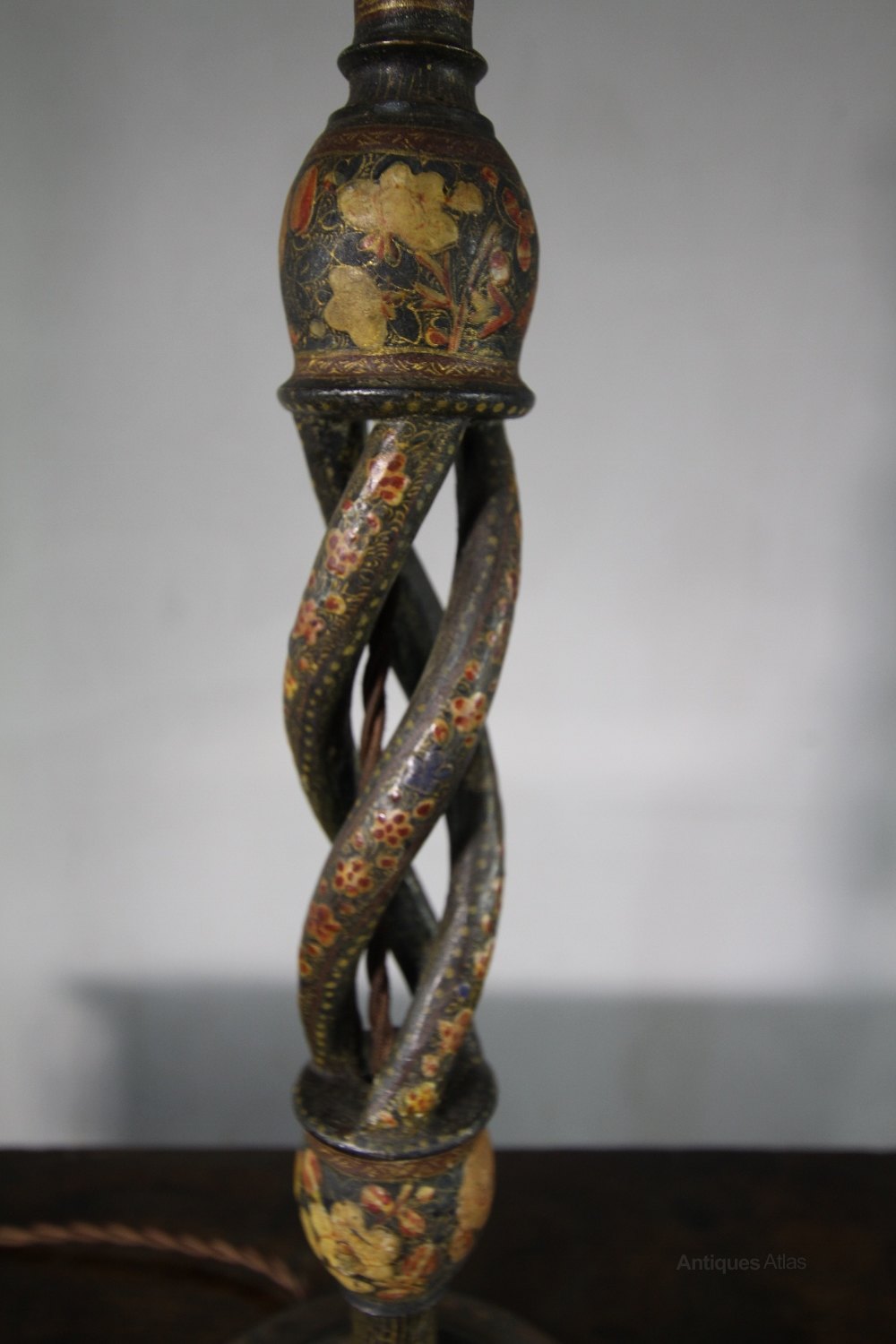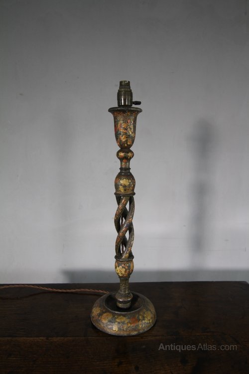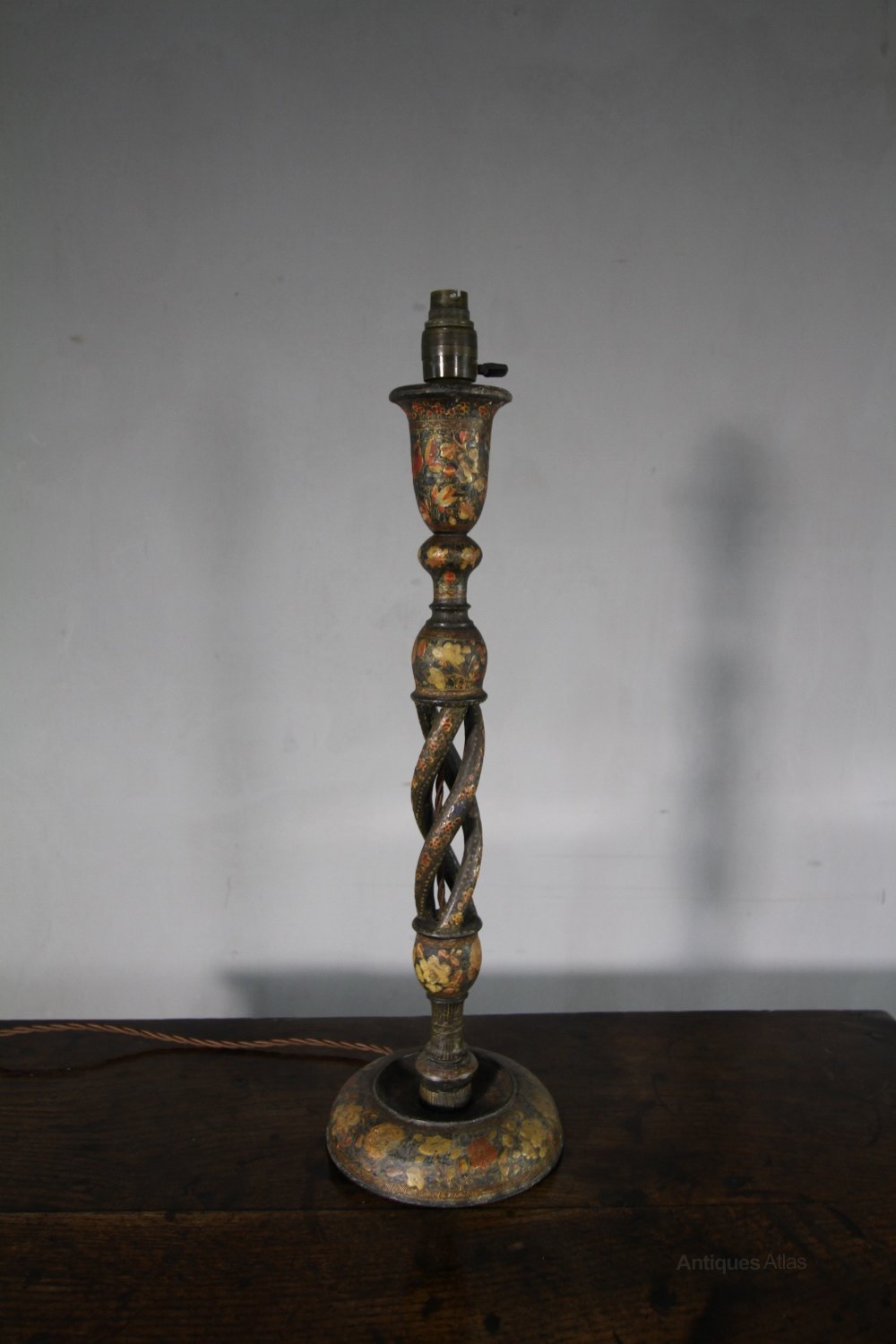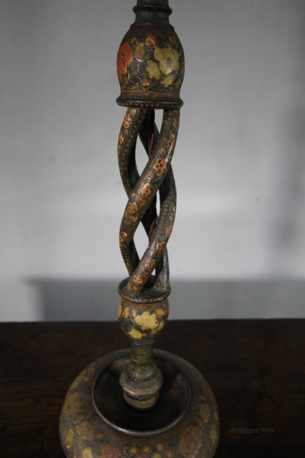 This is a very decortaive 19th century antique Kashmiri antique table lamp. In very good condition and newly re-wired with traditional flex. A lovely design has an open twist to the column and the lamp stands on a round base.