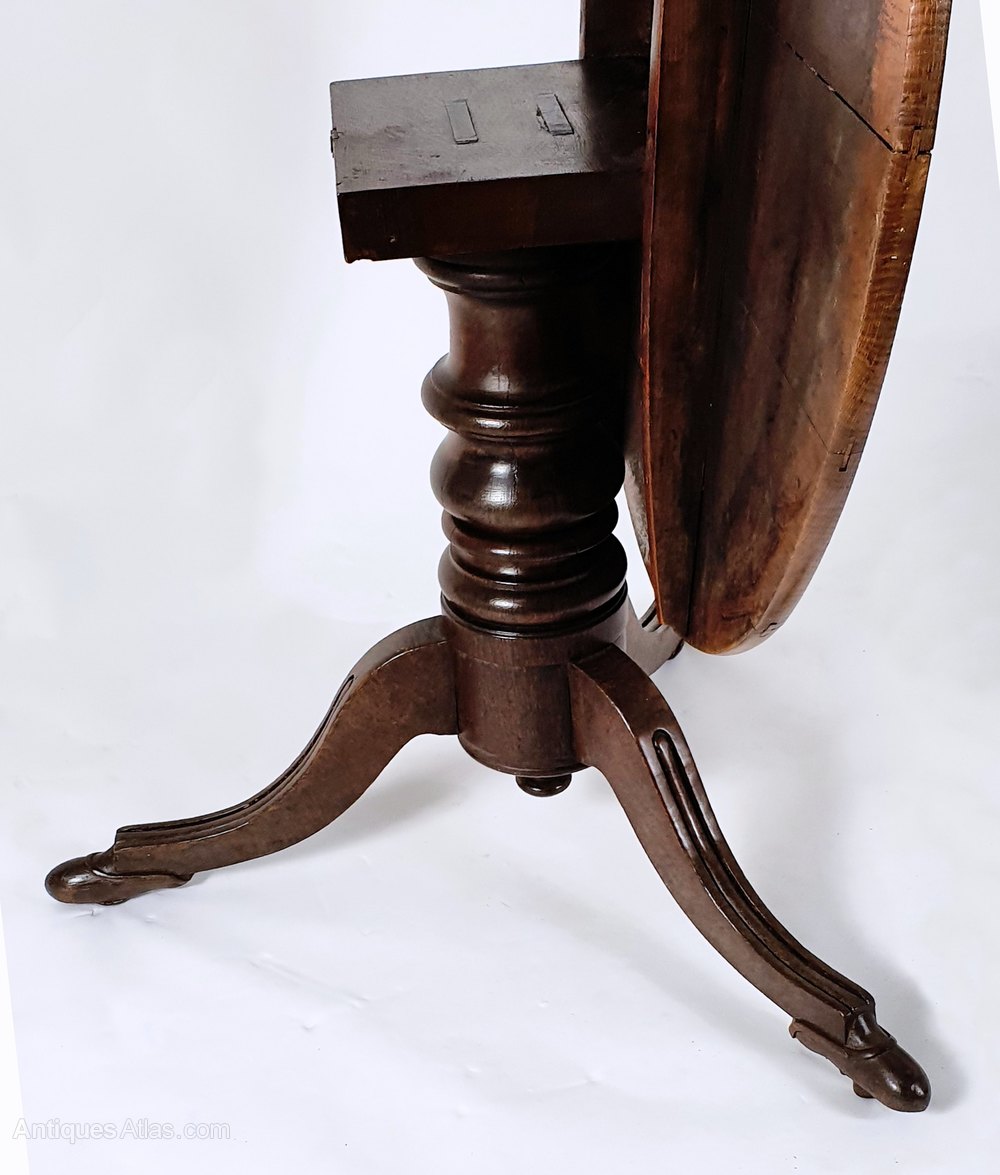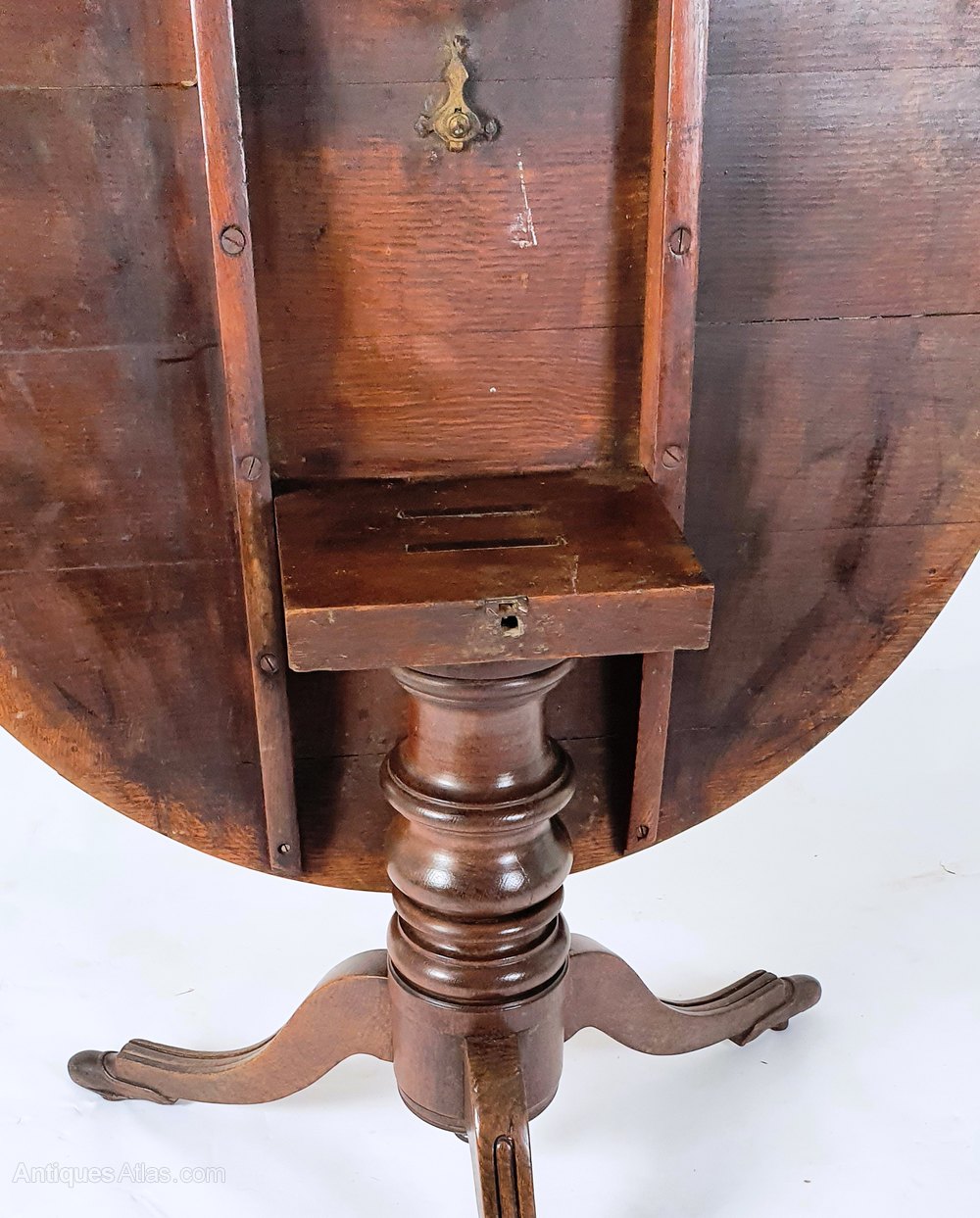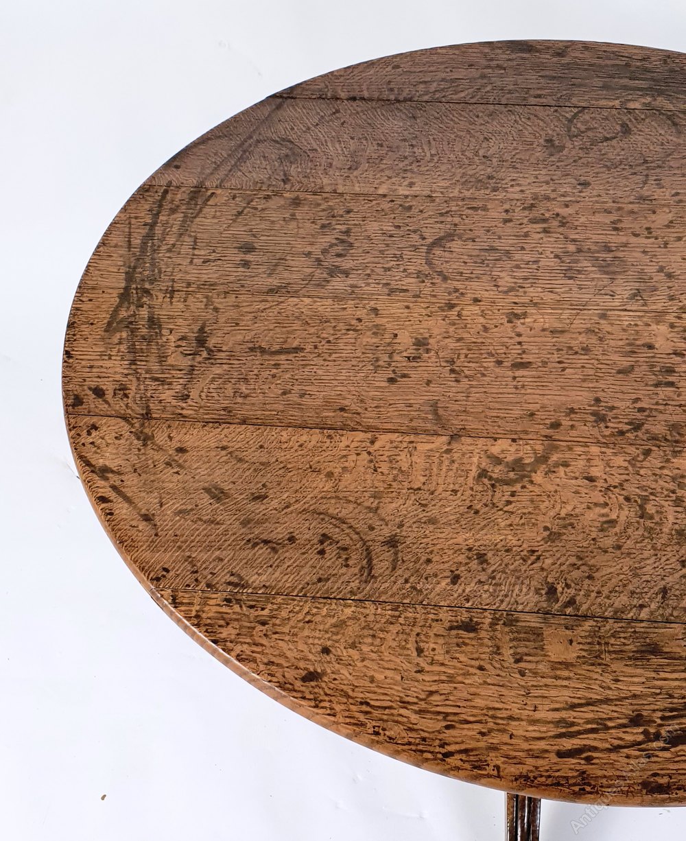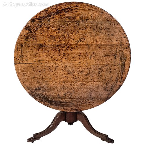 This beautiful and rare early 19th century country oak tilt top table breakfast table is possibly from the Isle of Man and stands on a central turned column with tripod supports ending on carved shoe feet. It measures 40 in – 101.6 cm in diameter and 28 ¼ in – 71.7 cm. This lovely table would work well in a wide range of decors and styles.