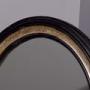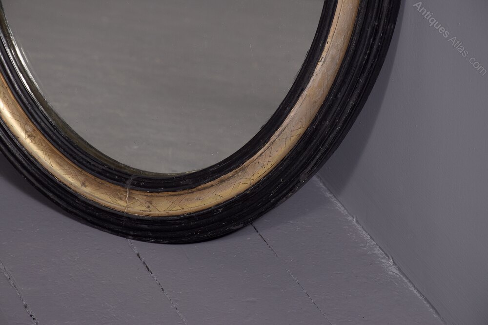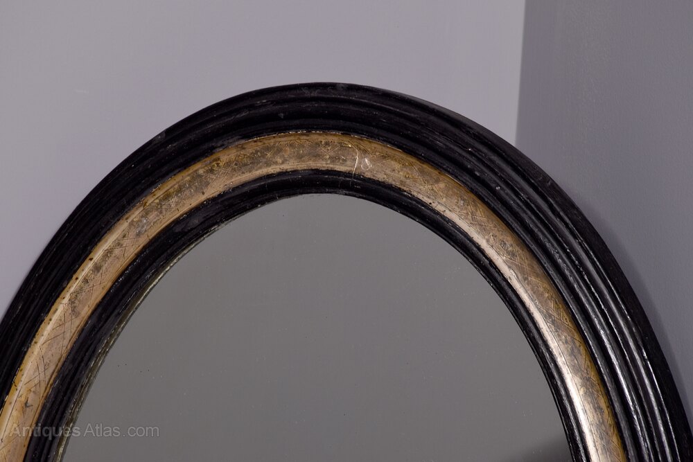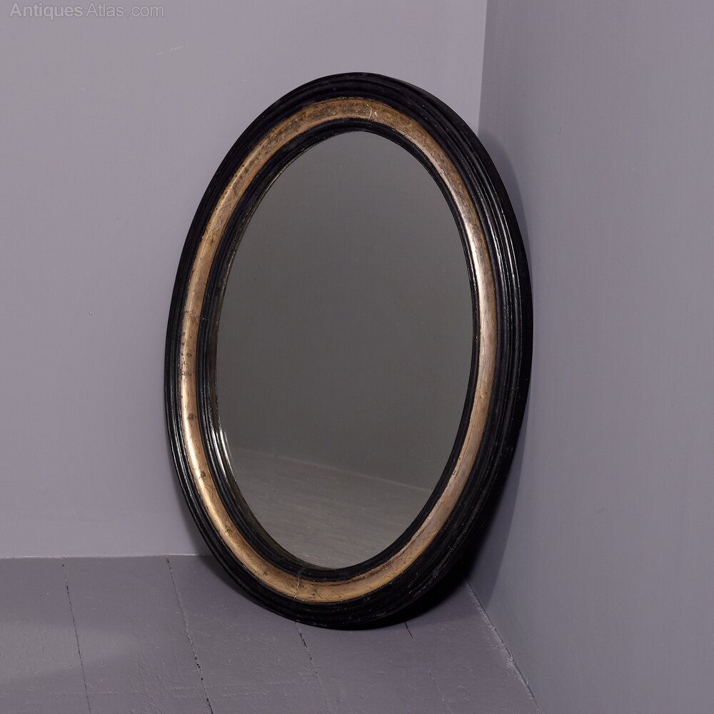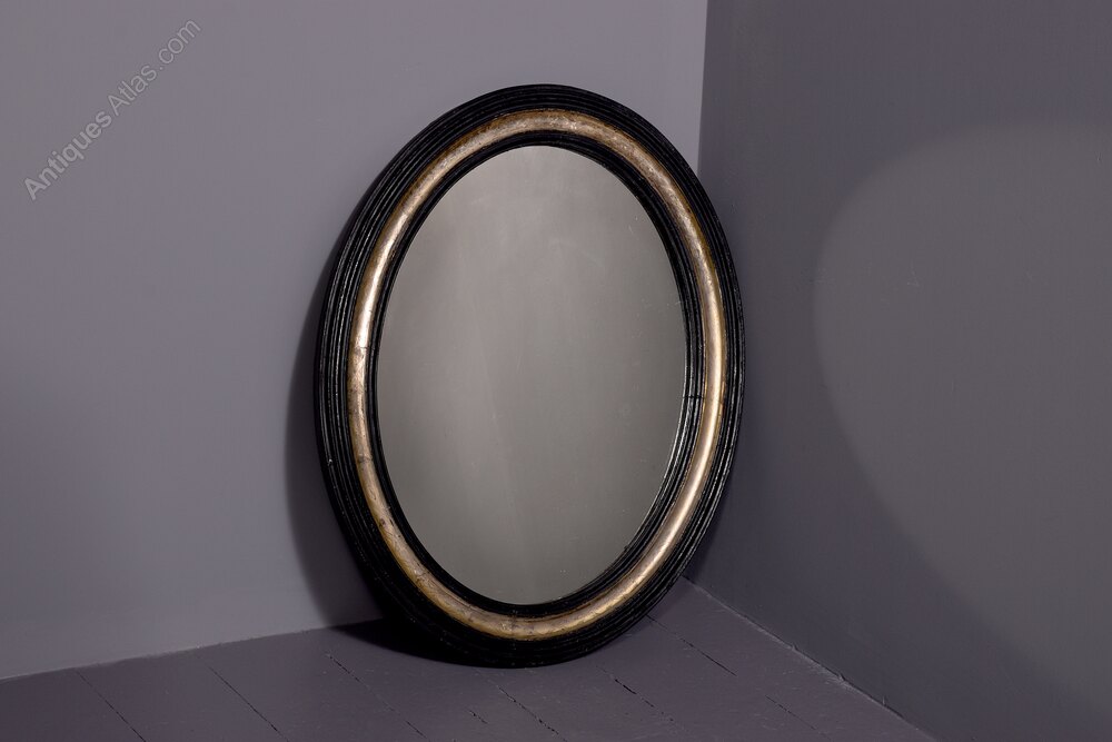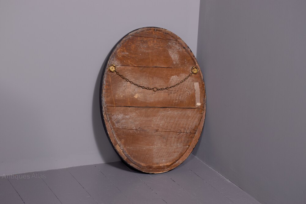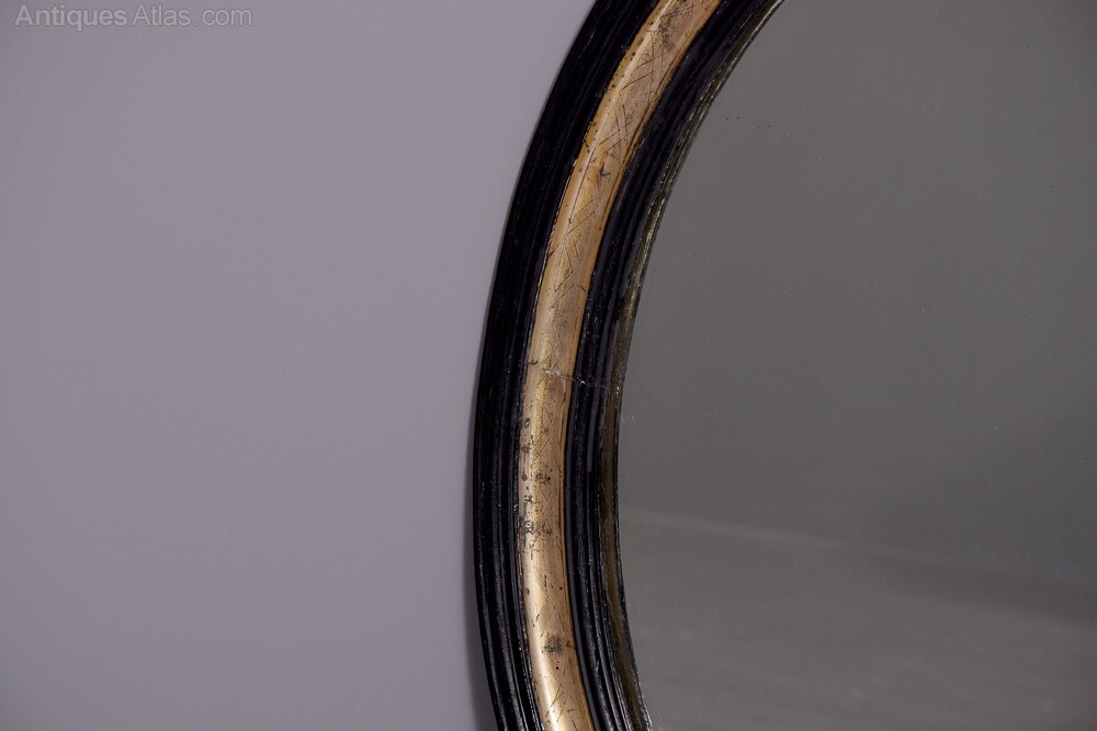 Circa 1840. 19th Century ebonized and gilded oval hall mirror, possibly Irish. With a fluted and moulded ebonized external frame with chased gilding more centrally and a further ebonized slip around the original mirror plate, that is in excellent condition and with its original solid oak back. Can be mounted landscape or portrait as currently.