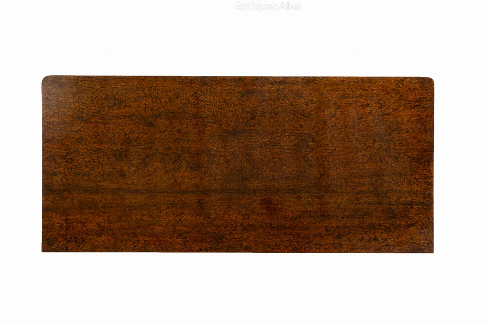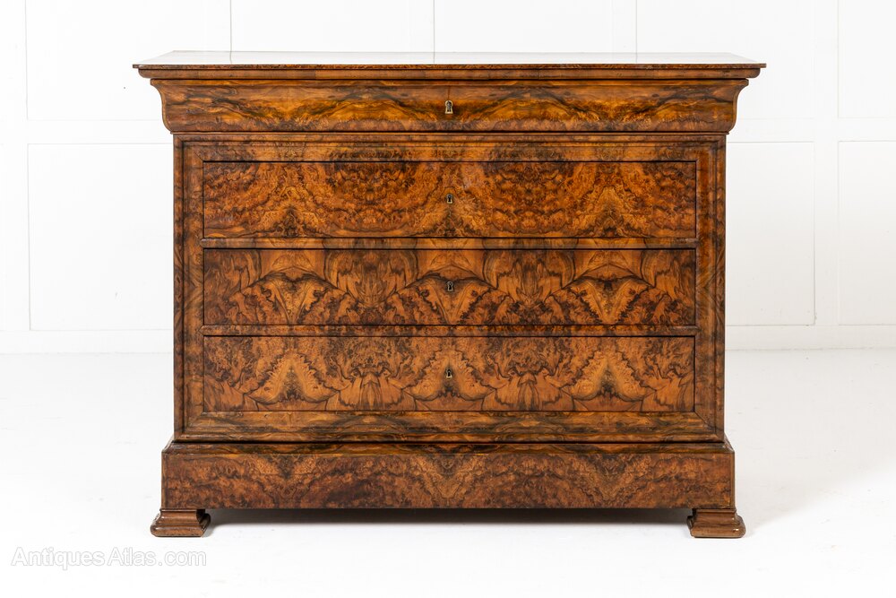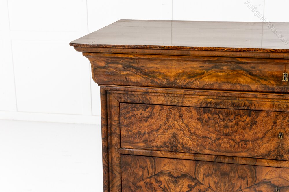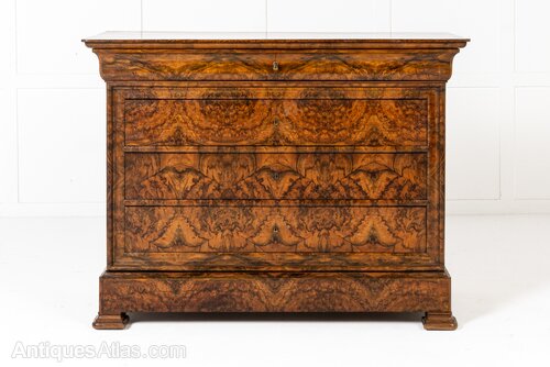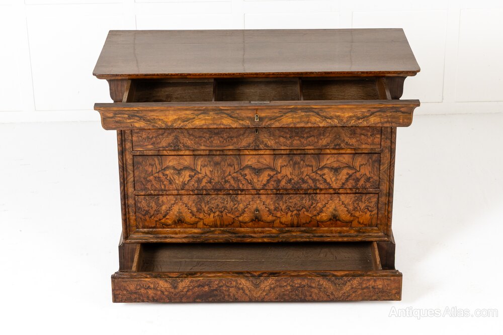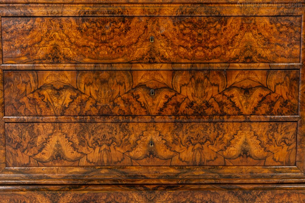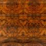 This handsome commode has several features that make it particularly interesting. It has a concealed drawer in the frieze above the three drawers below and across all of the drawer fronts the maker has aligned the bookmatched veneers so they create an interesting repeating pattern of circles and crosses. The top of the commode is a piece of timber that has been painted in imitation of figured walnut.