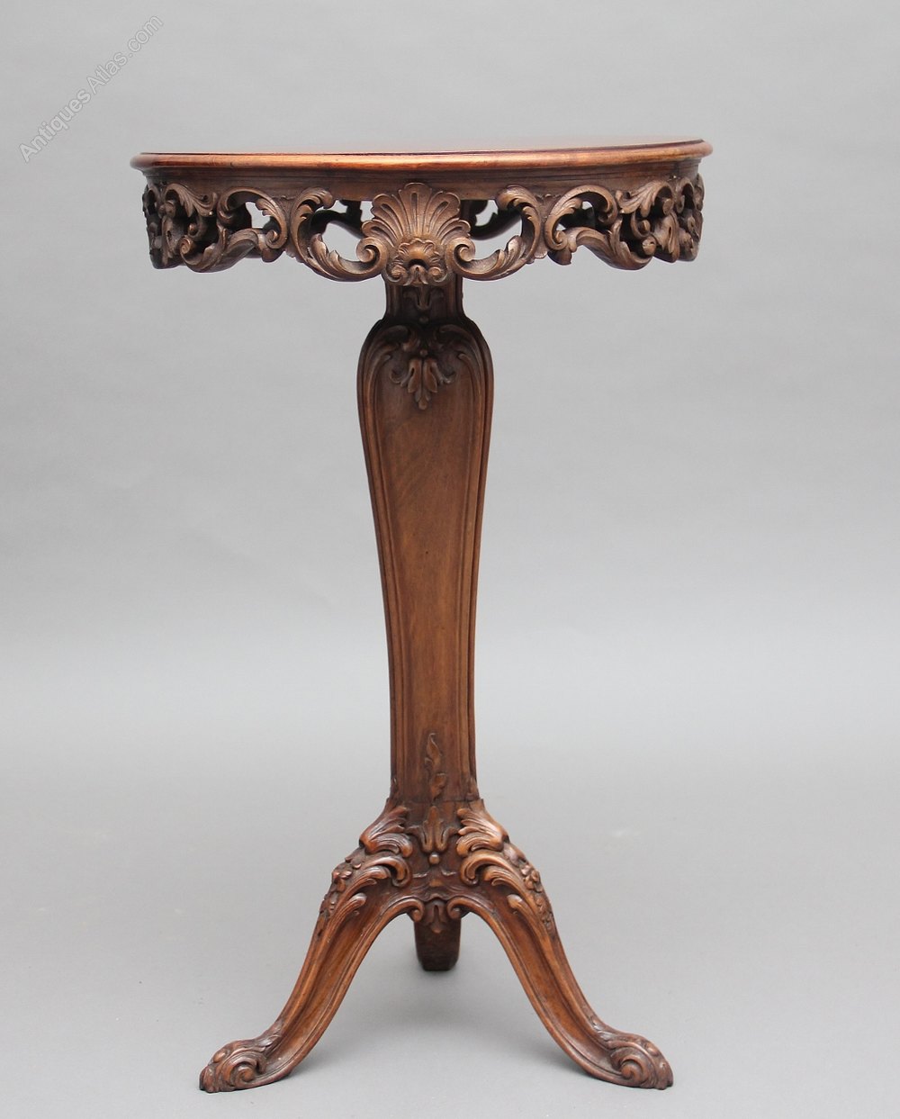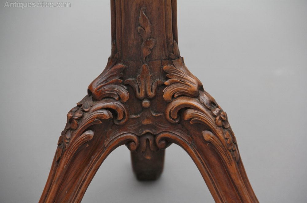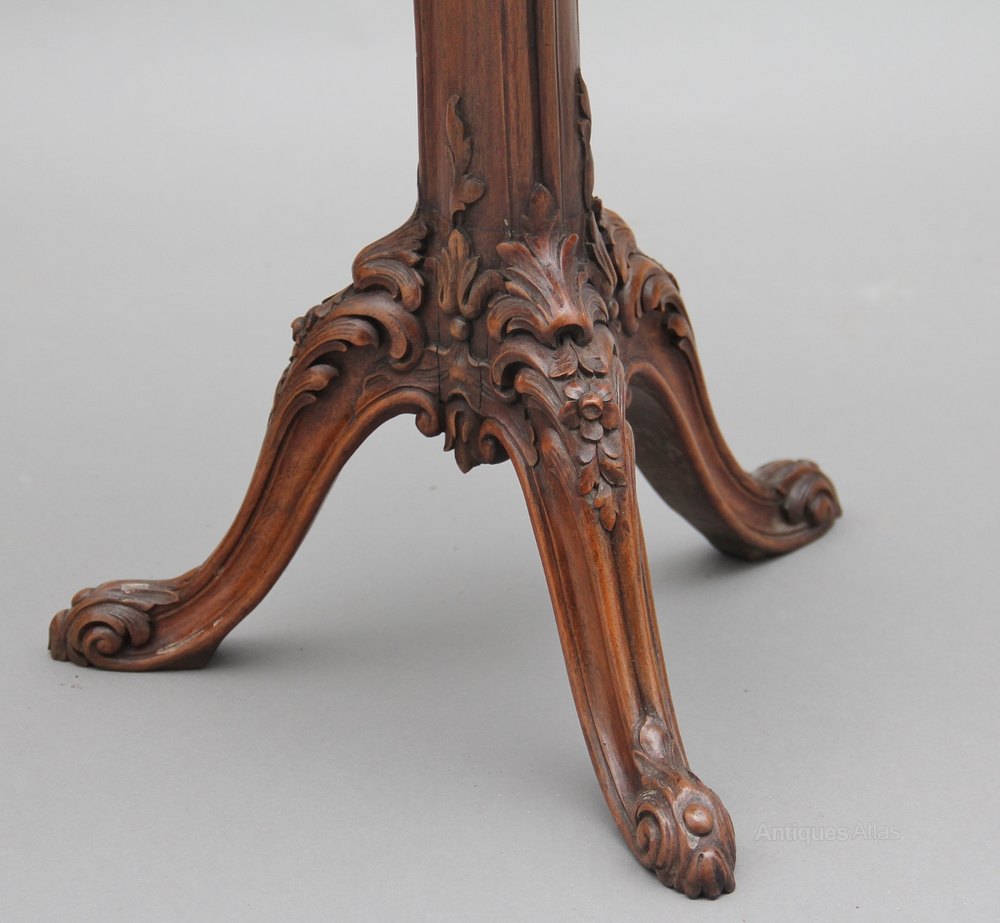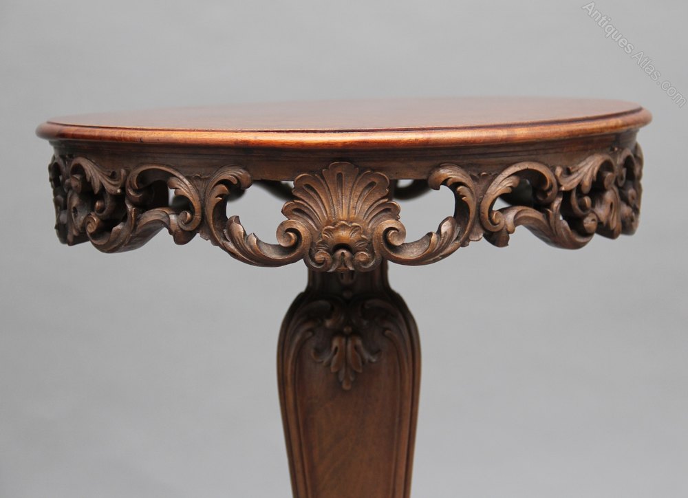 19th Century French carved walnut occasional table, the circular top having a very ornate carved floral frieze including carved shell decoration, the top supported on a carved triform column terminating with three shaped and carved legs. Circa 1880.