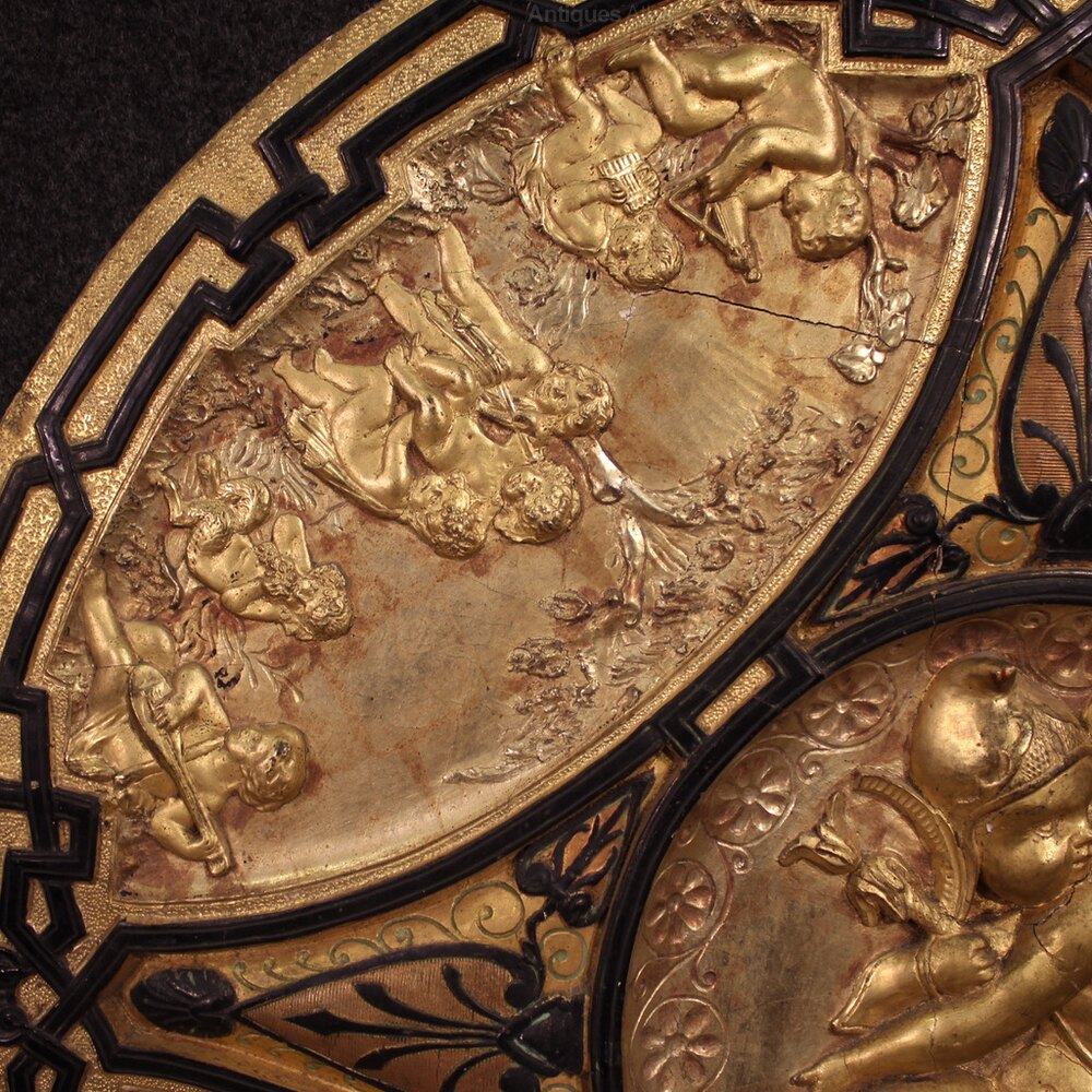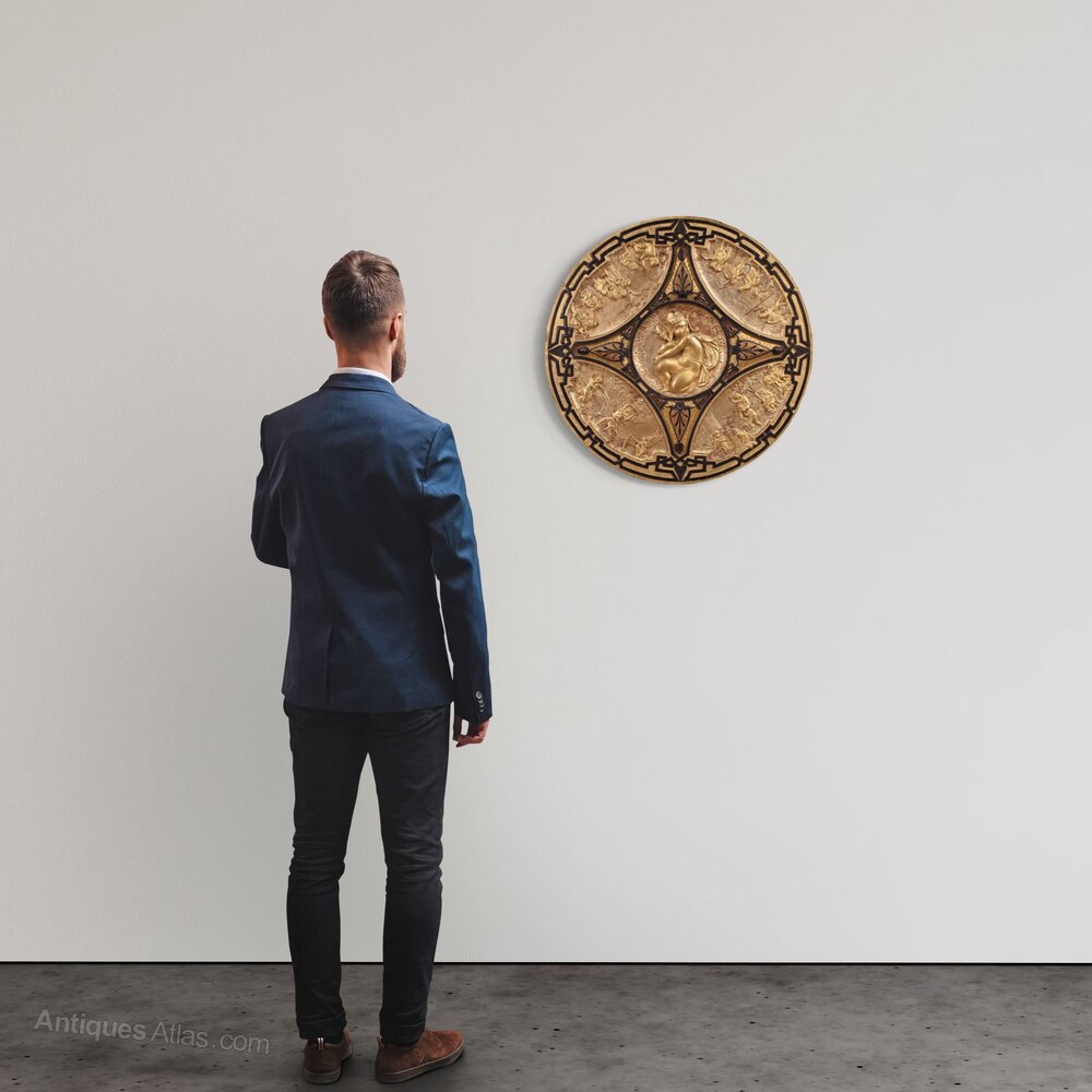 Large 19th-century decorative shield. Finely carved and gilded wood work with mythological motifs and figures, signed F. Barbedienne Paris, attributed to the great French foundryman Ferdinand Barbedienne (1810-1892). Founded in 1834, Maison Barbedienne became the most famous bronze company in the country, reproducing works by great artists and creating its own original objets d'art that achieved international success.