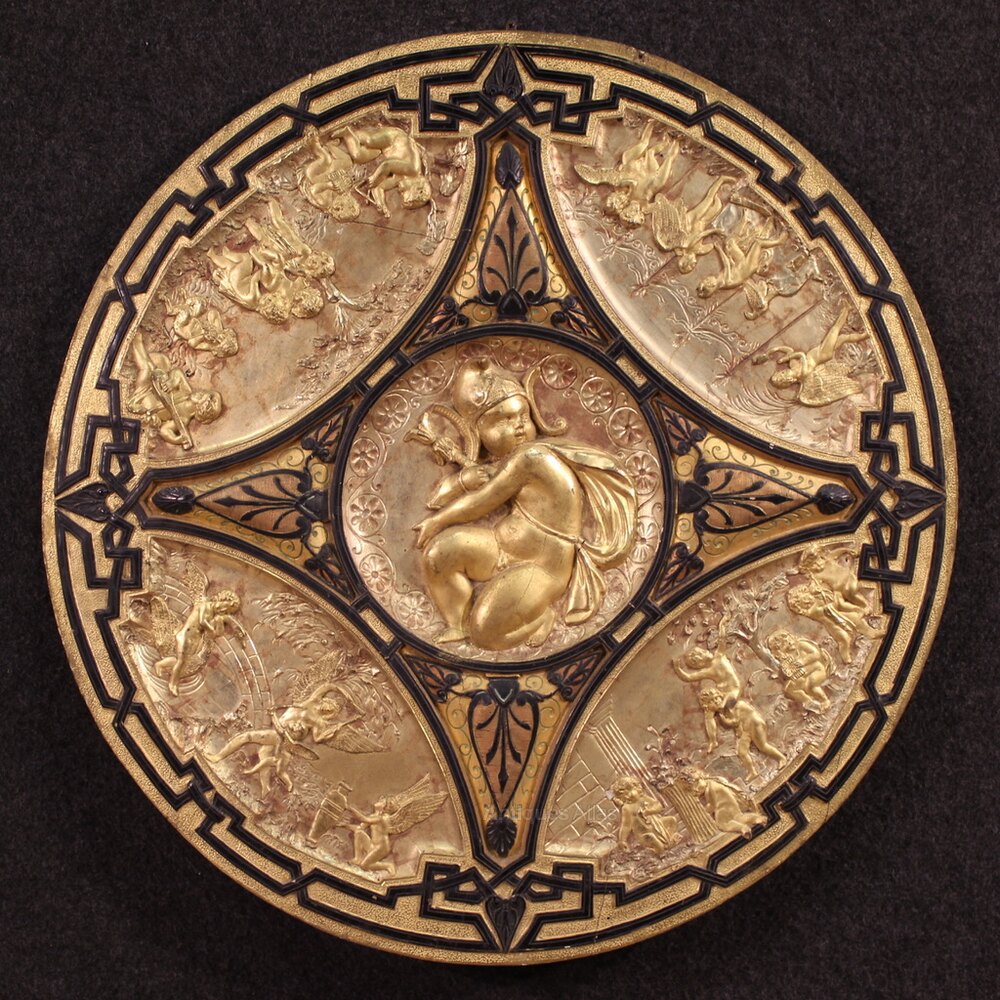 The plate features a splendid cherub at the center surrounded by four compartments with delightful scenes of winged cupids, bacchanalia, allegories of dance, music, games, and abundance. The refined geometric motifs with black scores divide and punctuate the scenes with meticulously carved figures reminiscent of Renaissance art. Large foundries commonly created wooden models from which molds for bronze casting were then obtained, but this could also be a finished work intended for exhibitions and presentations.