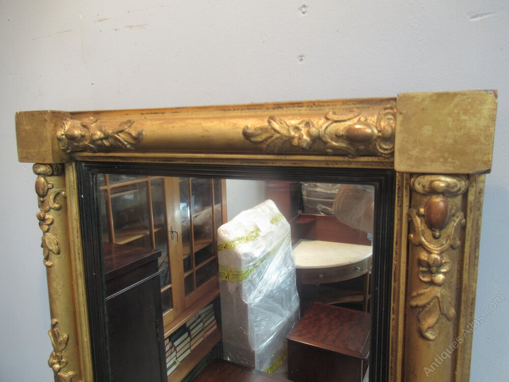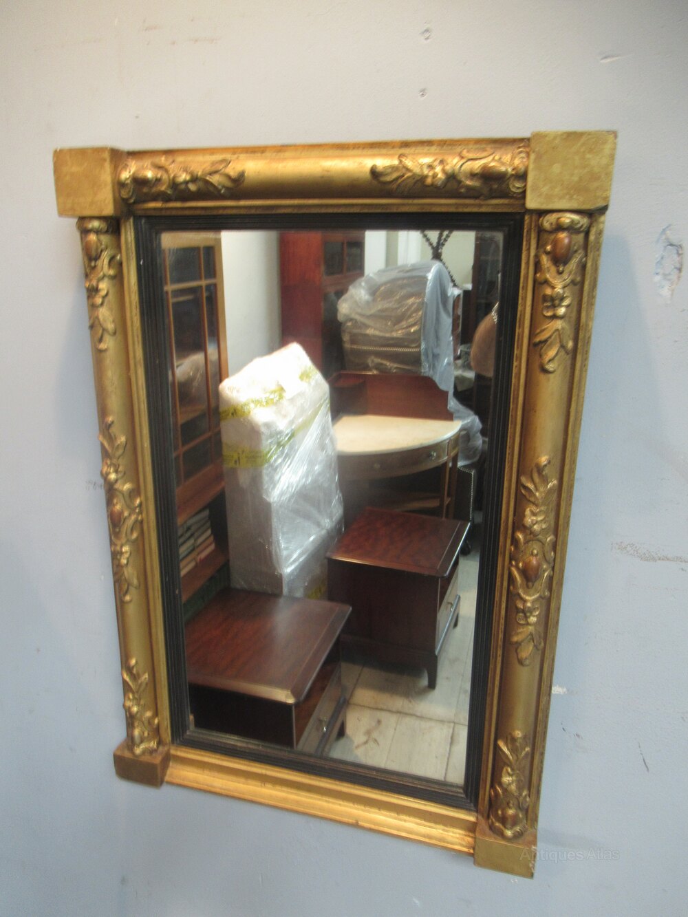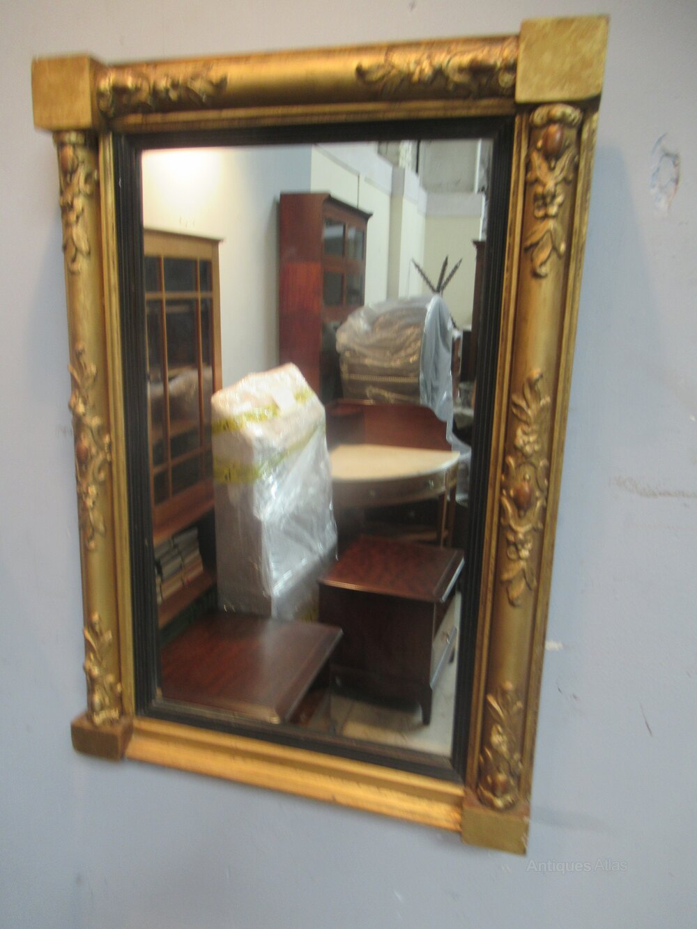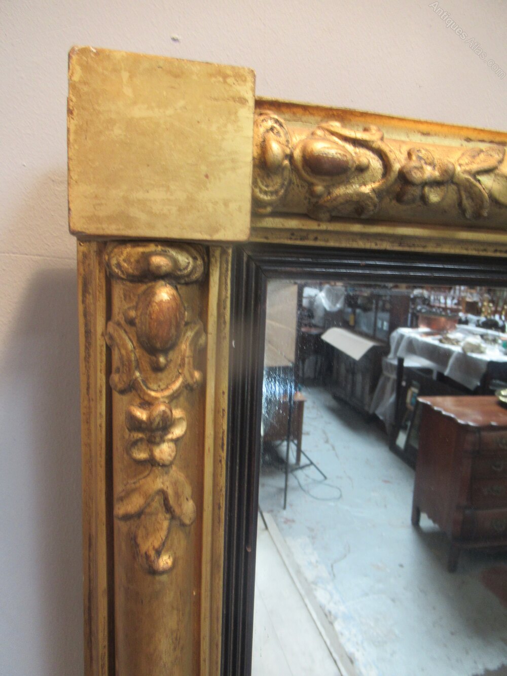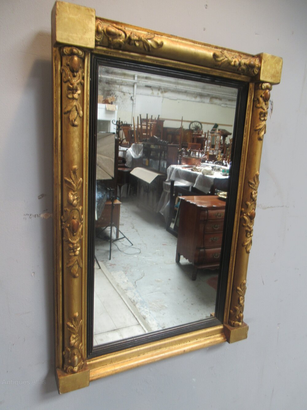 19th century gilt wall mirror dating from around the 1840s. The mirror has shaped top and sides with floral decoration in gilt. The is an ebonized frame surround to the plain mirror.
