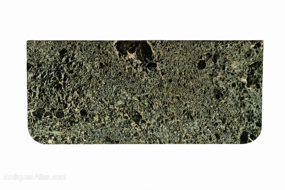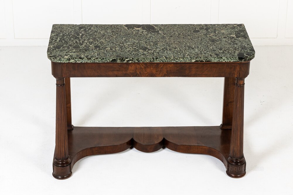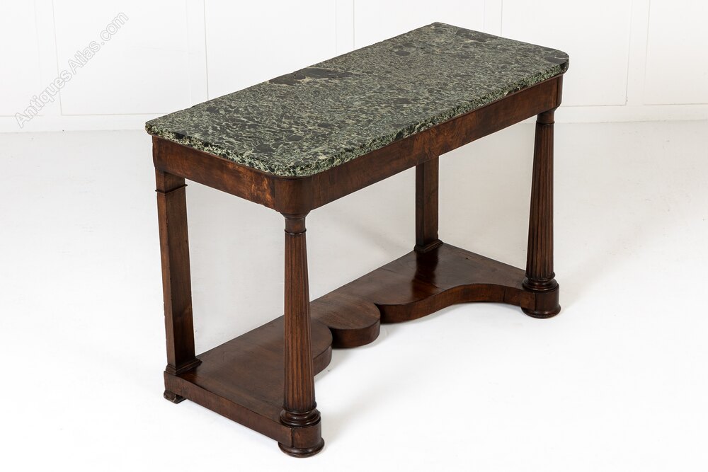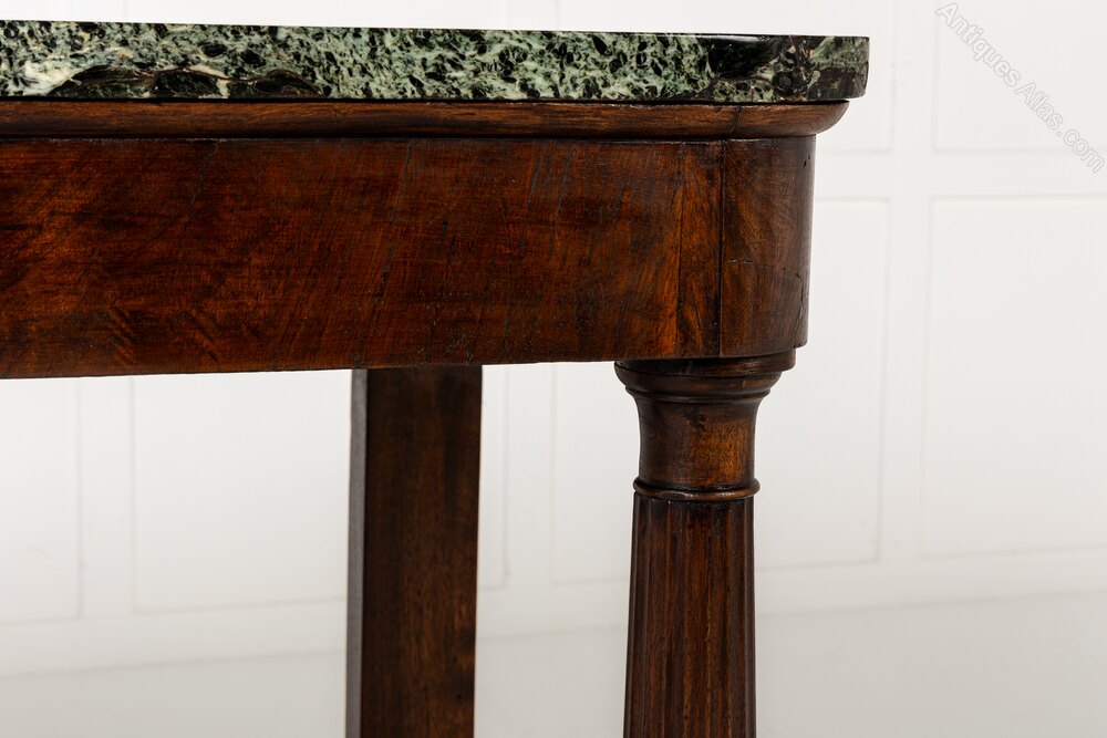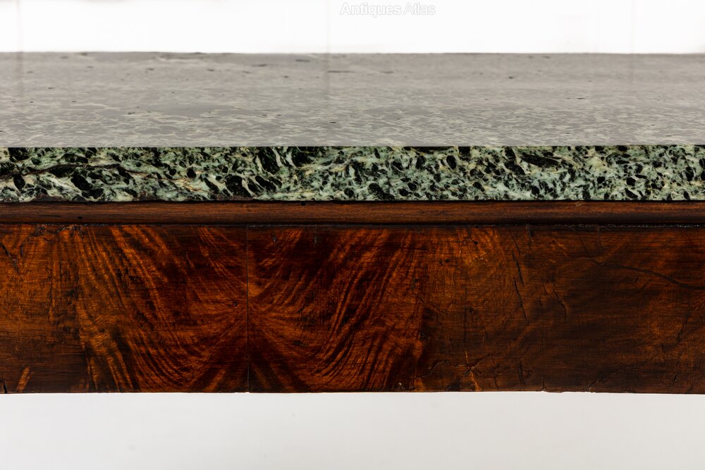 This interesting table has an exceptional, beautifully figured green and black marble top above a plain frieze. Supported by four turned and tapering columns with fluted detail, and joined by an unusually shaped undertier or stretcher.