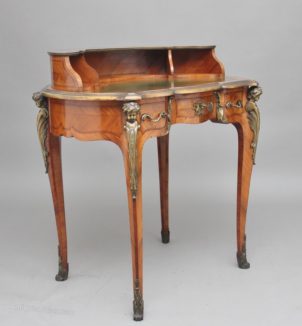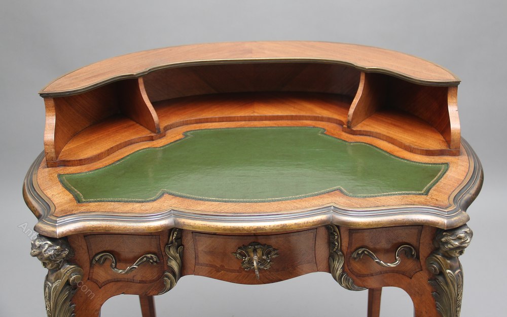 A free standing 19th Century French Kingwood and ormolu writing table, having a curved superstructure with divided compartments, the shaped top with a brass moulded edge, green leather writing surface decorated with blind and gold tooling, the table having three frieze drawers with hardwood linings, lovely quality ormolu mounts at the top of each leg, shaped apron running along the front, back and sides, supported on elegant cabriole legs. Circa 1890.