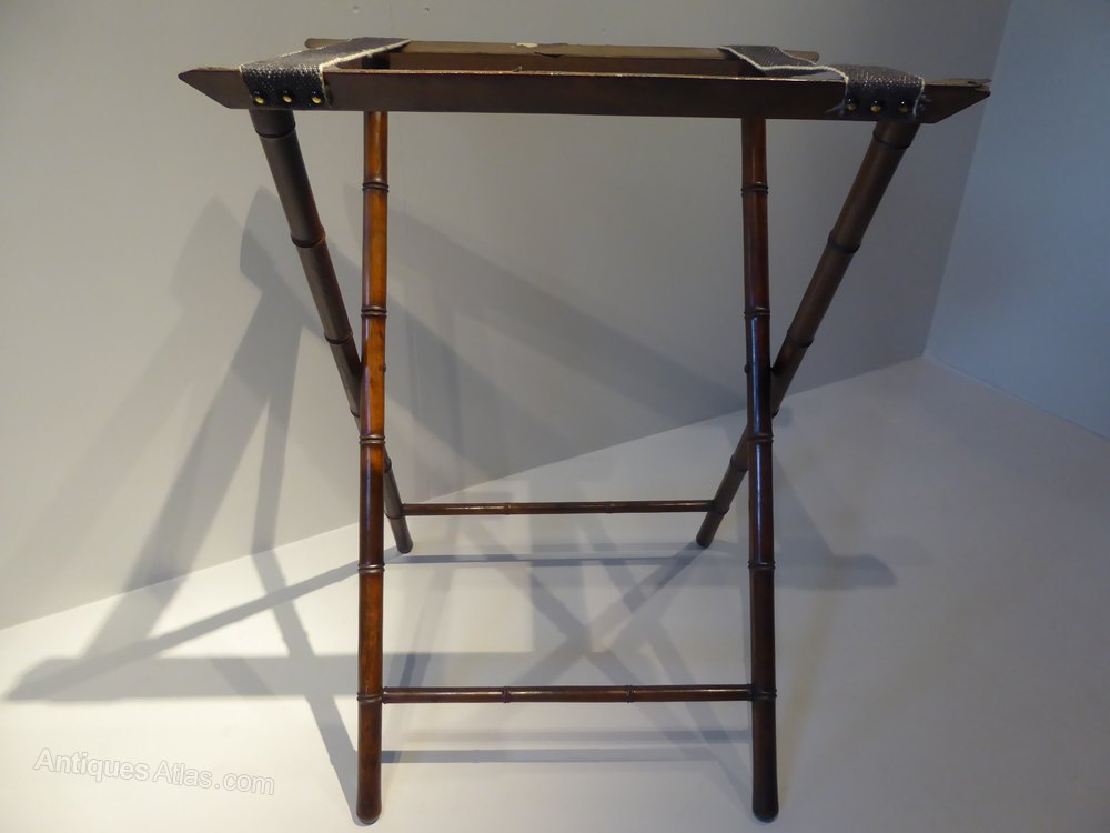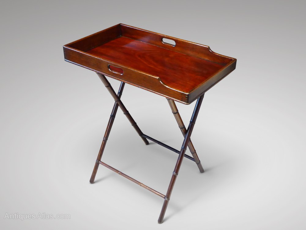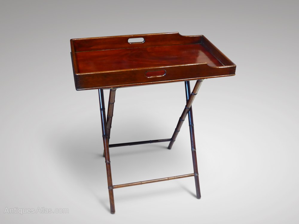 A stunning 19th Century mahogany butler's tray on stand. The separate folding stand has decorative simulated bamboo mouldings.