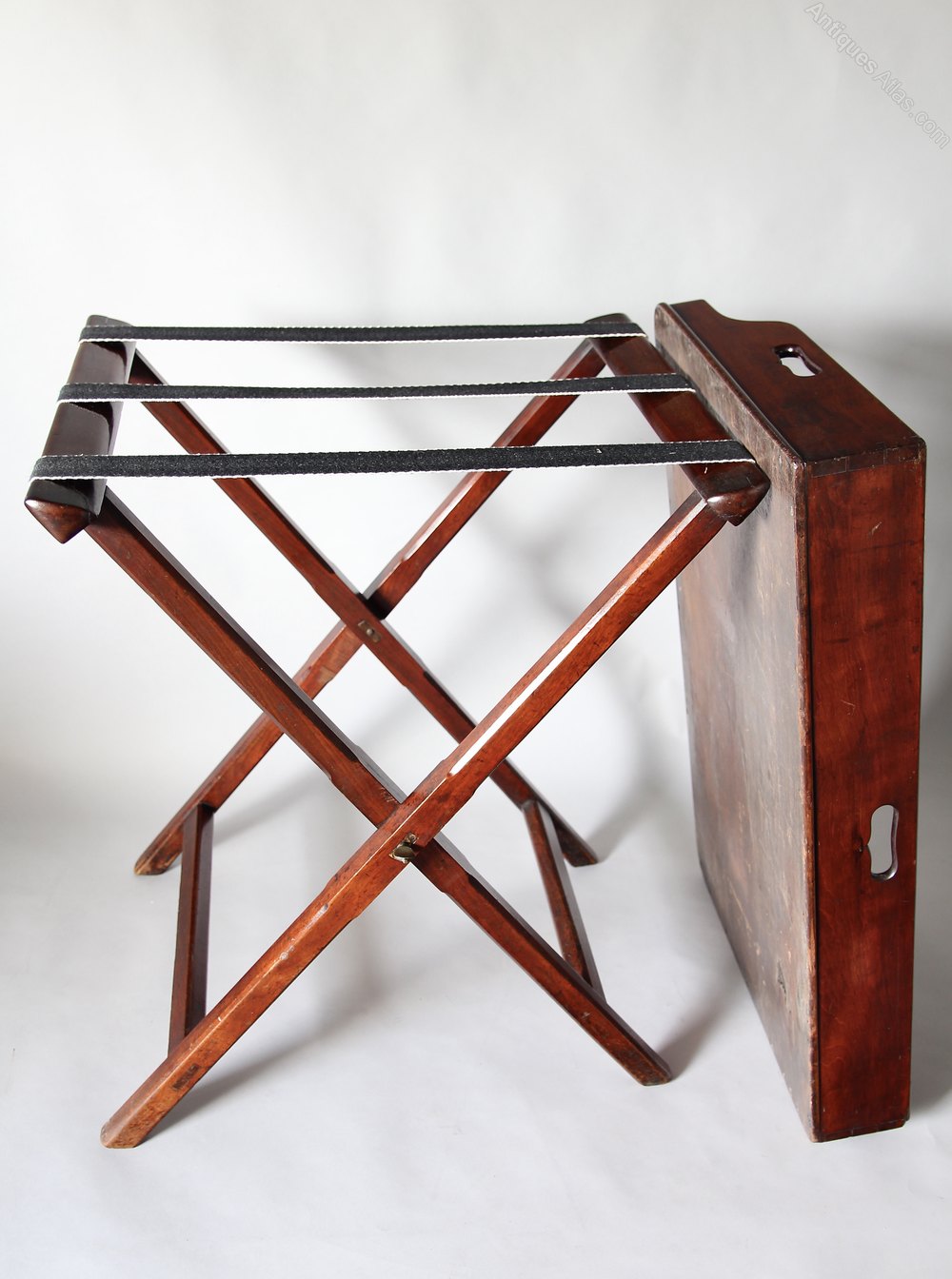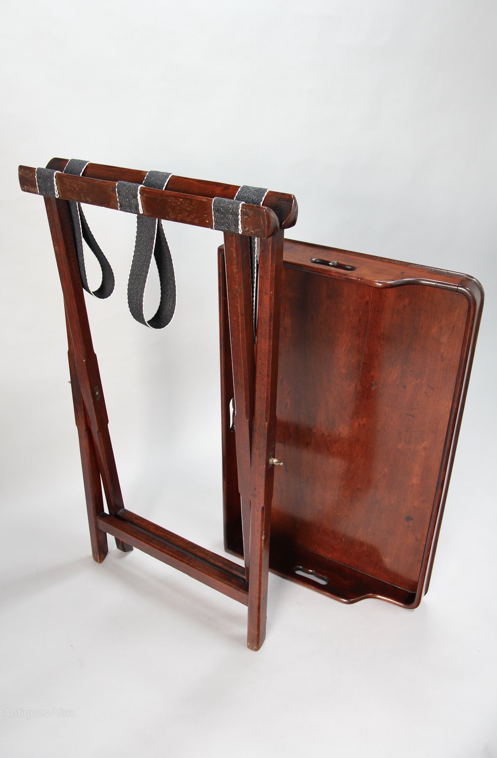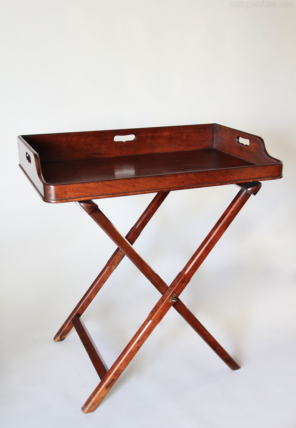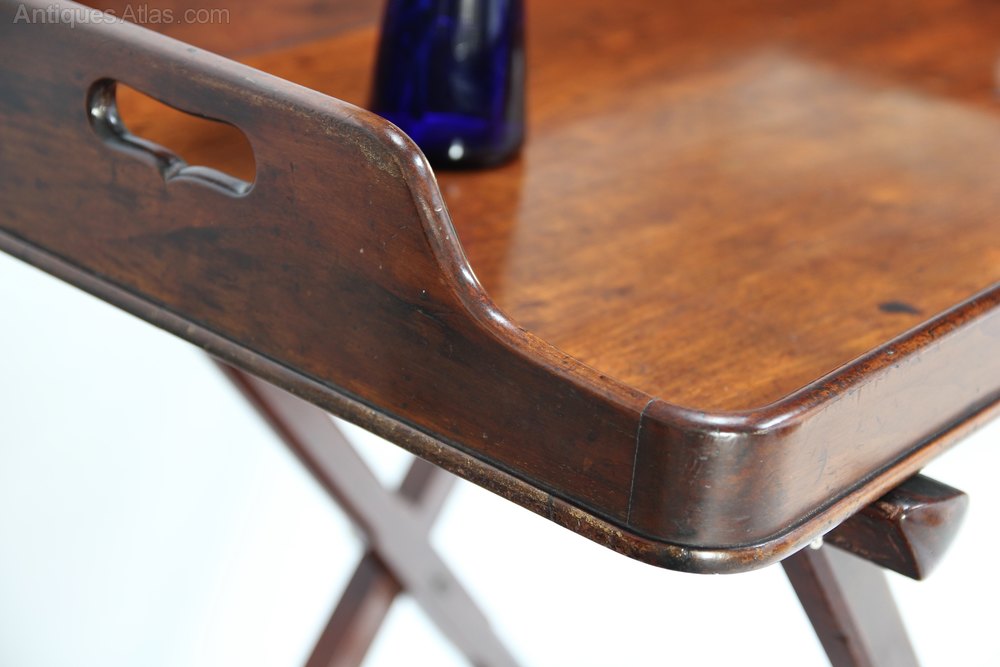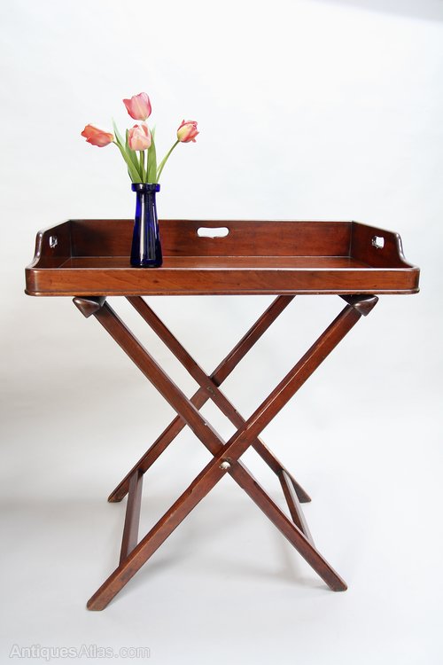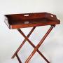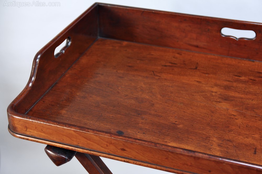 An early 19th century Butlers Tray on Folding Stand. Made of dense Georgian mahogany, it is of exceptional quality. The large front loading tray has curved front corners and shaped sides, softening the angular nature of the whole piece. Unusually, the tray sits on the stand with the ends of the stand protruding(ensuring that, visually, the tray is always securely in the correct position on the bearers?) The stand has carved chamfered legs, and a brass tightening wing bolt for extra strength. A piece of antique furniture that carried precious items, now an antique with a rich colour and fine original surface. Circa 1830