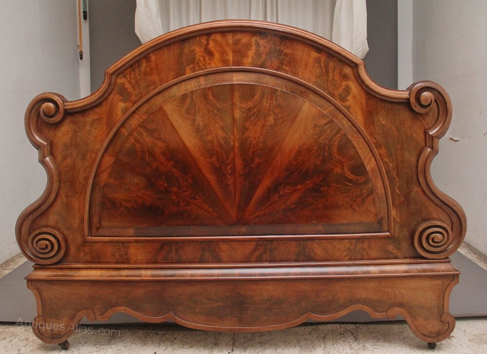 A lovely quality 19th Century mahogany half taster bed, the King size half tester bed having a decorative moulded and shaped canopy top fitted with a cream fabric, having a brass rail with hanging draped and tie backs, a decorative cushioned headboard with further hanging draped behind, having a wonderfully shaped and moulded footboard with carved scroll decoration and central semi circular panel, wonderful curl veneer throughout, shaped front feet and terminating on castors. Circa 1860.