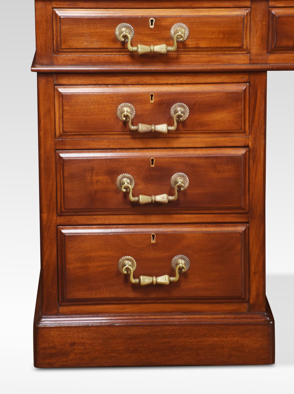 19th Century mahogany partners/library desk, the very large rectangular black hide top with a gilt-tooled border enclosed by a moulded edge over an arrangement of four frieze drawers fitted with bold brass tooled handles. Above two large pedestals having three drawers to each side and opposing side, all raised up on a plinth base.