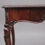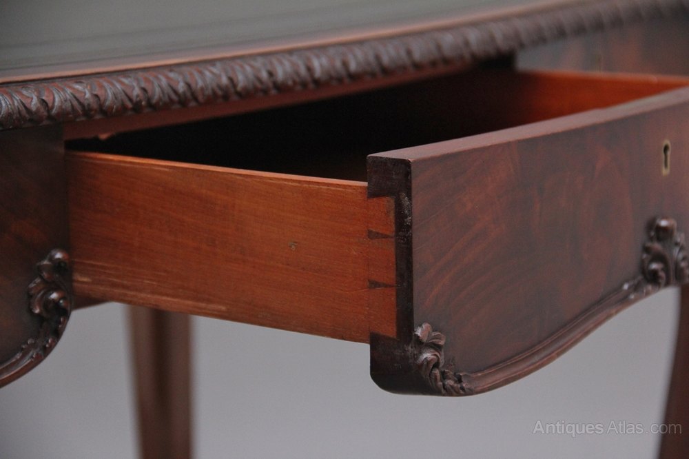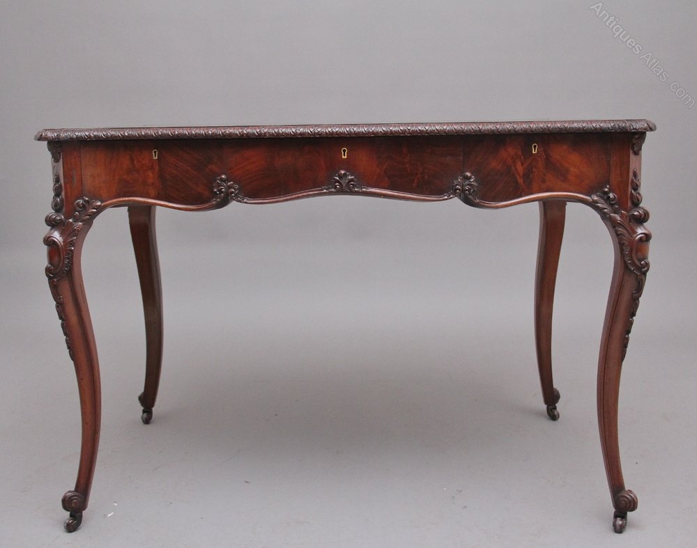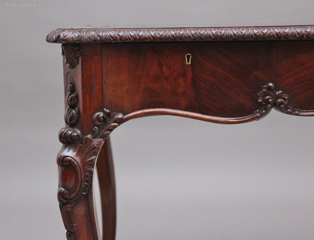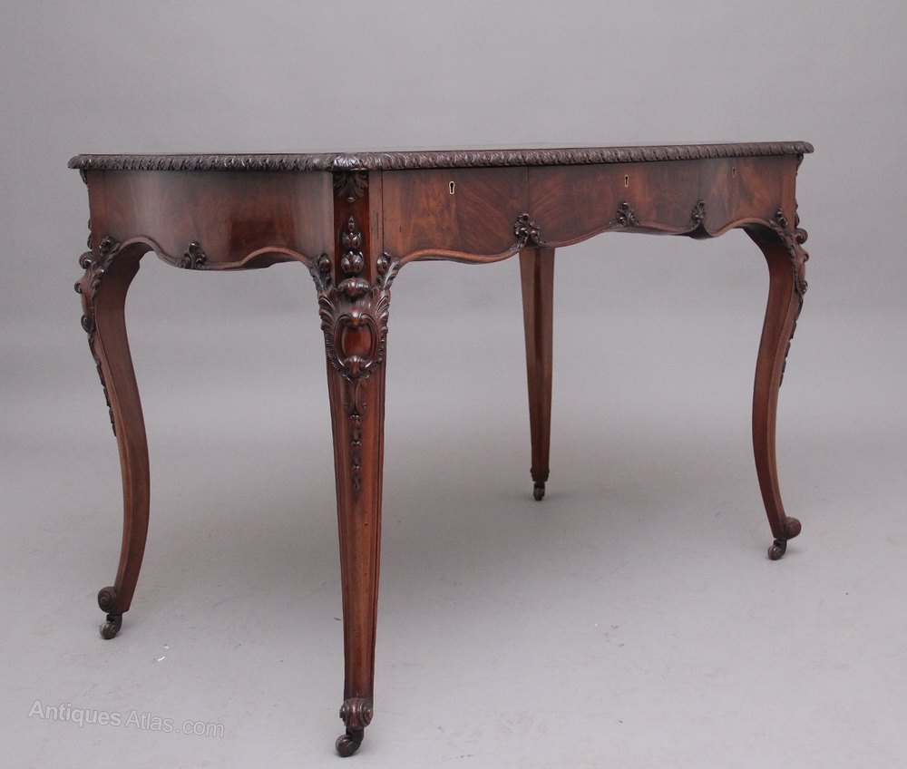 19th Century mahogany writing table, having a shaped and crossbanded top with a green leather writing surface decorated with blind and gold tooling, a chrisp carved moulded edge, a mahogany lined frieze drawer below with carved detail on the bottom edge which runs along the front, sides and back of the table, floral carving at each corner of the table, supported on carved cabriole legs terminating on carved scroll feet and castors. Circa 1890.