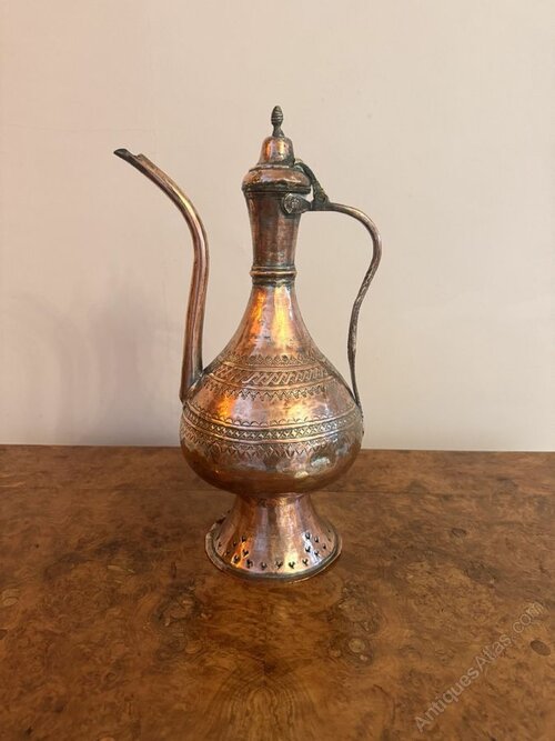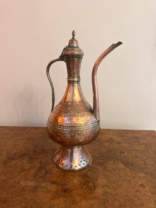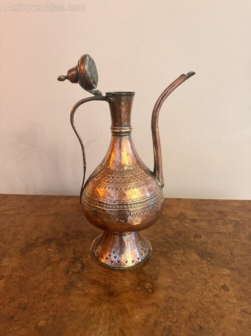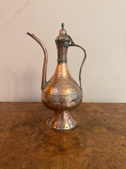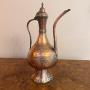 Quality 19th Century antique Middle Eastern copper coffee pot, having a quality 19th century copper coffee pot with a beautifully shaped bulbous body raised on a pierced circular shaped base, with a shaped handle and spout, having the original lid.