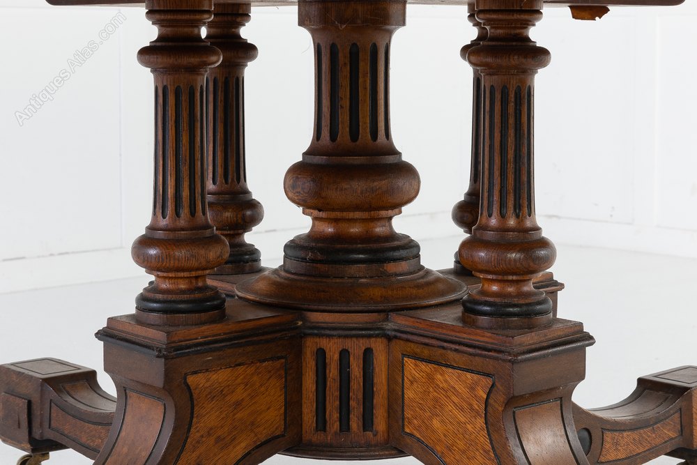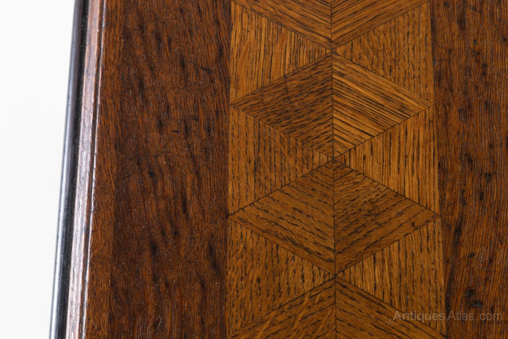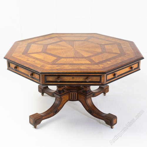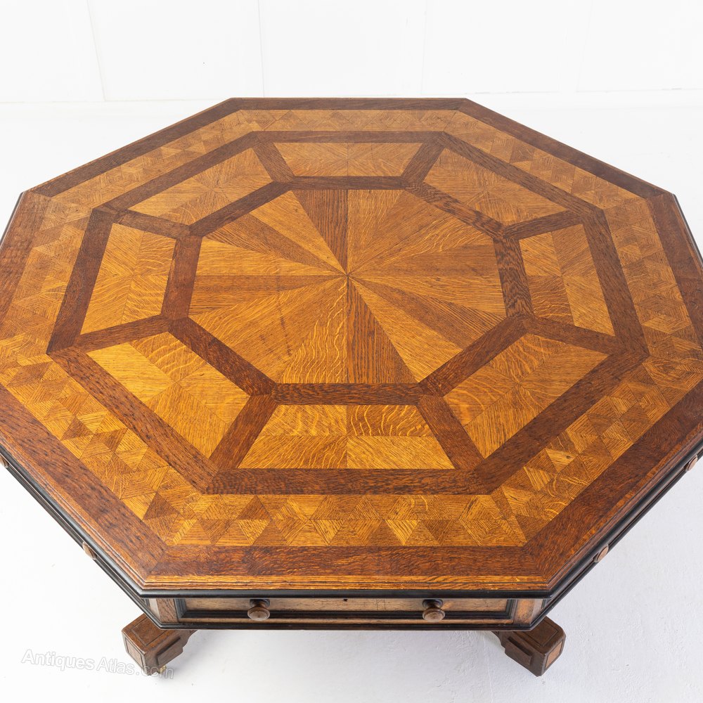A wonderful large scale, and very elegant 19th Century octagonal drum or library table by Howard and Sons. Having a wonderful parquetry top made from different shades of oak timber. Having Hobbs locks on each of the four drawers that open. Four dummy drawers to match.