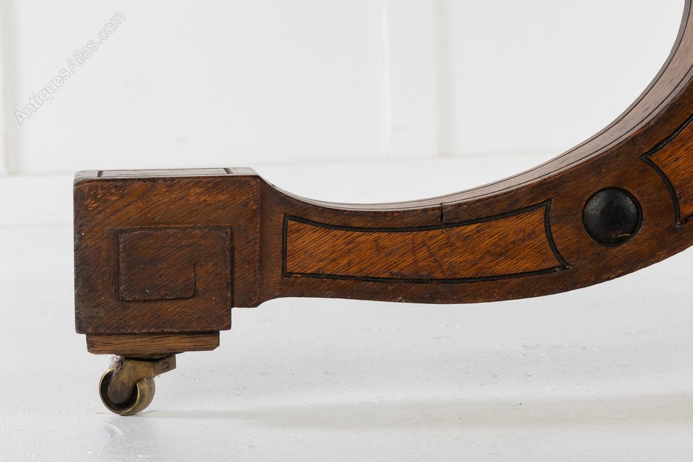 The top rests on four turned spindle supports down to four elongated and inverted sabre legs with square block decorated feet, terminating in brass wheel castors.