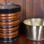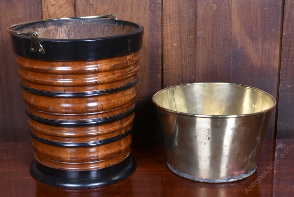 A delightful 19th‑century wooden bucket, lined with polished brass and offered in excellent condition. The body is finely constructed from alternating ribbed bands of fruitwood and ebonised rings, creating both strength and a striking contrast of colour and texture. A robust metal swing handle completes the piece, balancing practicality with decorative appeal. Originally made for domestic use, it now serves beautifully as a fireside accessory, planter, or decorative storage vessel. The warm timber tones paired with the gleam of brass give it a timeless quality that suits both traditional and contemporary interiors. A particularly well‑preserved example of 19th‑century craftsmanship.