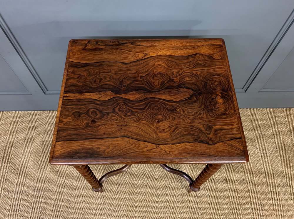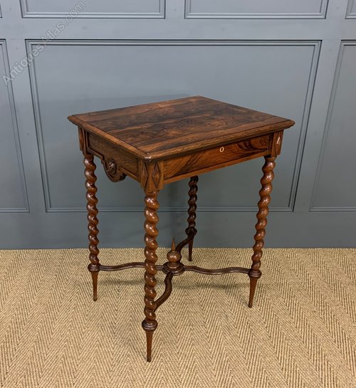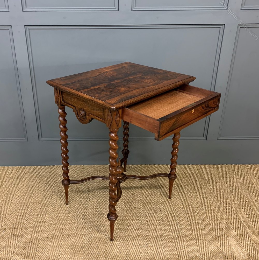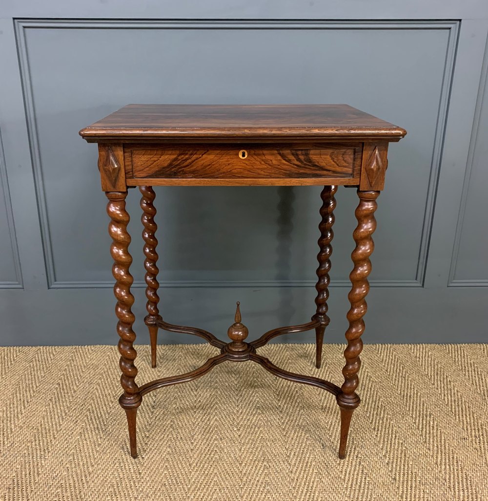 A charming 19th century rosewood lamp, or side, table. Very well constructed in solid rosewood with attractive rosewood veneers. With a single drawer to the front and standing on refined barley twist legs, united by an x shaped under-stretcher. This lovely table would sit well in a number of different room scenarios within the modern home. Offered for sale in excellent condition, with a great colour and patina.