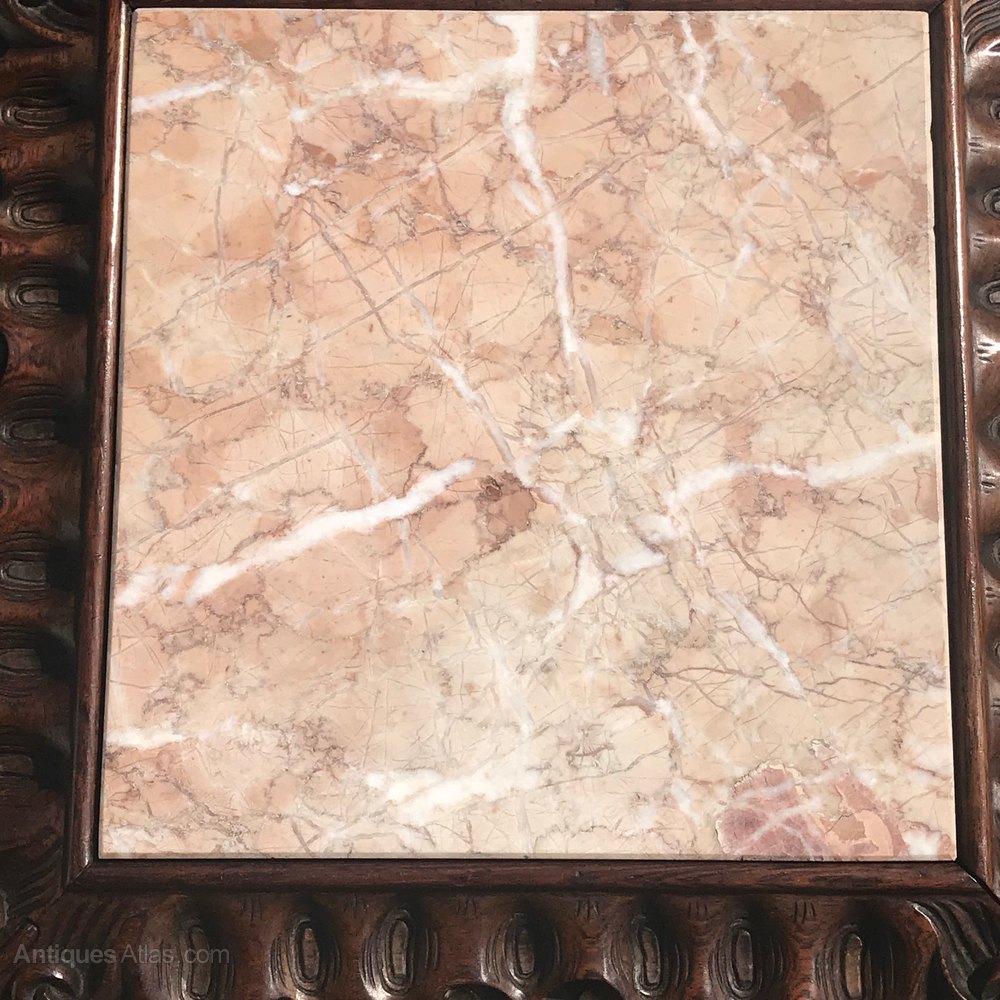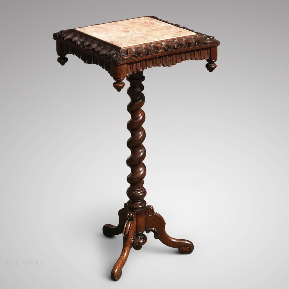 A small 19th Century rosewood lamp table, the pink marble top inset in a deep carved border. The carved frieze has turned corner finials and the table is raised on a twisted pedestal and carved and scrolling tripod base. The condition of this beautiful Victorian table is very good, it stands evenly and firmly making it an ideal lamp or occasional table.