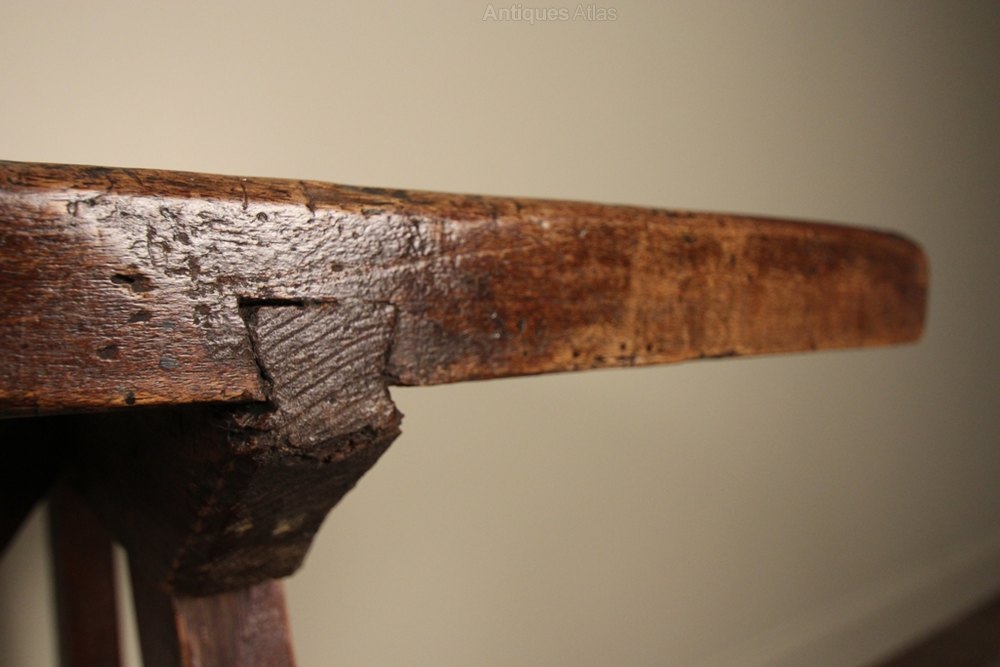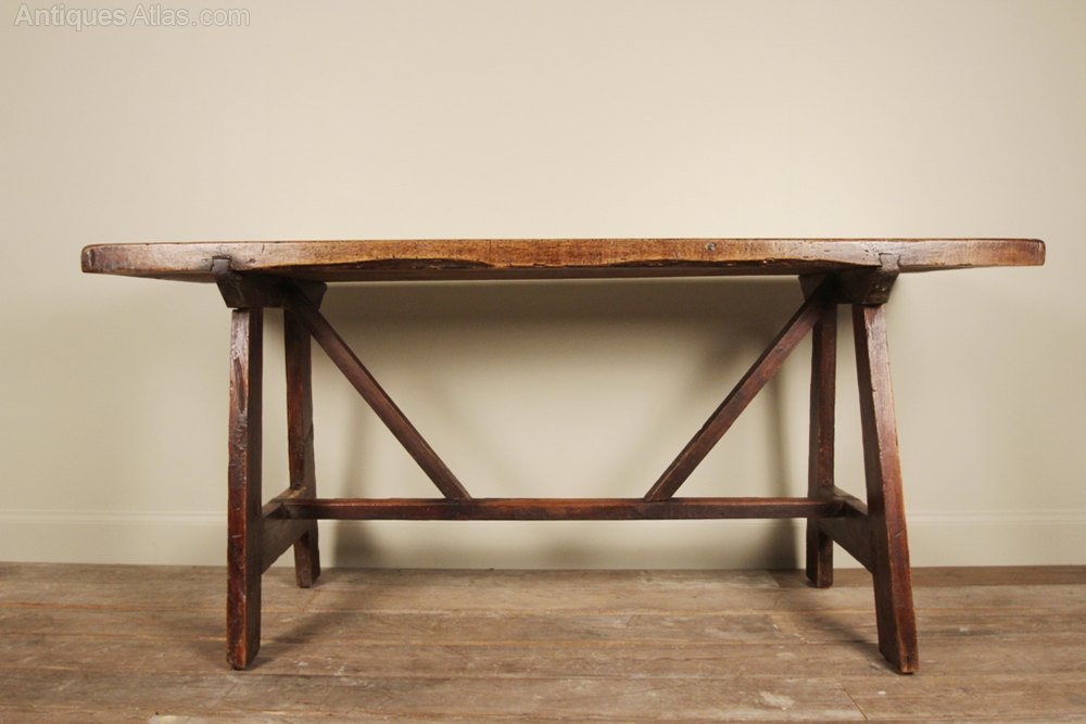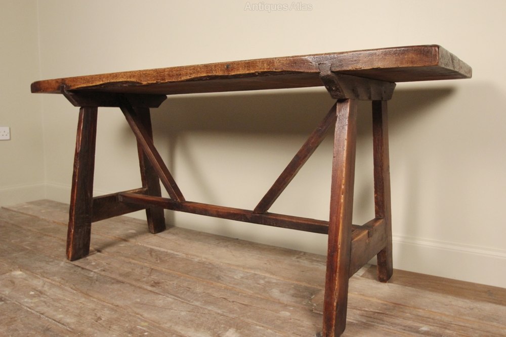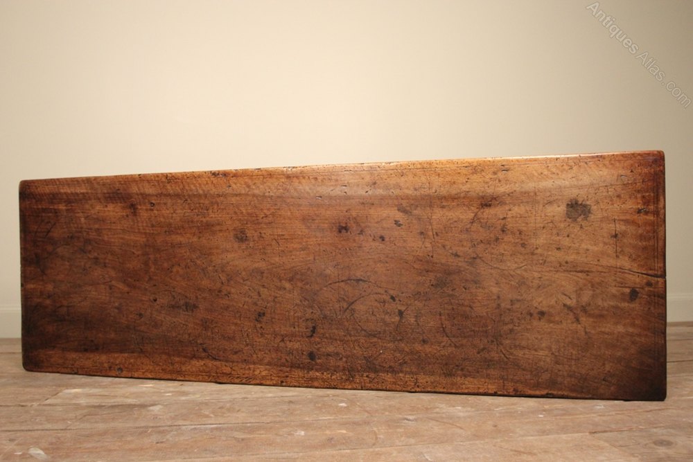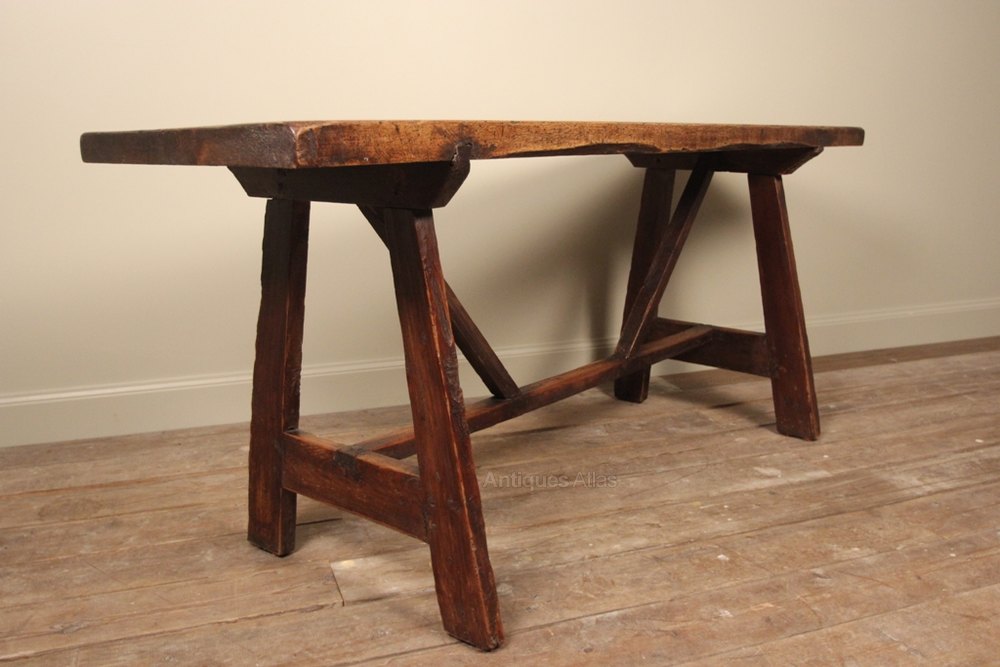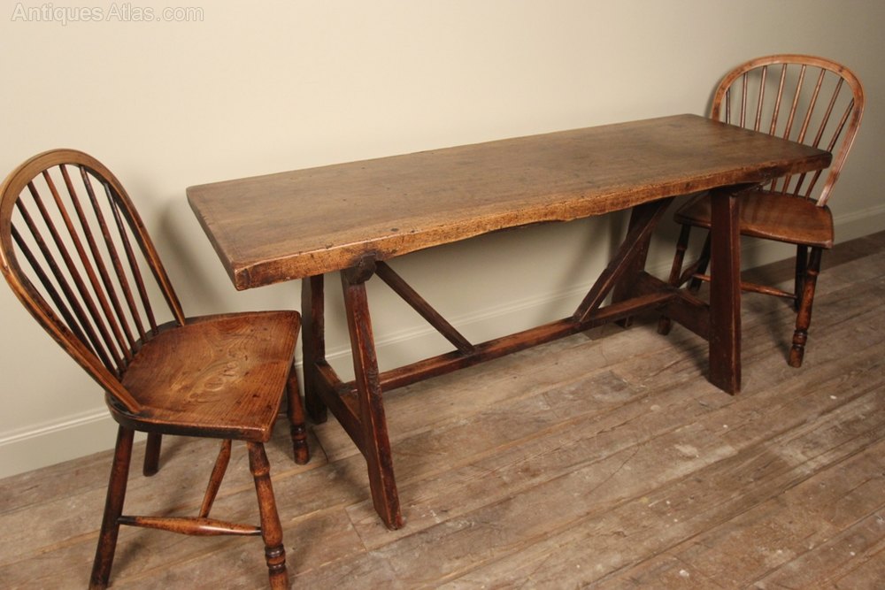 An early 19th century Tavern Table with a wealth of character. Raised on 'A' frame pine supports with adjoined stretcher, the incredible thick top in Walnut. This lovely table with great colour and original finish throughout. Firm standing and versatile.