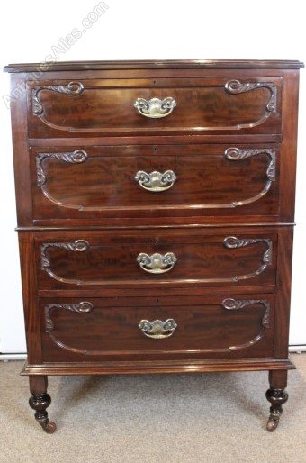 An excellent quality Victorian mahogany chest of drawers with detailed carving to front of drawers. Terminating on turned legs and castors. Four drawers 2 are 16cm deep and 2 are 20cm deep. Mahogany linings to the drawers. Makers label on the back (Edward) Ashton - Rochdale. 81cm at widest point above legs 113cm high at back, 109cm to top of cabinet. 49cm deep.