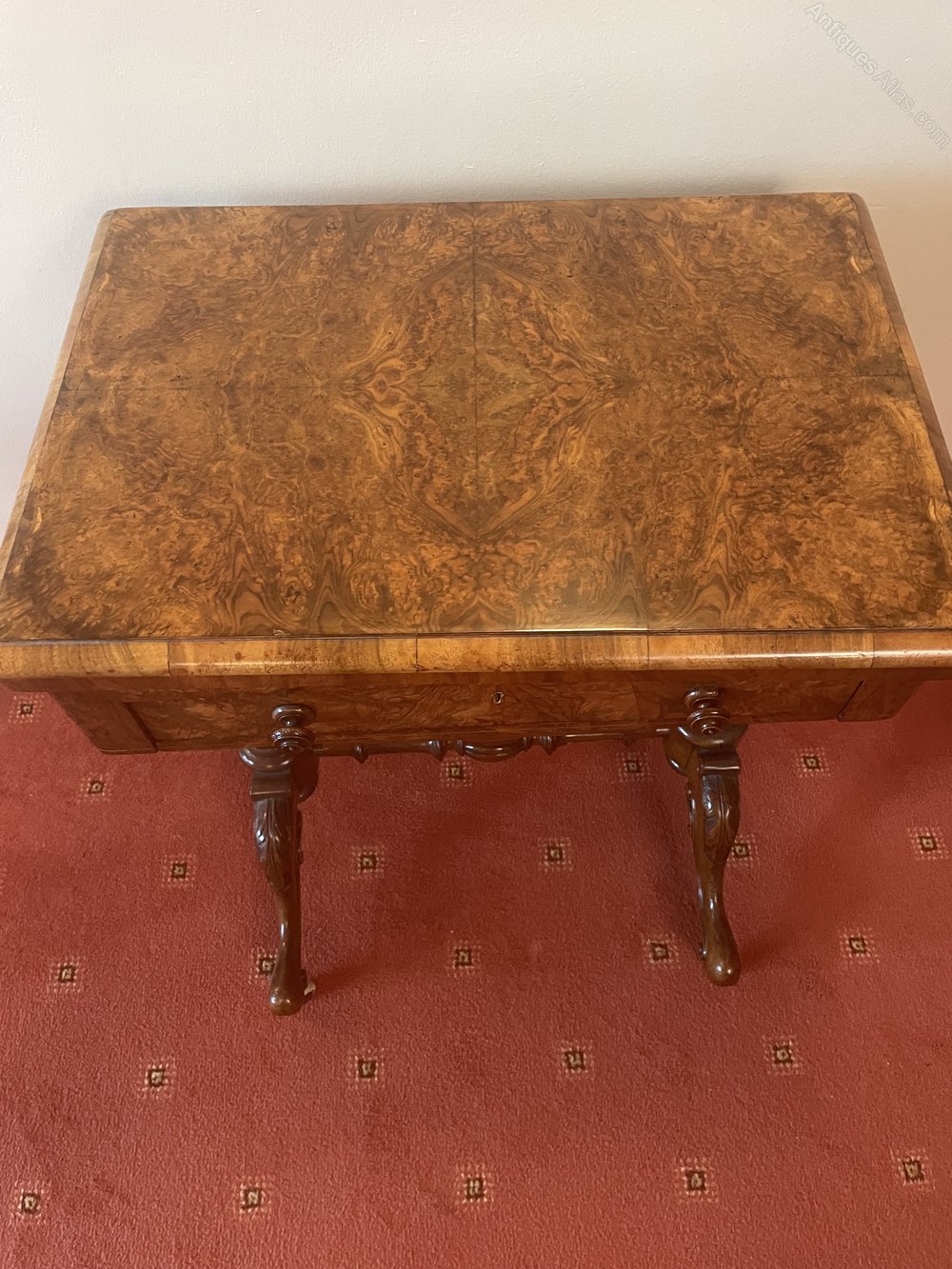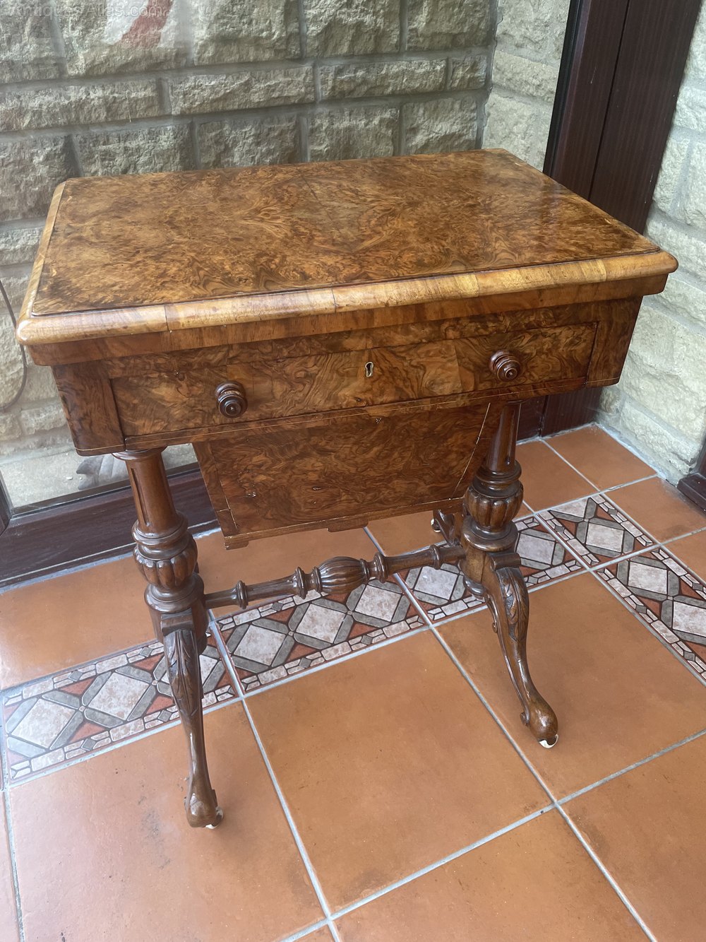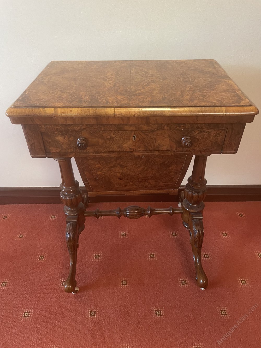 For sale a good quality Victorian Burr Walnut Work Games Table. The top of the table swivels and folds over to reveal a board for chess and back gammon. Below this is a fitted drawer, above a pull out basket. The table has ornately carved legs connected by an intricately carved stretcher. This piece is in very good condition
