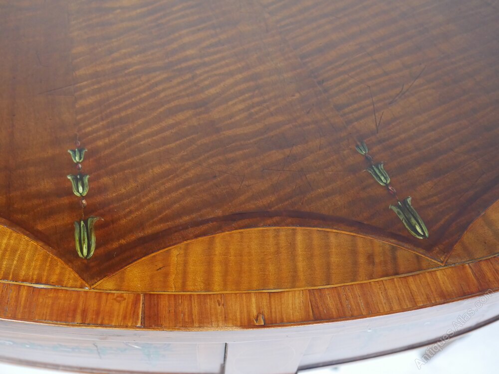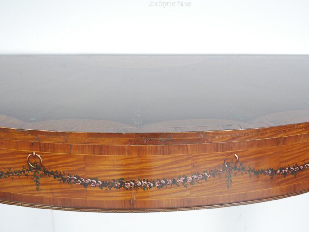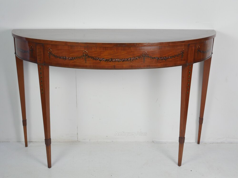 A well designed 19th century Sheraton style mahogany cnsole table, painted decoration and inset yew panel to the top. The table stands on elegant square tapered legs. all in good condition, minor old professional repair to the top, a very pretty table, made around 1880, all ready for use.