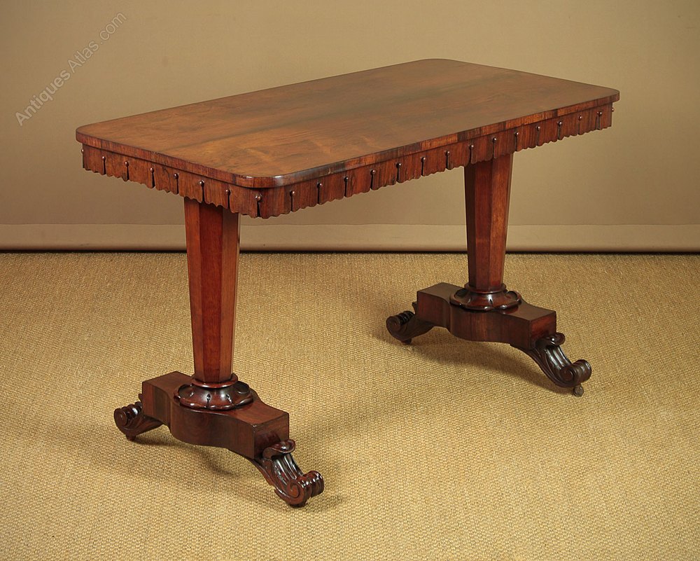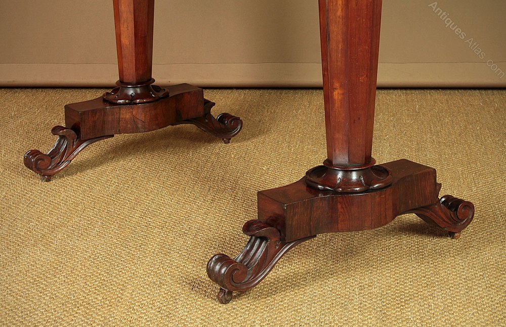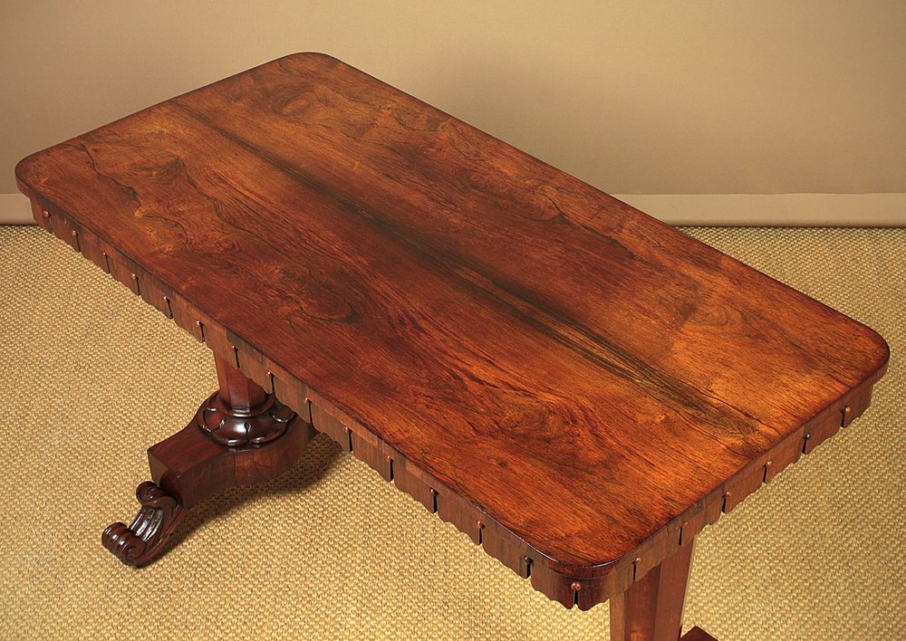 Superb mid 19th.c. rosewood writing or sofa table c.1840. Beautiful top featuring particularly well figured and symmetrically arranged rosewood veneers and crossbanded edge. Unusual shaped apron all the way around, allowing the table to stand freely in a room. Raised on tapering octagonal column legs with crisply carved detail to the bases over long plinths with shaped and carved feet with original castors. Note the lack of a connecting stretcher and the shallow apron allows the table to be used as a writing desk. Excellent colour and condition, cleaned and polished in our workshops.