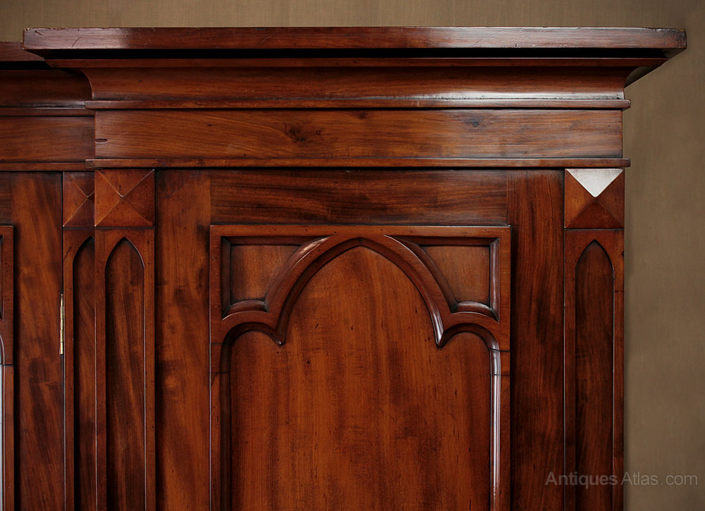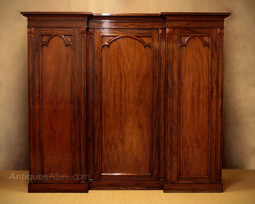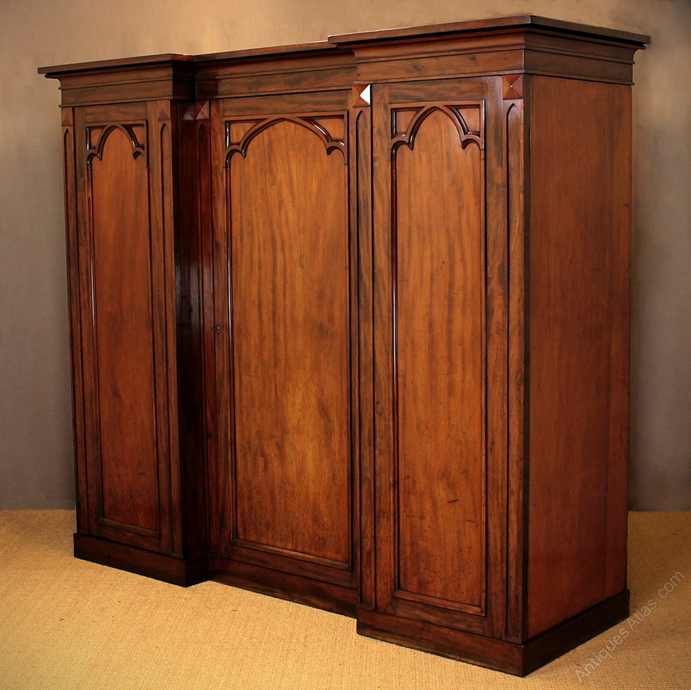 Spectacular mid 19th.c. three door wardrobe and press c.1860. Inverted breakfront design with a flared cornice over three fabulous Gothic arch panel doors with raised mouldings. Hanging rails to the deeper left and right sections whilst the centre is fitted with four shelves of adjustable height. Lovely flame mahogany timbers. Excellent colour and condition, restored, cleaned and polished in our workshops. Key supplied.