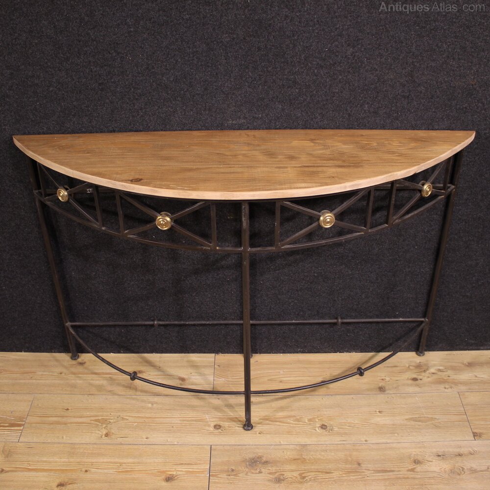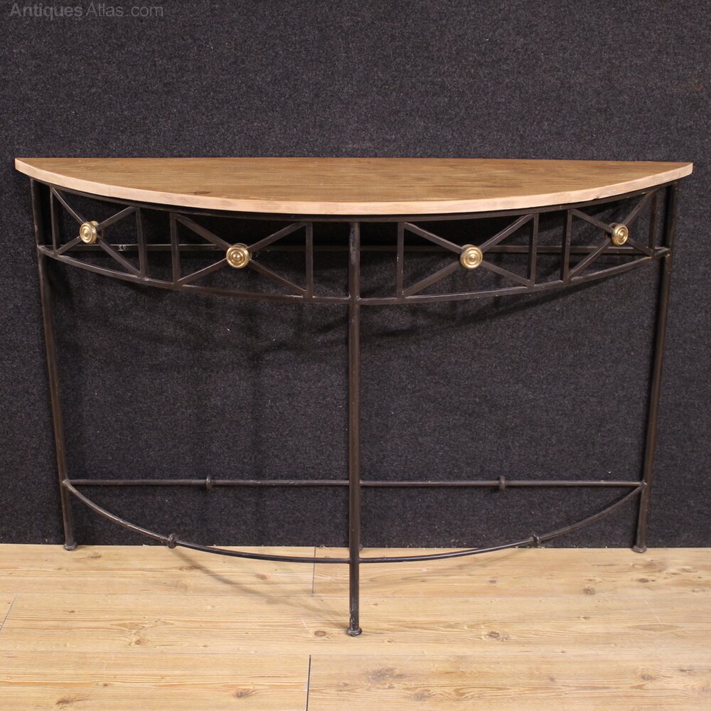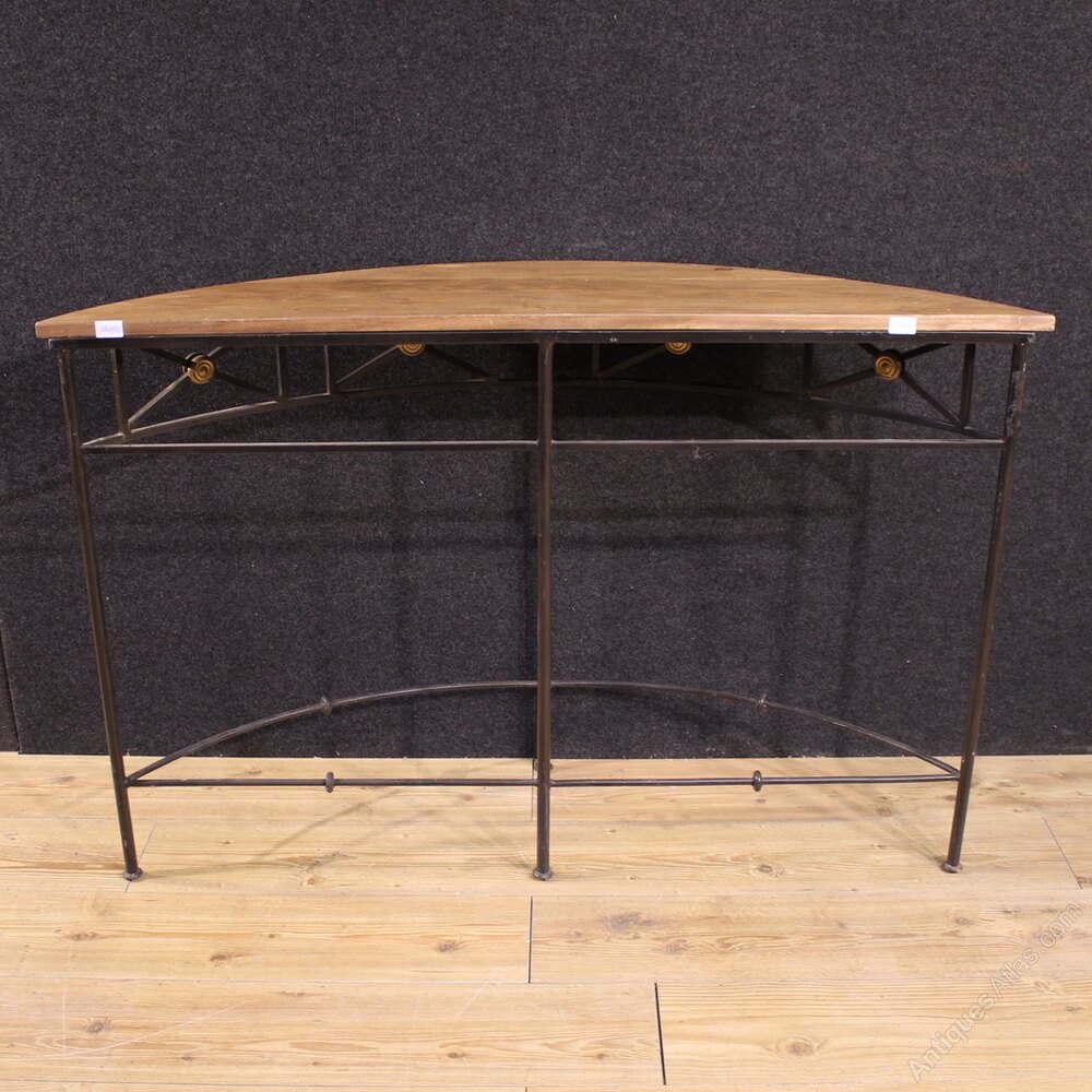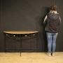 A French half-moon console table from the mid-20th century. A beautifully wrought iron furniture with gilded metal decorations, it features a beautiful design and attractive furnishings. The non-original wooden top, recently replaced during restoration, is of good size and serviceable. A well-proportioned wall console table, it can easily be placed anywhere in the home. It rests on four sturdy, stable legs. The piece of furniture has a beautiful patina, is structurally sound and solid, and is in good condition.
