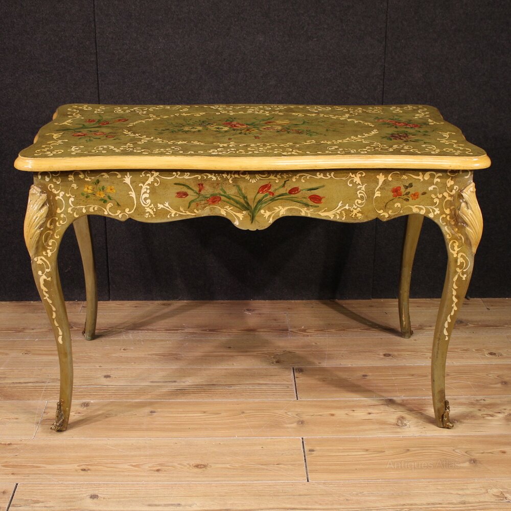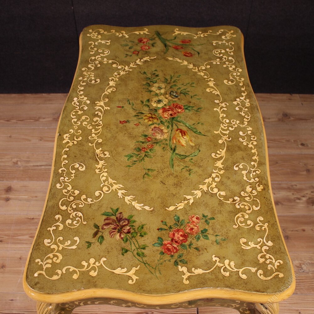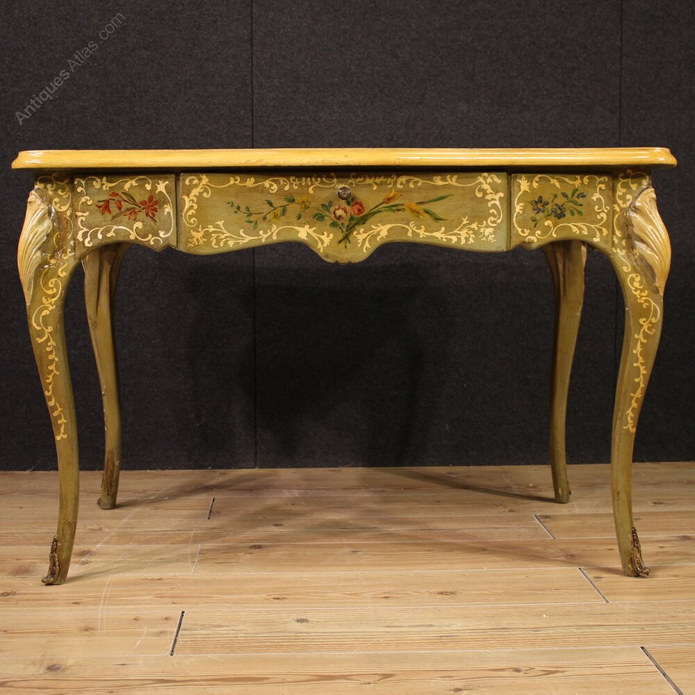 French writing desk from the mid-20th century. Beautifully proportioned and beautifully crafted furniture is crafted from carved, lacquered, and hand-painted wood with floral decorations. Desk finished for the center features a generously sized front drawer and a generously sized wooden top, also suitable for professional use. This elegant writing desk rests on four sturdy, curved legs. The feet are decorated with bronze (see photo). This desk is ideal for a bedroom, living room, or study, and is ideal for antique dealers and interior decorators. In good condition.