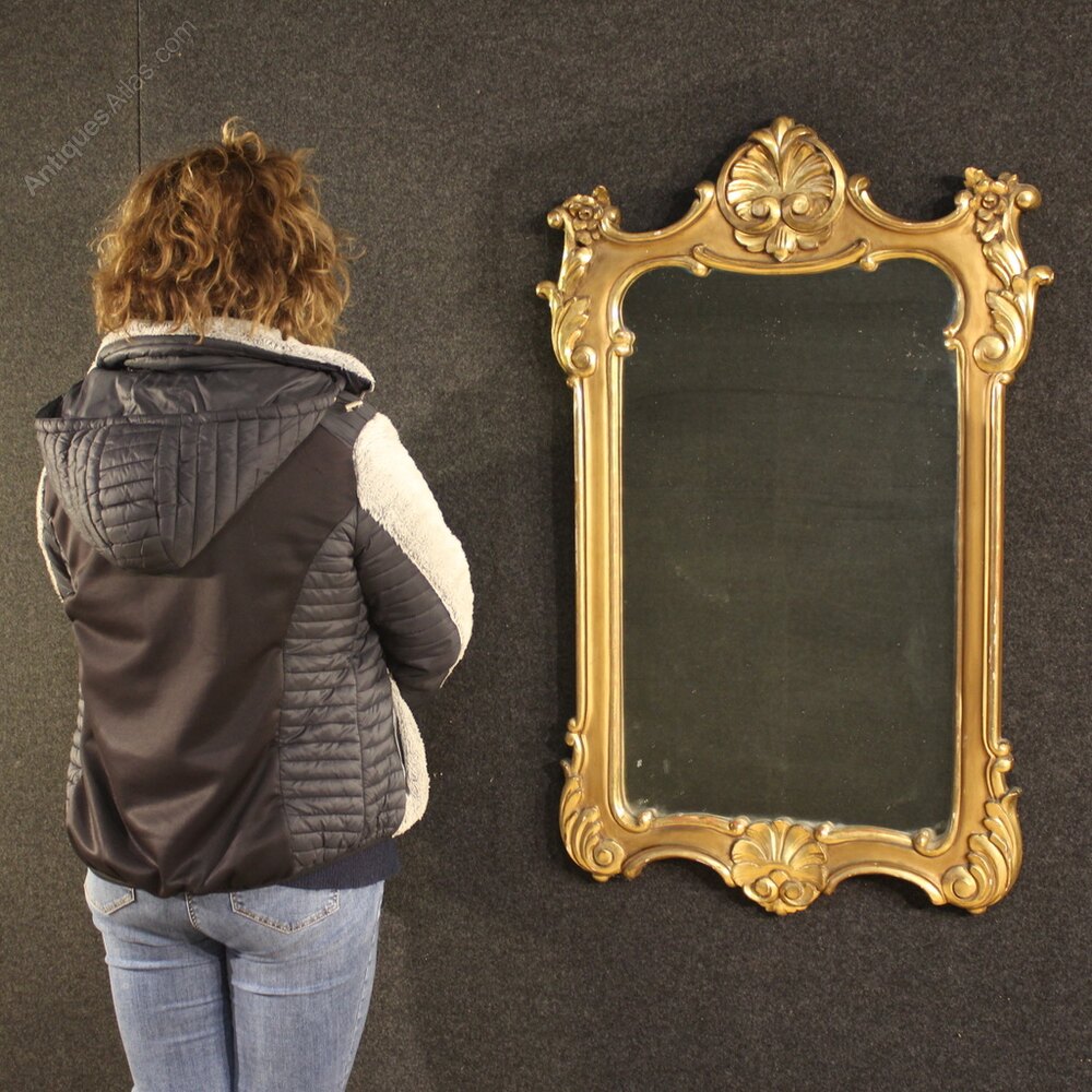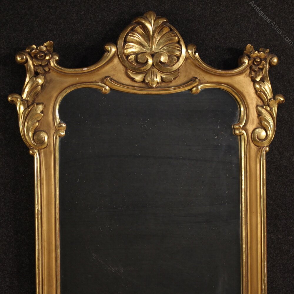 Mid-20th-century Italian mirror. Beautifully proportioned and elegant, antique-style furniture made of finely carved, painted, and gilded wood. The vertical mirror features the original mirror with a few small stains/marks, but is chip-free and perfectly reflective. This furniture can easily be placed anywhere in the home, making it a favorite with antique dealers and interior decorators. Elegantly designed and adorned with attractive floral decorations, it is structurally sound and solid. In good condition.