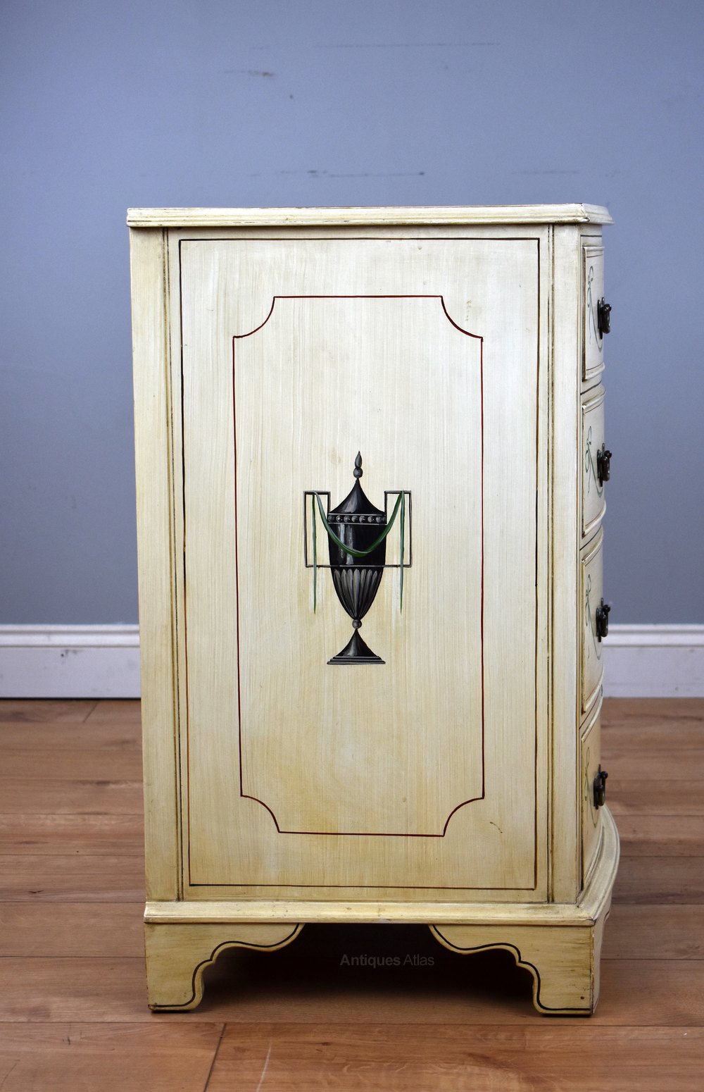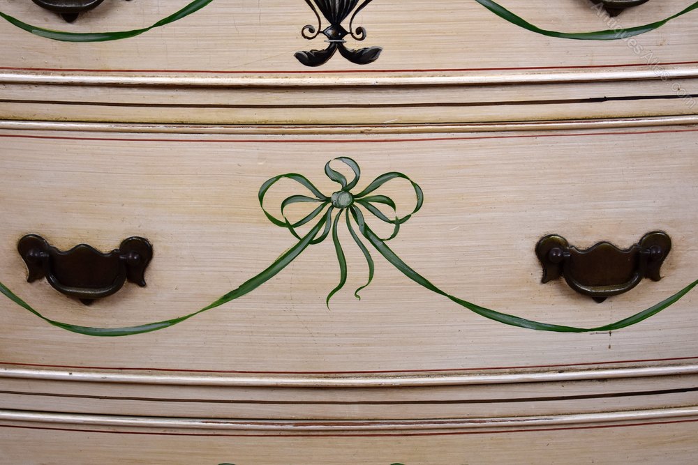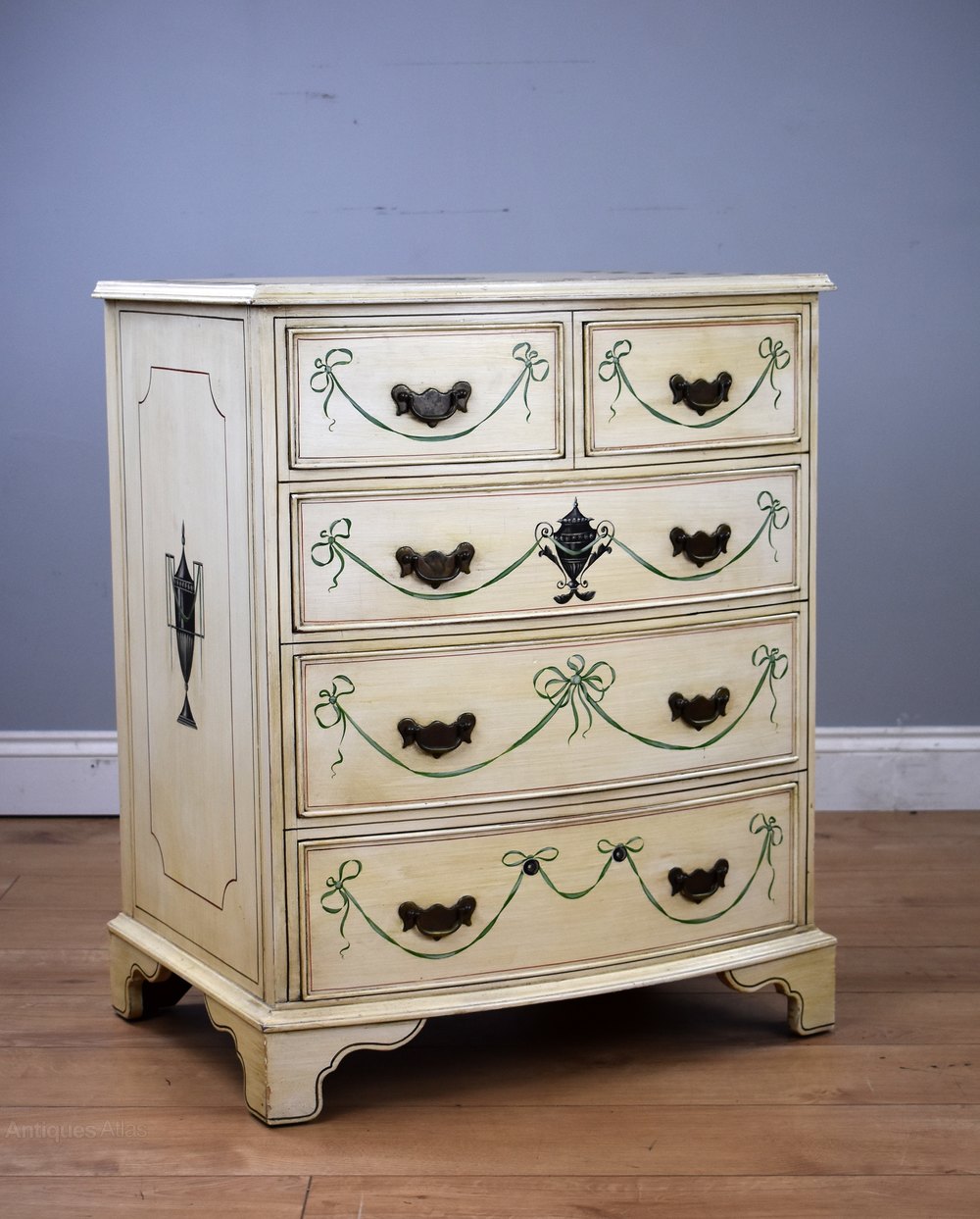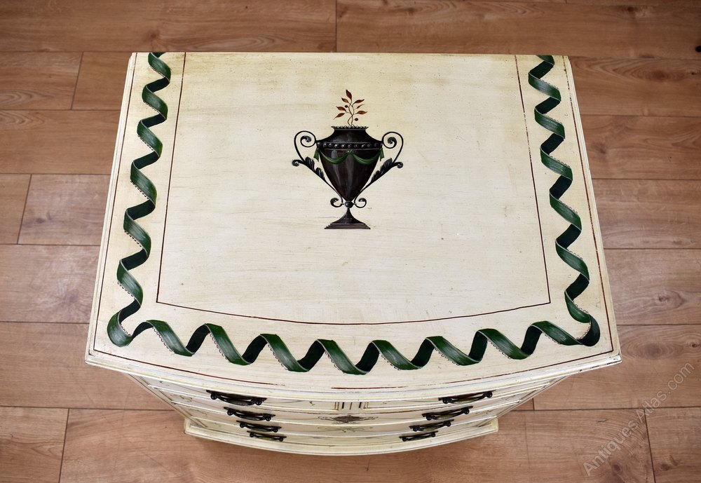 20th century Bow front chest drawers painted and decorated with urns and ribbons. The chest has two short drawers to the top and three long drawers underneath standing on bracket feet.